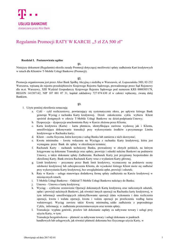 Regulamin Promocji RATY W KARCIE „5 zł ZA 500 zł” Rozdział I. Postanowienia ogólne §1. Niniejszy dokument (Regulamin) określa zasady Promocji dotyczącej możliwości spłaty zadłużenia Kart kredytowych w ratach dla Klientów T-Mobile Usługi Bankowe (Promocji). §2. Promocja organizowana jest przez Alior Bank Spółkę Akcyjną z siedzibą w Warszawie, ul. Łopuszańska 38D, 02-232 Warszawa, wpisaną do rejestru przedsiębiorców Krajowego Rejestru Sądowego, prowadzonego przez Sąd Rejonowy dla m.st. Warszawy, XIII Wydział Gospodarczy Krajowego Rejestru Sądowego pod numerem KRS 0000305178, REGON 141387142, NIP 107 001 07 31, kapitał zakładowy 727 074 630 zł w całości wpłacony, zwaną dalej Bankiem. §3. 1. Użyte poniżej określenia oznaczają: a. Cykl – cykl rozliczeniowy, powtarzający się systematycznie okres, po upływie którego Bank generuje Wyciąg z rachunku Karty kredytowej. Dzień zakończenia cyklu wybiera Klient spośród dostępnych w ofercie T-Mobile Usługi Bankowe na dzień podpisania Umowy; b. Dyspozycja – dyspozycja uruchomienia Raty w Karcie złożona przez Klienta; c. Karta kredytowa (Karta) – karta płatnicza, identyfikująca zarówno wydawcę jak i Klienta, umożliwiająca dokonywanie transakcji przy wykorzystaniu środków z przyznanego Limitu kredytowego w Rachunku karty; d. Klient – osoba fizyczna, która korzysta z usług Banku lub zamierza z nich skorzystać; e. Kwota minimalna – kwota wskazana na Wyciągu z rachunku Karty kredytowej, która jest wymagana przez Bank do spłaty w określonym terminie; f. Rachunek Karty – rachunek techniczny Banku, prowadzony w złotych polskich, na którym księgowane są dokonane Transakcje oraz opłaty, prowizje i odsetki należne Bankowi na podstawie Umowy, a także dokonane spłaty Zadłużenia. Rachunek Karty jest przypisany bezpośrednio do określonej Karty. Bank otwiera Rachunek Karty wraz z wydaniem Karty głównej. g. Limit kredytowy – przyznany przez Bank limit kredytowy, wyznaczony na podstawie oceny zdolności kredytowej lub zabezpieczenia Klienta, do wysokości którego Klient może się zadłużać przy wykorzystaniu Karty kredytowej, bez uwzględniania opłat, prowizji i odsetek; h. Raty w Karcie – usługa stanowiąca dodatkową formę spłaty zadłużenia na Karcie kredytowej w miesięcznych ratach; i. T-Mobile Usługi Bankowe – Oddział T-Mobile Usługi Bankowe należący do Banku; j. Umowa – Umowa o kartę kredytową; k. Wyciąg – cykliczne zestawienie Operacji dokonanych Kartą kredytową oraz naliczonych odsetek, opłat i prowizji należnych Bankowi, jak również innych operacji na Rachunku karty kredytowej, w tym informacji umożliwiających zidentyfikowanie operacji (data wykonania i data rozliczenia operacji, kwota i waluta operacji, kwota i waluta operacji po przeliczeniu według kursu walutowego). Wyciąg zawiera także Kwotę minimalną, saldo zadłużenia z poprzedniego Cyklu, informację o zadłużeniu przeterminowanym oraz termin spłaty. l. Transakcja- wypłata gotówki, przelew lub dokonanie zapłaty za nabywane towary i usługi przy użyciu Karty, w tym: Transakcja bezgotówkowa – płatność za nabywane towary i usługi dokonana w punktach handlowych lub usługowych, jak również płatność dokonana bez fizycznego użycia Karty, w Obowiązuje od dnia 2017-02-01 1 szczególności zamówienia składane pisemnie, telefonicznie lub przez Internet, Transakcja zbliżeniowa – transakcja bezgotówkowa dokonywana przy użyciu Karty wyposażonej w Moduł zbliżeniowy. 2. Pozostałe pojęcia pisane w Regulaminie wielką literą niewyjaśnione powyżej mają znaczenie nadane im w Umowie lub Regulaminie obsługi Produktów T-Mobile Usługi Bankowe. Rozdział II. Zasady Promocji §4. 3. Klient może przystąpić do Promocji w dniach od 01.02.2017 do 30.04.2017 roku (Okres Trwania Promocji). 4. W ramach Promocji Klient uprawniony jest do spłaty zadłużenia powstałego na Karcie, na warunkach opisanych w niniejszym Regulaminie. 5. Do Promocji przystąpić można poprzez złożenie telefonicznej dyspozycji skorzystania z usługi Raty w Karcie oraz akceptację Regulaminu Promocji. 6. W ramach Promocji obowiązują następujące warunki: a. saldo zadłużenia powstałe z tytułu transakcji gotówkowych jak i bezgotówkowych możliwe do spłaty w ramach usługi Raty w Karcie nie będzie niższe niż 100 zł, ale nie większe niż 80% Limitu kredytowego, Wskazana kwota jest rozkładana na raty w ramach usługi Raty w Karcie, a rata doliczana jest do kwoty minimalnej wskazanej na wyciągu. b. minimalna ilość rat wynosi 3, a maksymalna nie może przekroczyć 84, z zastrzeżeniem, że data ostatniej raty może przypadać najpóźniej w miesiącu, w którym Klient kończy 80 rok życia, c. oprocentowanie w ramach usługi Raty w Karcie wynosi 0%, d. prowizja za skorzystanie z usługi Raty w Karcie wynosi 0%, e. opłata miesięczna doliczana do każdej raty wynosi 5 zł za każde rozpoczęte 500 zł spłacane w ramach usługi Raty w Karcie. Opłata naliczana jest od każdej uruchomionej usługi Raty w Karcie do momentu spłaty ostatniej raty. 7. Skorzystanie z usługi Raty w Karcie nie powoduje zwiększenia przyznanego oraz dostępnego Limitu kredytowego. 8. Skorzystanie z usługi Raty w Karcie nie jest możliwe w przypadku wystąpienia opóźnień w spłacie zadłużenia Karty, ani w okresie wypowiedzenia Umowy. 9. Klient ma możliwość skorzystania z usługi Raty w Karcie więcej niż jeden raz, o ile spełnia warunki Promocji określone w niniejszym Regulaminie. 10. Spłata każdej miesięcznej raty zmniejsza zadłużenie w ramach usługi Raty w Karcie oraz powiększa dostępny Limit kredytowy. 11. Klient zobowiązany jest do terminowej spłaty należnych rat. W przypadku nieterminowej spłaty rat Bank będzie naliczał odsetki jak dla zadłużenia przeterminowanego za nieterminową spłatę kredytu zgodnie z Umową. 12. W przypadku wypowiedzenia, rozwiązania, 