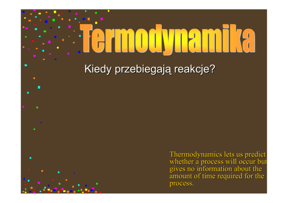 Kiedy przebiegają reakcje? Thermodynamics lets us predict whether a process will occur but gives no information about the amount of time required for the process. Termodynamika dziedzina termodynamiki stan końcowy i początkowy energia dziedzina kinetyki ścieżka reakcji Jak? substraty produkty postęp reakcji Czy? Dlaczego? Procesy samorzutne Procesy samorzutne egzotermiczna ∆Ep CO2(g) + 2H2O(g)+890 kJ produkty kł d Energia potencjalna elektronów w wiązaniach CH4(g) + 2O2(g) → substraty k j Prawo zachowania energii Co stało się z energią wydzieloną przez układ? Jaką formę przybrała energia? Jaki jest kierunek jej przepływu? Procesy samorzutne ? ? ? Film2_NH3+HCl.MOV ? Entropia Jak mierzyć nieuporządkowanie? prawdopodobieństwo rozważmy • Na ile sposobów można ułożyć cztery cząsteczki w dwóch naczyniach? • Jakie jest prawdopodobieństwo, że w naczyniu I znajdzie się określona liczna cząsteczek? • Ile stanów mikro odpowiada jednemu stanowi makro? 3 stany makro I II Entropia Entropia Jak mierzyć nieuporządkowanie? stany makro A B C stany mikro D C B A D B C A B D A D C D A B C B A D A D A C B B C A D B A C D C B D C B D D C C A B A Entropia Entropia Jak mierzyć nieuporządkowanie? Prawdopodobieństwo znalezienia wszystkich cząsteczek w I naczyniu Liczba cząsteczek Prawdopodobieństwo Znalezienia cz. W lewym zbiorniku 1 1 2 2 1 1 ⎛1⎞ 1 ⋅ =⎜ ⎟ = 2 2 ⎝2⎠ 4 4 1 1 1 1 ⎛1⎞ 1 ⋅ ⋅ ⋅ =⎜ ⎟ = 2 2 2 2 ⎝ 2 ⎠ 16 Wniosek: ? ? ? ? 2 4 10 10 proces nie jest samorzutny n 1 ⎛1⎞ ⎜ ⎟ = 1024 ⎝2⎠ n ⎛1⎞ ⎜ ⎟ ⎝2⎠ Entropia Po co nowa funkcja? miara nieuporządkowania 1. 2. Jak mierzyć nieuporządkowanie? Który stan jest najbardziej prawdopodobny? ? ?? ? III zasada termodynamiki Jak obliczyć entropię? entropia kryształu doskonałego w 0 K wynosi 0 S = k·lnW k – stała Boltzmanna W – prawdopodobieństwo termodynamiczne Entropia Entropia Jak mierzyć nieuporządkowanie? rozważmy liczbę stopni swobody translacji Wniosek: Ss<Sl<<Sg ciało stałe ciecz II zasada termodynamiki Jeżeli proces jest samorzutny to całkowita entropia Stot musi rosnąć ∆Stot > 0 Co to jest układ + otoczenie? Jaką formę końcową przybiera energia? II zasada termodynamiki entropia całkowita = entropia układu + entropia otoczenia Stot = Su + Sot ∆Stot > O ∆Stot = ∆Su + ∆Sot >0 II zasada termodynamiki Przykład 1 H2O(c) → H2O(g) 1 Układ 2 1 mol 1 mol 25oC 100oC V1<V2 l. współrzędnych cząsteczek większa 3 1 mol → 18 g → 18 cm 1 mol → 18 g → V=? Otoczenie ∆Su>O J ⋅ ⋅ 373K 1 mol 8 . 31 oddaje ciepnRT ło Q ⋅ mol K V= = = energia kinetyczna cz101300 ąsteczek p Pa maleje J Nm ∆Sot<O = 0.03059 ≈ 0.031 = = m3 N Pa m2 II zasada termodynamiki otoczenie otoczenie układ ∆H<0 układ ∆H>0 Q ∆Sot>0 Q ∆Sot<0 Q ∆H < 0 ⇒ ∆Sot = T Q ∆H > 0 ⇒ ∆Sot = − T ∆H ∆Sot = − T II zasada termodynamiki Jak wyrazić II zasadę z punktu widzenia układu? Jak przewidywać samorzutność reakcji? nowa funkcja energii – entalpia swobodna G = H - TS dla T=const i p=const ∆G = ∆H - T∆S < 0 II zasada termodynamiki Jak wyrazić II zasadę z punktu widzenia układu? Jak przewidywać samorzutność reakcji? ∆Stot > O samorzutność ∆Stot = ∆Sot + ∆Su >0 ∆G = ∆H - T∆S < 0 Proces samorzutny gdy ∆G<0 II zasada termodynamiki Jak wyrazić II zasadę z punktu widzenia układu? Jak przewidywać samorzutność reakcji? Reacja samorzutna gdy ∆G<0 Wartości ∆H i ∆S (układu) a samorzutność ∆G = ∆H - T∆S nie samorzutny samorzutny Wartości ∆H i ∆S a samorzutność ∆H ∆S − + samorzutna dla wszystkich T + + samorzutna w wysokich T − − samorzutna w niskich T + − nigdy nie samorzutna Reakcja Entalpia swobodna reakcji Jak liczyć entalpię swobodną reakcji? w warunkach standardowych ∆G° = Σnp∆Gf°(produkty) - Σnr ∆Gf°(substraty) standard free energy change that occurs if reactants in their standard state are converted to products in their standard state. Entalpia swobodna reakcji Jak liczyć entalpię swobodną reakcji? ∆G = ∆G° + RT ln(Q) Q = równoważnik reakcji aA + bB → cC + dD [C ] [ D ] Q= [ A] [ B ] c 0 a 0 d 0 b 0 Entalpia swobodna reakcji Przykład 2 egzotermiczna ∆Ep CO2(g) + 2H2O(g)+890 kJ produkty kł d Energia potencjalna elektronów w wiązaniach CH4(g) + 2O2(g) → substraty k j W stanie standardowym? ∆G° = ∆G°(CO2) + 2∆G°(H2O) – [∆G°(CH4) + 2 ∆G°(O2)] -394.359 + 2(-228.572) - [-50.720 + 2(0)] = -800.783 kJ W innych stanach? Procesy odwracalne odwracalne ii nieodwracalne nieodwracalne Procesy Odwracalny: kierunek można odwrócić poprzez nieskończenie małą zmianę wartości jednej lub więcej zmiennych stanu termodynamicznego. Procesy odwracalne zachodzą bez żadnej produkcji entropii, tzn. suma entropii układu i otoczenia jest stała • jeżeli weźmiemy gaz w cylindrze, zauważymy, że kwazistatyczne rozprężanie tego gazu związane jest z wykonaniem pracy i oddaniem ciepła. Jeśli jesteśmy w stanie przywrócić warunki początkowe przez dodanie dokładnie tej samej ilości ciepła, oraz wykonanie tej samej pracy, to gaz w cylindrze możemy sprężyć do warunków początkowych. Można więc powiedzieć, że proces kwasistatyczny jest procesem odwracalnym. • proces odwracalny jest to taki proces, po zajściu którego można przywrócić warunki początkowe tylko przez narzucenie warunku ograniczającego usuniętego na początku procesu. Procesy zachodzące w przyrodzie są nieodwracalne – (praca pożytkowana jest na ciepło) Entalpia swobodna – sens fizyczny A A B B C (a) (b) a) ∆G° <0, proces zmierza w określonym kierunku b) Stan równowagi osiągnięty gdy ∆G° =0 Entalpia swobodna w stanie równowagi ∆G = 0 A ∆G° + RT ln(Q)=O A B B C (a) (b) wówczas ∆G°= - RT ln(K) K = stała równowagi a) ∆G° <0, proces zmierza w określonym kierunku b) Stan równowagi osiągnięty gdy ∆G° 