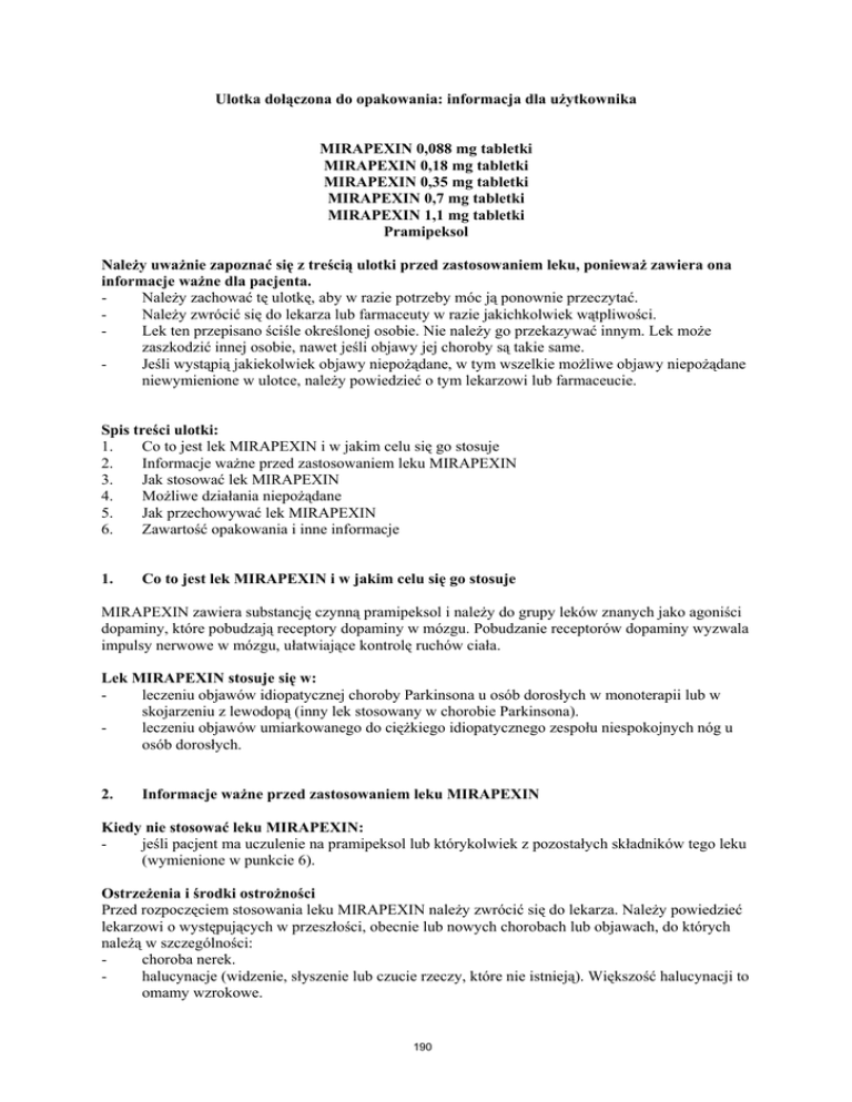 Informacje ważne przed zastosowaniem leku MIRAPEXIN