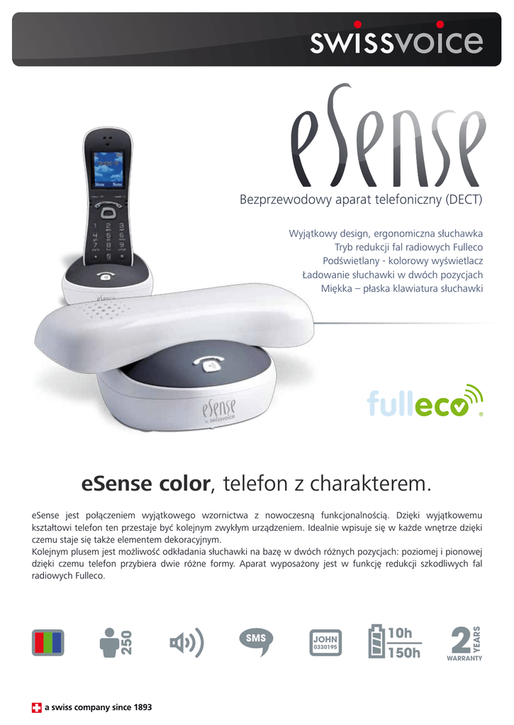 Bezprzewodowy aparat telefoniczny (DECT) Wyjątkowy design, ergonomiczna słuchawka Tryb redukcji fal radiowych Fulleco Podświetlany - kolorowy wyświetlacz Ładowanie słuchawki w dwóch pozycjach Miękka – płaska klawiatura słuchawki eSense color, telefon z charakterem. JOHN 0330195 10h 150h 2 YEARS 250 eSense jest połączeniem wyjątkowego wzornictwa z nowoczesną funkcjonalnością. Dzięki wyjątkowemu kształtowi telefon ten przestaje być kolejnym zwykłym urządzeniem. Idealnie wpisuje się w każde wnętrze dzięki czemu staje się także elementem dekoracyjnym. Kolejnym plusem jest możliwość odkładania słuchawki na bazę w dwóch różnych pozycjach: poziomej i pionowej dzięki czemu telefon przybiera dwie różne formy. Aparat wyposażony jest w funkcję redukcji szkodliwych fal radiowych Fulleco. WARRANTY Bezprzewodowy aparat telefoniczny (DECT) Główne cechy Wyświetlacz Tryb głośnomówiący Fulleco kolorowy, podświetlany, 1.8 cala , 128x160 65k kolorów w słuchawce redukcja oddziaływania fal radiowych, zmniejszony pobór energii Cechy dodatkowe Alarm Głośność Melodie Blokada Dyskrecja Przyjmowanie połączenia Ładowanie Nazwy Przywołanie funkcja budzika i przypomnienia regulowana głośność rozmowy i trybu głośnomówiącego (5 poziomów) 20 melodii HiFi, możliwość wyciszenia i regulacji głośności zabezpieczenie klawiatury przed przypadkowym wciśnięciem możliwość wyciszenia mikrofonu poprzez podniesienie słuchawki z widełek lub poprzez klawisz dwa sposoby ładowania: poziomy i pionowy nadawanie własnych nazw słuchawkom klawisz przywołania słuchawki na bazie (funkcja lokalizacji) Książka telefoniczna i listy połączeń Książka telefoniczna CLIP/CNIP Ponowny wybór Czas połączeń Wybieranie Połączenia wewnętrzne Konferencja na 250 wpisów prezentacja numeru i nazwy dzwoniącego* lista ostatnio wybieranych numerów (20) czas trwania rozmowy widoczny na wyświetlaczu wprowadzanie numeru przed uzyskaniem sygnału między słuchawkami, przełączanie rozmów możliwość konferencji, 2 wewnętrzne – 1 zewnętrzny SMS Wiadomości Wysyłanie i odbieranie wiadomości SMS (612 znaków)* Dane sieciowe Typ sieci Tryb wybierania telefon przeznaczony na sieć analogową pulsowy i tonowy Dane techniczne Rozbudowa Energia Standard Akumulator Czas rozmów Zasięg Gwarancja do 5 słuchawek, do 4 baz niskie zużycie energii, funkcja Fulleco linie PSTN, DECT/GAP Lithium-ion (3.7 V, 550 mAh) do 10 godzin rozmowy, do 120 godzin czuwania na otwartej przestrzeni do 300 m, wewnątrz do 50 m 2 lata, różne języki Menu Dane logistyczne** Kod produktu eSense White FR eSense White CH eSense White EE eSense White DE eSense White HK/SG 20406256 20406257 20406286 20406258 20406259 Kolor Czarny/Biały Czarny/Biały Czarny/Biały Czarny/Biały Czarny/Biały EAN 7611425120841 7611425992561 7611425992585 7611425013310 7611425240051 Nazwa produktu eSense Opakowanie 10 szt./karton Wymiary opakowania 339 x 306 x 230 mm Wymiary produktu 200 x 144 x 63 mm * Jeżeli operator telefoniczny oferuje taką usługę ** Dostępność produktu w zależności od kraju Twój partner sprzedaży: swissvoice SA Chemin des Mûriers 1 CH-1170 Aubonne Tel : +41 21 821 39 39 Fax : +41 21 808 39 35 [email protected] www.swissvoice.net Zastrzegamy możliwość zmian / Dostępność produktu w zależności od kraju.