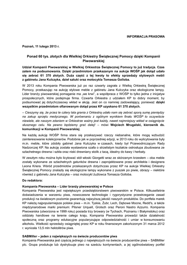 INFORMACJA PRASOWA Poznań, 11 lutego 2013 r. Ponad 60 tys. złotych dla Wielkiej Orkiestry Świątecznej Pomocy dzięki Kompanii Piwowarskiej Udział Kompanii Piwowarskiej w Wielkiej Orkiestrze Świątecznej Pomocy to już tradycja. Czas zatem na podsumowania. Dzięki przedmiotom przekazanym na aukcje WOŚP jak dotąd udało się zebrać 61 370 złotych. Duża część z tej kwoty to efekty sprzedaży stylowych mebli z gabinetu Jana Kulczyka, dzieł sztuki oraz motocykla Tomasza Golloba. W 2013 roku Kompania Piwowarska już po raz czwarty zagrała z Wielką Orkiestrą Świątecznej Pomocy, przekazując na aukcję stylowe meble z gabinetu Jana Kulczyka oraz ekologiczne lampy. Lider branży piwowarskiej pomaganie ma „we krwi”, a współpraca z WOŚP to tylko jedna z inicjatyw prospołecznych, które podejmuje firma. Czwarta Orkiestra z udziałem KP to dobry moment, by podsumować jej dotychczasowy wkład w akcję. Jest on co namniej zadowalający, ponieważ dzięki wszystkim przedmiotom ofiarowanym dotąd przez KP uzyskano 61 370 złotych. – Cieszymy się, że przez te cztery lata grania z Orkiestrą udało nam się zebrać sporą sumę pieniędzy na zakup sprzętu medycznego. W porównaniu z ogólnym wynikiem finału WOŚP to oczywiście niewiele, ale naszym zdaniem w Orkiestrze ważny jest każdy, nawet najmniejszy wkład w osiągnięcie słusznego celu. Na pewno będziemy grać dalej! – mówi Wojciech Mrugalski, kierownik ds. komunikacji w Kompanii Piwowarskiej. Na każdą aukcję WOŚP firma stara się przekazywać rzeczy niebanalne, które mogą wzbudzić zainteresowanie kolekcjonerów. Podobnie jak w poprzedniej edycji, w 2013 roku do wylicytowania były m.in. meble, które zdobiły gabinet Jana Kulczyka w czasach, kiedy był Przewodniczącym Rady Nadzorczej KP. Na aukcję została wystawiona szafa o strzelistym kształcie ostrosłupa zbudowana ze szlachetnego drewna i szkła oraz niski drewniany stolik z tacą, idealny do kawy i herbaty. W zeszłym roku można było licytować stół włoski Giorgetti wraz ze skórzanym krzesłem – oba meble zostały wykonane ze szlachetnych gatunków drewna i zaprojektowane przez architekta i designera Leona Kriera. Wśród przedmiotów przekazanych dotychczas przez KP na aukcje Wielkiej Orkiestry Świątecznej Pomocy znalazły się ekologiczne lampy wykonane z puszek po piwie, obrazy – niektóre również z gabinetu Jana Kulczyka – oraz motocykl żużlowca Tomasza Golloba. Do redaktora: Kompania Piwowarska – Lider branży piwowarskiej w Polsce Kompania Piwowarska jest największym przedsiębiorstwem piwowarskim w Polsce. Kilkusetletnie doświadczenia w warzeniu piwa, nowoczesne technologie i rygorystyczne przestrzeganie zasad produkcji na światowym poziomie gwarantują najwyższą jakość naszych produktów. Do portfela marek KP należą najpopularniejsze polskie piwa – m.in. Tyskie, Żubr, Lech, Dębowe Mocne, Redd's, a także międzynarodowe marki premium: Pilsner Urquell, Grolsch oraz Peroni Nastro Azzurro. Kompania Piwowarska (utworzona w 1999 roku) posiada trzy browary (w Tychach, Poznaniu i Białymstoku) oraz oddziały handlowe na terenie całego kraju. Kompania Piwowarska prowadzi także działalność społeczną oraz programy edukacyjne popularyzujące odpowiedzialność i umiar w konsumowaniu alkoholu. Wielkość sprzedaży osiągniętej przez KP w roku finansowym zakończonym 31 marca 2012 r. wyniosła 13,5 mln hektolitrów piwa. SABMiller – jeden z największych na świecie producentów piwa Kompania Piwowarska jest częścią jednego z największych na świecie producentów piwa – SABMiller plc. Grupa produkuje lub dystrybuuje piwo na sześciu kontynentach, a jej ogólnoświatowy portfel obejmuje międzynarodowe piwa premium, takie jak Grolsch, Miller Genuine Draft, Peroni Nastro Azzurro czy Pilsner Urquell oraz czołowe marki lokalne, takie jak Aquila, Castle, Miller Lite, Snow czy Tyskie. SABMiller jest jedną z największych na świecie (poza USA) firm rozlewających produkty CocaColi. W roku finansowym zakończonym 31 marca 2012 SABMiller osiągnął przychody w wysokości 31,4 mld USD oraz wypracował zysk brutto (EBITA) w wysokości 5,6 mld USD. SABMiller plc jest notowany na giełdach papierów wartościowych w Londynie i Johannesburgu. Dodatkowych informacji udzielają: Wojciech Mrugalski kierownik ds. komunikacji Kompania Piwowarska SA [email protected] ul. Szwajcarska 11, 61-285 Poznań tel. + 48 61 667 7667 tel. kom. + 48 601 91 11 44 fax + 48 61 667 7850 www.kp.pl Klaudyna Polanowska-Skrzypek specjalista ds. public relations Kompania Piwowarska SA [email protected] ul. Szwajcarska 11, 61-285 Poznań tel. + 48 61 667 7473 tel. kom. + 48 695 592 926 fax + 48 61 667 7850 www.kp.pl