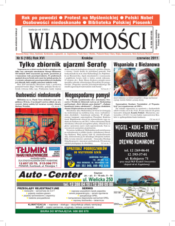 Egzemplarz bezpłatny Przekaż dalej! WIADOMOŚCI tradycja od 1995 r. PL ISSN 1507-6105 www.wiadomosci.krakow.pl Rok po powodzi l Protest na Myślenickiej l Polski Nobel Osobowości niedoskonałe l Biblioteka Polskiej Piosenki Bieżanów Nowy i Stary, Kozłówek, Kurdwanów, Łagiewniki, os. Cegielniana, Piaski Nowe i Wielkie, Prokocim Nowy i Stary, Rżąka, Swoszowice, Wola Duchacka Wschód i Zachód Nr 6 (185) Rok XVI Kraków Tylko zbiornik ujarzmi Serafę Niepozorna na co dzień rzeczka Serafa w ubiegłym roku kilka razy zatrwożyła mieszkańców Starego Bieżanowa. Od tamtych chwil oczyszczono jej koryto, poszerzono je i wzmocniono wały przeciwpowodziowe. Po gwałtownych opadach deszczu Serafa znów może być jednak groźna, bo w systemie zabezpieczeń przeciwpowodziowych niezbędny jest zbiornik, który mógłby zatrzymać nadmiar wody. Rok 2010 mieszkańcy Bieżanowa będą z pewnością pamiętali bardzo długo. Niewielka, spokojna Serafa wylewała wówczas kilka razy. Praktycznie każdy większy tłumiki haki Holownicze PIOMAR hurt detal serwis mechanika ogólna dla stałych klientów karty rabatowe 12 657 23 75, 513 096 771 PIOMAR, Kozłówek, ul. Polonijna 1 We wrześniu i październiku ub.r. mieszkańcy Swoszowic i Wróblowic blokowali ruch na ul. Myślenickiej pod hasłami: „Dość obietnic, pora działać!”, „Żądamy kanalizacji, koniec odwlekania!”, „Żądamy chodników, chcemy bezpieczeństwa na naszej ulicy!” Mieszkańcy ulicy Myślenickiej od wielu lat domagają się modernizacji tej ruchliwej trasy, wraz z wybudowaniem chodników i kanalizacji sanitarnej. W ubiegłorocznej kampanii samorządowej Prezydent Krakowa Jacek Majchrowski obiecał im wprowadzenie tego zadania do budżetu na rok 2011. I słowa dotrzymał. Kiedy mieszkańcy zobaczyli szczegółowe plany, chwycili się za głowy i ponownie część z nich zaprotestowała. Tym razem przeciw pomysłom projektantów. Na zawsze ruchliwej ul. Myślenickiej ruch wzrósł jeszcze po wybudowaniu w pobliżu zjazdu z południowej obwodnicy Krakowa. Pilną sprawą stało się zmodernizowanie ulicy, dostosowanie jej do aktualnego obciążenia ruchem. Kilka la temu inwestor autostrady – Generalna Dyrekcja Dróg Krajowych i Autostrad, przebudowała 250-metrowy odcinek przylegający do obwodnicy. Cd. na str. 3 Sprzedaż podręczników do wszystkich szkół Zamówienia przyjmuje F.H. „Ma-Gra” s.c. Wola Duchacka, ul. Białoruska 10B 601 351 048, 889 643 516 Czynne: pn. – pt.: 8 – 18 sob.: 8 – 14 ul. Wielicka 250 PRZEGLĄDY REJESTRACYJNE u motocykle – samochody do 3,5 T u pojazdy zasilane gazem u pojazdy sprowadzone z zagranicy u badania powypadkowe Wspaniała z Bieżanowa deszcz oznaczał podtopienia leżących w pobliżu domów, a wiosną i latem doszło do prawdziwej powodzi. Pod wodą znalazły się m.in. ulice Sucharskiego, ks. Popiełuszki czy Bieżanowska. Apele mieszkańców o oczyszczenie i pogłębienie koryta rzeki w końcu zostały usłyszane. 25 sierpnia ub.r. Rada Miasta Krakowa przyjęła nawet specjalną uchwałę zobowiązującą Prezydenta do przygotowania „Programu systemu przeciwpowodziowego dla osiedli zagrożonych wylewaniem rzeki Serafy”. Cd na str. 3 Osobowości niedoskonałe Niegospodarny pomysł Biblioteka na os. Piaski Nowe obchodzi w tym roku jubileusz 30-lecia. Z tej okazji 8 czerwca odbyła się uroczystość, której ozdobą był wernisaż wystawy obrazów Barbary Woźniak. Cd. na str. 7 czerwiec 2011 tel. 12 288 04 10 i 12 288 05 00 SERWIS u naprawa wszystkich marek pojazdów u serwis pogwarancyjny – serwis ogumienia u specjalizacja OPEL u komputerowa diagnostyka samochód OPEL u naprawy blacharsko – lakiernicze KLIMATYZACJA – naprawa – obsługa – dezynfekcja układu wentylacji SKLEP – części zamienne, oryginały i tańsze zamienniki Biura do wynajęcia: 600 880 870 Dzień Indianina na kolonii (wspólnie z drugą wychowawczynią). Kamila Pokład z prawej strony. Samorządowy Konkurs Nastolatków „8 Wspaniałych” jest organizowany od 1995 r. Do udziału zapraszani są uczniowie z krakowskich szkół w wieku od 14 do 19 lat. W tym roku do ich grona laureatów dołączyła Kamila Pokład z Bieżanowa, maturzystka z 28 LO. I to ona będzie reprezentować Kraków w ogólnopolskim finale konkursu. Cd. na str. 6 WĘGIEL – KOKS – BRYKIET EKOGROSZEK DREWNO KOMINKOWE tel. 12 /269-06-01 12 /393-57-01 ul. Kolejarzy 71 – przy stacji PKP Kraków Swoszowice (dojazd od ul. Kąpielowej) 2 WIADOMOŚCI Nr 6 Czerwiec 2011 130-letnia kapliczka Polski Nobel dla prof. Grabskiego Czytelnik informuje, że na jego posesji przy ul. Kosocickiej 30 znajduje się historyczna kapliczka wotywna Gminy Rżąka z roku 1881 – ma więc okrągłe 130 lat! – która mogłaby doczekać się z tej okazji należnej konserwacji. Mieszkaniec wyjaśnił, że od lat wielokrotnie zgłaszał się z tym postulatem do Rady Dzielnicy XII – jednak bez rezultatu. Jak się dowiedzieliśmy, wymiana pism z Małopolskim Wojewódzkim oraz Miejskim Konserwatorem Zabytków a Radą Dzielnicy XII trwa w tej sprawie od 2009 r. – Odpowiedziano nam, że „kapliczka jest ujęta w gminnej ewidencji zabytków, znajduje się na terenie prywatnym i na właścicielu posesji spoczywa obowiązek utrzymywania w należytym stanie zabytkowego obiektu”. Podano przy tym, że „obiekt kwalifikuje się do konserwacji i zostanie wpisany na listę oczekujących”, trudno jest jednak określić termin realizacji zadania z uwagi na ograniczone środki finansowe – poinformowano nas w biurze Rady Dzielnicy. W cytowanym piśmie od urzędów konserwatorskich zawarta jest informacja, która podważa logikę wcześniejszej wypowiedzi: „Jednak w pierwszej kolejności potrzebna jest pisemna zgoda właściciela posesji na przeprowadzenie prac konserwatorskich”. Właściciel taką pisemną zgodę dostarczył. I cisza. Nie porywa się sam na „utrzymywanie w należytym stanie zabytkowego obiektu” z dwóch oczywistyc