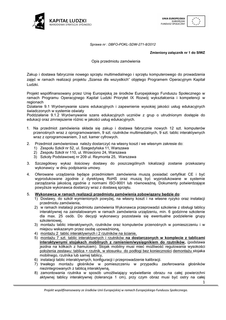 Sprawa nr : DBFO-POKL-SDW-271-8/2012 Zmieniony załącznik nr 1 do SIWZ Opis przedmiotu zamówienia Zakup i dostawa fabrycznie nowego sprzętu multimedialnego i sprzętu komputerowego do prowadzenia zajęć w ramach realizacji projektu „Szansa dla wszystkich” objętego Programem Operacyjnym Kapitał Ludzki. Projekt współfinansowany przez Unię Europejską ze środków Europejskiego Funduszu Społecznego w ramach Programu Operacyjnego Kapitał Ludzki Priorytet IX Rozwój wykształcenia i kompetencji w regionach Działanie 9.1 Wyrównywanie szans edukacyjnych i zapewnienie wysokiej jakości usług edukacyjnych świadczonych w systemie oświaty Poddziałanie 9.1.2 Wyrównywanie szans edukacyjnych uczniów z grup o utrudnionym dostępie do edukacji oraz zmniejszenie róŜnic w jakości usług edukacyjnych. 1. Na przedmiot zamówienia składa się zakup i dostawa fabrycznie nowych 12 szt. komputerów przenośnych wraz z oprogramowaniem, 9 szt. rzutników multimedialnych, 9 szt. tablic interaktywnych wraz z oprogramowaniem, 3 szt. kamer cyfrowych. 2. Przedmiot zamówieniowa naleŜy dostarczyć na własny koszt i we własnym zakresie do: 1) Zespołu Szkół nr 52, ul. Szegedyńska 11, Warszawa 2) Zespołu Szkół nr 110, ul. Wrzeciono 24, Warszawa 3) Szkoły Podstawowej nr 209 ul. Reymonta 25, Warszawa 3. Szczegółowy wykaz ilościowy dostawy do poszczególnych lokalizacji zostanie przekazany wykonawcy w dniu podpisania umowy. 4. Oferowane urządzenia będące przedmiotem zamówienia muszą posiadać certyfikat CE i być wyprodukowane zgodnie z dyrektywą RoHS oraz muszą być wyprodukowane w systemie zarządzania jakością zgodnie z normami ISO-9001 lub równowaŜną. Dokumenty potwierdzające powyŜsze wykonawca dostarczy wraz z dostawą sprzętu. 5. Wykonawca w ramach realizacji przedmiotu zamówienia zobowiązany będzie do: 1) Dostawy, do szkół wymienionych powyŜej, na własny koszt i na własne ryzyko oraz instalacji przedmiotu zamówienia, 2) w ramach instalacji przedmiotu zamówienia Wykonawca przeprowadzi szkolenie z obsługi tablicy interaktywnej na zainstalowanym w ramach zamówienia urządzeniu, min. 6 godzinne szkolenie dla max. 25 osób. Do decyzji wykonawcy pozostawia się ewentualne podzielenie grupy szkoleniowej, 3) montaŜu tablic interaktywnych, rzutników oraz komputerów przenośnych w pomieszczeniu i w miejscu wskazanym przez osobę upowaŜnioną, 4) montaŜu 2 tablic interaktywnych i 2 rzutników na ścianie, 5) montaŜu 7 szt. tablic interaktywnych i rzutników na dostarczonych w komplecie z tablicami interaktywnymi stojakach mobilnych z ramieniem/wysięgnikiem do rzutników, (podstawa jezdna na kółkach z hamulcem). Stojak mobilny musi mieć moŜliwość regulowania wysokości połoŜenia zestawu: tablica + rzutnik, w stosunku do podłogi bez konieczności demontaŜu stojaka mobilnego, rzutnika lub samej tablicy, 6) instalacji tablic interaktywnych, konfiguracji i przeprowadzenie kalibracji. 7) trwałego montaŜu głośników w pomieszczeniu w przypadku zaoferowania głośników niezintegrowanych z tablicą interaktywną, 8) zamontowania rzutnika w sposób umoŜliwiający wyświetlanie obrazu na całej powierzchni aktywnej tablicy interaktywnej (tolerancja 1 cm), przy czym obraz musi być ostry na całej 1 Projekt współfinansowany ze środków Unii Europejskiej w ramach Europejskiego Funduszu Społecznego. powierzchni aktywnej, a krawędzie obrazu muszą być równoległe do krawędzi tablicy. Ze względów bezpieczeństwa moŜliwość unieruchamianie rzutnika w ramieniu/wysięgniku, 9) wykonania okablowania przewodu sygnałowego wideo oraz przewodów głośników, a takŜe przewodu USB do tablicy i zasilającego - długość okablowania musi zostać dopasowana na miejscu, 10) montaŜ wszystkich elementów przedmiotu zamówienia musi umoŜliwić pełne wykorzystanie sprzętu oraz zapewniać właściwe bezpieczeństwo uŜytkowania, 11) okablowanie niskonapięciowe i zasilające winno zostać zainstalowane w przeznaczonych do tego typu zastosowań natynkowych korytkach i innych elementach wykonanych z PCV, 12) okablowanie musi zapewniać przesył sygnałów bez Ŝadnych zakłóceń i zniekształceń, 13) punkt przyłączeniowy przewodu sygnałowego, przewodu USB tablicy oraz podłączenia sygnału audio do głośników musi być umieszczony w pobliŜu biurka nauczyciela, 14) instalacji oprogramowania tablicy na min. dwóch komputerach wskazanych przez osobę upowaŜnioną przez Zamawiającego, 15) przeprowadzenia rejestracji-aktywacji oprogramowania, o ile jest to wymagane w celu pełnego wykorzystania dostarczanych urządzeń, 16) przeprowadzenia wszystkich dodatkowych czynności wymaganych do osiągnięcia pełnego okresu gwarancyjnego zaoferowanych urządzeń, o ile jest to konieczne. Dostarczenia instrukcji obsługi urządzeń oraz oprogramowania na płycie CD-DVD wraz z ewentualnymi kodami aktywacyjnymi lub kluczami produktu. 8. Wykonawca w ramach przedmiotu zamówienia będzie zobowiązany do zapewnienia opieki gwarancyjnej na: 1) zaoferowane urządzenia, montaŜ, okablowanie i wykorzystane elementy montaŜowe objęte będą gwarancją Wykonawcy w okresie minimum 24 miesięcy. 2) Wykonawca będzie przez okres 24 miesięcy pośredniczył w realizacji uprawnień gwarancyjnych elementów przedmiotu zamówienia objętego gwarancjami producentów. Zamawiający niesprawność elementów przedmiotu zamówienia będzie zgłaszała Wykonawcy telefonicznie, faxem bądź drogą elektroniczną. 3) gwarancja nie obejmuje elementów eksploatacyjnych oraz uszkodzeń mechanicznych. 9. Wszystkie elementy przedmiotu zamówienia muszą być: fabrycznie nowe, wolne od wad fizycznych i prawnych, dopuszczone do obrotu na terenie Polski, posiadać stosowne certyfikaty. 10. Wykonawca przekaŜe osobie upowaŜnionej do podpisania zbiorczego protokołu zdawczoodbiorczego, wraz z przedmiotem zamówienia: a) gwarancję na elementy objęte gwarancją; b) oświadczenie o przejęciu 