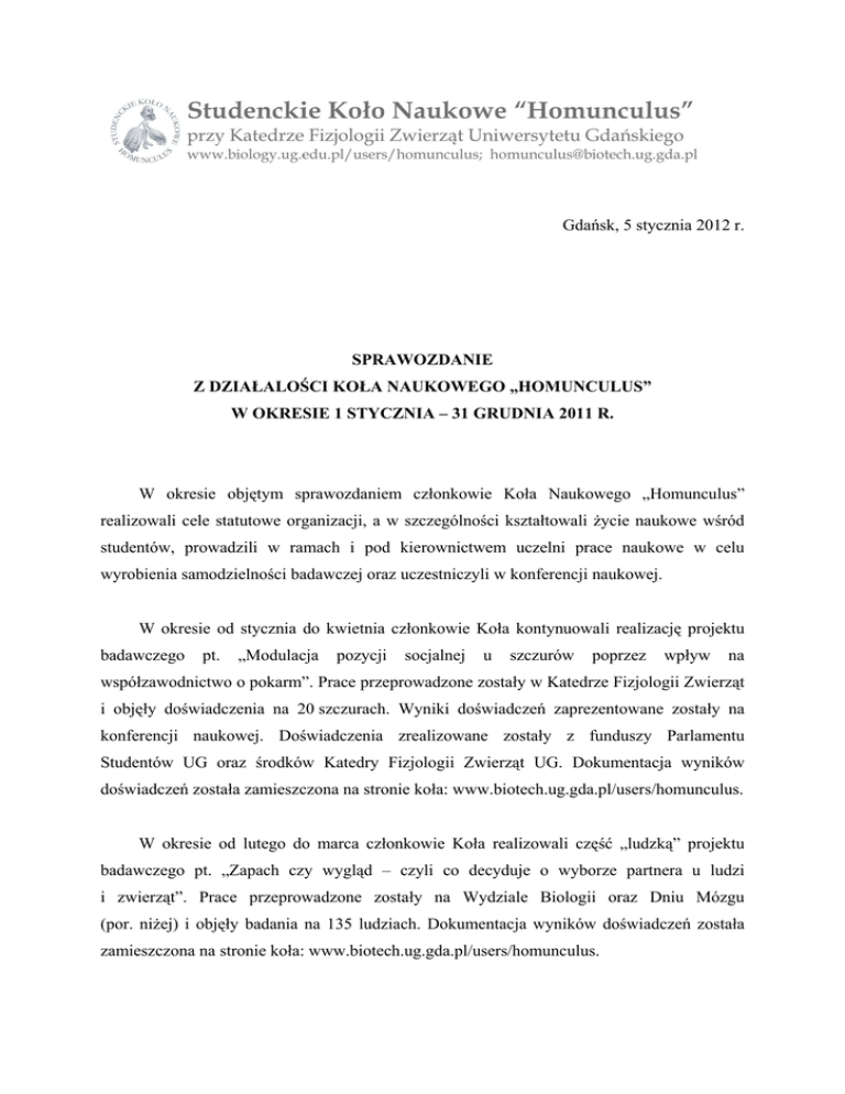 Gdańsk, 5 stycznia 2012 r. SPRAWOZDANIE Z DZIAŁALOŚCI KOŁA NAUKOWEGO „HOMUNCULUS” W OKRESIE 1 STYCZNIA – 31 GRUDNIA 2011 R. W okresie objętym sprawozdaniem członkowie Koła Naukowego „Homunculus” realizowali cele statutowe organizacji, a w szczególności kształtowali życie naukowe wśród studentów, prowadzili w ramach i pod kierownictwem uczelni prace naukowe w celu wyrobienia samodzielności badawczej oraz uczestniczyli w konferencji naukowej. W okresie od stycznia do kwietnia członkowie Koła kontynuowali realizację projektu badawczego pt. „Modulacja pozycji socjalnej u szczurów poprzez wpływ na współzawodnictwo o pokarm”. Prace przeprowadzone zostały w Katedrze Fizjologii Zwierząt i objęły doświadczenia na 20 szczurach. Wyniki doświadczeń zaprezentowane zostały na konferencji naukowej. Doświadczenia zrealizowane zostały z funduszy Parlamentu Studentów UG oraz środków Katedry Fizjologii Zwierząt UG. Dokumentacja wyników doświadczeń została zamieszczona na stronie koła: www.biotech.ug.gda.pl/users/homunculus. W okresie od lutego do marca członkowie Koła realizowali część „ludzką” projektu badawczego pt. „Zapach czy wygląd – czyli co decyduje o wyborze partnera u ludzi i zwierząt”. Prace przeprowadzone zostały na Wydziale Biologii oraz Dniu Mózgu (por. niżej) i objęły badania na 135 ludziach. Dokumentacja wyników doświadczeń została zamieszczona na stronie koła: www.biotech.ug.gda.pl/users/homunculus. Dnia 18 marca 2011 r. Koło Naukowe "Homunculus" wraz z Kołem Naukowym Empiria (SWPS) Kołem Naukowym Integra (SWPS), Kołem Nauk Psychologicznych Anima (UG) oraz Pismem AVANT (UMK) współorganizowało Dzień Mózgu w ramach Światowego Tygodnia Mózgu (Brain Awareness Week). Podczas odbywającego się po raz pierwszy w Trójmieście Dnia Mózgu przeprowadziliśmy warsztaty pt. "Czy to jest uzależniające? – czyli jak testuje się potencjał uzależniający różnych substancji u zwierząt" w oparciu o test warunkowanej preferencji miejsca, zaprezentowaliśmy różne testy behawioralne u szczurów (m.in. test nowości, test otwartego pola, test light-dark box, test uniesionego labiryntu krzyżowego, test interakcji socjalnych, test labiryntu) oraz pokazaliśmy jak ważny jest zapach w odczuwaniu smaku pożywienia. Przeprowadziliśmy także drugą turę badań u ludzi w ramach naszego projektu pt. "Zapach czy wygląd – czyli co decyduje o wyborze partnera u ludzi i zwierząt". W dniu 18 marca, członkowie Koła – Maciej Dylewski, Magdalena Gappa, Adam Kozłowski, Izabela Michalska i Kacper Ptaszek – uczestniczyli w odbywającej się w Gdańsku I Konferencja Kół Naukowych i Magistrantów Wydziału Biologii Uniwersytetu Gdańskiego. Na konferencji członkowie wygłosili referat pt. „Projekty Studenckiego Koła Naukowego "Homunculus" realizowane w latach 2006 – 2010”. Abstrakt został zamieszczony na stronie koła: www.biotech.ug.gda.pl/users/homunculus. W dniach 5 – 8 kwietnia, prezes Koła – Kacper Ptaszek – uczestniczył w odbywającej się we Lwowie na Ukrainie VII International Scientific Conference for Students and Phd Students 'Youth and Progress of Biology'. Na konferencji wygłosił referat pt. „The influence of 'smarts' (designer drugs) on animal behavior”. Abstrakt został zamieszczony na stronie koła: www.biotech.ug.gda.pl/users/homunculus. Wyjazd został dofinansowany ze środków Prorektora ds. Studenckich. W dniach 15 – 17 kwietnia, członkowie Koła – Maciek Dylewski, Weronika Formela, Lidia Gaffke, Magda Gappa, Justyna Kostiuk, Karolina Krawczyk, Kinga Pis, Max Rykaczewski, Martyna Siudak, Klaudia Fic, Adam Kozłowski, Ewelina Kurowska, Kacper Ptaszek, Gosia Tomys, Julia Wrzeciono i Piotr Zawistowski – uczestniczyli w odbywającej się w Krakowie 'Neuronus' Student Neuroscience Conference (IBRO Young Neuroscience Forum). Na konferencji zaprezentowano w formie plakatów wyniki dwóch doświadczeń Koła: „The exploratory activity of rats determines their social status” oraz „ Sex differences in the effect of sexual stimuli on anxiety in rats”. Abstrakty oraz miniatury plakatów zostały zamieszczone na stronie koła: www.biotech.ug.gda.pl/users/homunculus. Udział członków Koła w Konferencji oraz druk plakatów został sfinansowany ze środków Prorektora ds. Studenckich, Dziekana Wydziału Biologii UG, Parlamentu Studentów UG oraz Katedry Fizjologii Zwierząt UG. W okresie od kwietnia do czerwca członkowie Koła realizowali część „zwierzęcą” projektu badawczego pt. „Zapach czy wygląd – czyli co decyduje o wyborze partnera u ludzi i zwierząt”. Prace przeprowadzone zostały w Katedrze Fizjologii Zwierząt i objęły badania na 16 szczurach. Doświadczenia zrealizowane zostały z funduszy Parlamentu Studentów UG oraz środków Katedry Fizjologii Zwierząt UG. Dokumentacja wyników doświadczeń została zamieszczona na stronie koła: www.biotech.ug.gda.pl/users/ homunculus. Dnia 27 maja członkowie Koła współorganizowali IX Bałtycki Festiwal Nauki. W ramach festiwalu Koło włączyło się w przygotowanie i przeprowadzenie imprez pt. „Wydolność wysiłkowa organizmu” oraz „Krew pod mikroskopem”. W październiku przeprowadzono nabór nowych członków Koła. Liczba członków koła na koniec roku 2011 wynosiła 60, w tym 29 z ostatniego naboru. W listopadzie przeprowadzono wybory do Zarządu Koła. Prezesem został Kacper Ptaszek, I wiceprezesem Beata Kwiatkowska, II wiceprezesem Max Rykaczewski, natomiast sekretarzem Ewelina Kurowska. W grudniu członkowie Koła rozpoczęli realizację trzech projektów: „Wpływ długości trwania wykładów na zdolności umysłowe studentów”, „Wpływ pory dnia na uczenie się u ludzi” oraz „Wpływ muzyki na uczenie się u ludzi i zwierząt”. Dnia 16 grudnia odbyło się uroczyste, otwarte zebranie Koła z okazji 10-lecia działalności SKN „Homunculus”. W programie uroczysto