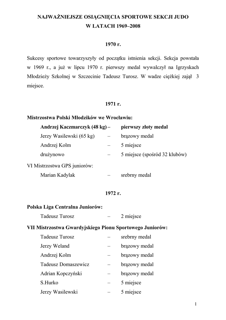 NAJWAŻNIEJSZE OSIĄGNIĘCIA SPORTOWE SEKCJI JUDO W LATACH 1969–2008 1970 r. Sukcesy sportowe towarzyszyły od początku istnienia sekcji. Sekcja powstała w 1969 r., a już w lipcu 1970 r. pierwszy medal wywalczył na Igrzyskach Młodzieży Szkolnej w Szczecinie Tadeusz Turosz. W wadze ciężkiej zajął 3 miejsce. 1971 r. Mistrzostwa Polski Młodzików we Wrocławiu: Andrzej Kaczmarczyk (48 kg) – pierwszy złoty medal Jerzy Wasilewski (65 kg) – brązowy medal Andrzej Kolm – 5 miejsce drużynowo – 5 miejsce (spośród 32 klubów) – srebrny medal VI Mistrzostwa GPS juniorów: Marian Kadylak 1972 r. Polska Liga Centralna Juniorów: Tadeusz Turosz – 2 miejsce VII Mistrzostwa Gwardyjskiego Pionu Sportowego Juniorów: Tadeusz Turosz – srebrny medal Jerzy Weland – brązowy medal Andrzej Kolm – brązowy medal Tadeusz Domaszewicz – brązowy medal Adrian Kopczyński – brązowy medal S.Hurko – 5 miejsce Jerzy Wasilewski – 5 miejsce 1 Mistrzostwa Polski Gwardyjskiego Pionu Sportowego w Olsztynie: drużynowo – 1 miejsce – 6 miejsce Liga Centralna Juniorów: drużynowo Wyróżniający zawodnicy sekcji: J. Weland, W. Burzyński, A. Kaczmarczyk, W. Czartowski, M. Kadylak, T. Domaszewicz, A. Kopczyński, S.Hurko, G. Pakszys, F. Ryśnik. Międzynarodowy Turniej w Cottbus, NRD: Tadeusz Turosz – 5 miejsce (uznany za jednego z najlepszych polskich judoków) 1973 r. III Ogólnopolska Spartakiada Młodzieży w Krakowie: Jerzy Weland (58 kg) – złoty medal Grzegorz Pakszys (+95kg) – srebrny medal Jerzy Wasilewski (65 kg) – 5 miejsce drużynowo – 3 miejsce VIII Mistrzostwa GPS Juniorów, Bydgoszcz: Jerzy Weland (58 kg) – złoty medal Jerzy Wasilewski (65 kg) – złoty medal Grzegorz Pakszys (+95kg) – złoty medal Napieralski – 2 miejsce A.Kaczmarczyk – 3 miejsce Korostyński – 3 miejsce A.Kopczyński – 5 miejsce F.Ryśnik – 4 miejsce drużynowo – 1 miejsce 2 Ogólnopolski Turniej Klasyfikacyjny Juniorów, Chodaków: Jerzy Weland (58 kg) – 2 miejsce Najlepszy sportowiec „Gryfa” w 1973 r.: Jerzy Weland 1974 r. Międzynarodowy Turniej na Węgrzech, Baja: J. Weland – 1 miejsce G. Pakszys – 2 miejsce F. Ryśnik – 3 miejsce drużynowo – 2 miejsce Międzynarodowy Turniej w Słupsku: M. Kijowski – 3 miejsce Z. Kwiatkowski – 3 miejsce K. Fursewicz – 2 miejsce F. Ryśnik – 2 miejsce J. Weland – 1 miejsce T.Domaszewicz – 1 miejsce T.Turosz – 2 miejsce J. Wasilewski – 3 miejsce Siemiątkowski – 3 miejsce Walkowiak – 3 miejsce młodzieżowcy: Brązowi medaliści Igrzysk Młodzieży Szkolnej: Krzysztof Kluf Marek Kijowski 3 Turniej Klasyfikacyjny Juniorów Koszalin ( 21.09.74): Zbigniew Kwiatkowski (65 kg)- 1 miejsce 1975 r. Mistrzostwa Polski Juniorów w Łodzi: Tadeusz Turosz (93 kg) – brązowy medal Międzynarodowy Turniej judo Słupsk (1.05.75 r.) Zbigniew Kwiatkowski (70 kg)- 2 miejsce V Ogólnopolska Spartakiada Młodzieży w Łodzi: Marek Kijowski – 7 miejsce Turniej Klasyfikacyjny Juniorów Człuchów (24.08.75) : Zbigniew Kwiatkowski (70 kg)- 3 miejsce Międzynarodowy Turniej w Katowicach: J. Weland – 2 miejsce (uznany za jednego z najlepszych polskich judoków) 1976 r. Mistrzostwa Polski Młodzieżowe w Koszalinie: J. Weland (63 kg) – brązowy medal Ogólnopolski Turniej Klasyfikacyjny Juniorów w Poznaniu: Kazimierz Fursewicz – 2 miejsce – 5 miejsce Mistrzostwa Polski Juniorów: Zbigniew Słomiński Zbigniew Kwiatkowski Waldemar Czartowski – 5 miejsce – 5 miejsce Do wyróżniających zawodników sekcji judo należą w tym okresie zdobywcy medali na mistrzostwach okręgu: Waldemar Czartowski, Waldemar Burzyński, Stanisław Kuźmicki, Leszek i Mirosław Walkowiakowie, Waldemar Lubtak, Marek Czaban, Piotr Reich, Lech i Wojciech Maraszkiewiczowie. 4 1976/1977 r. Zawodnicy biorą udział w Turniejach towarzyskich i regionalnych. Brak bliższych danych o wynikach sportowych. Młodzieżowe Mistrzostwa Polski, Koszalin: Kazimierz Fursewicz – 5 miejsce 1978 r. Międzynarodowy Turniej w Bydgoszczy (15.09.78 r.): Tomasz Kołodziejski – 1 miejsce Dariusz Lutkiewicz – 1 miejsce Tomasz Klip – 1 miejsce Krzysztof Janusz – 2 miejsce Waldemar Jurkowski – 3 miejsce Ogólnopolski Turniej Klasyfikacyjny Juniorów Młodszych (24.11.78 r.): Dariusz Lutkiewicz – 5 miejsce Ogólnopolski Turniej Klasyfikacyjny Seniorów w Kielcach (78/79): Jerzy Weland (65 kg) – 3 miejsce 1979 r. Turniej o Puchar Komendanta Komendy Wojewódzkiej Milicji Obywatelskiej w Koszalinie (21.02.79 r.): 1 miejsce – D. Weland, M. Skoraczewski, D. Lutkiewicz, W. Jurkowski, Kołodziejski T., T. Trendy, T. Klip 2 miejsce – Wł. Andrzejewski, J. Czarnecki, M. Kaczmarek, K. Janusz, T. Kułdo 3 miejsce – P. Kluzik, T. Suchocki, J. Paliło, M. Kembrowski, D. Andrzejewski, P. Krupowicz 5 II Igrzyska Szkół Podstawowych w Słupsku, medaliści: 33 kg – T. Terendy, T. Pikus 36 kg – W. Andrzejewski, M. Skoraczewski 40 kg – D. Widuliński, A. Tomaszczyk 44 kg – T. Kołodziejski, Z. Nowicki 48 kg – T. Kułdo, D. Andrzejewski 51 kg – D. Lutkiewicz, D. Jermak 56 kg – J. Krzysztof, W. Jurkowski 60 kg – A. Dąbrowski, K. Lancewicz 64 kg – R. Formela, P. Knobelsdorf +64 kg – T. Klip, M. Staniuk Ogólnopolski Turniej Klasyfikacyjny Juniorów Młodszych, Opole (10.03.79 r.): Tomasz Klip (90 kg) – 3 miejsce Mistrzostwa Gwardyjskiego Pionu Sportowego Juniorów Młodszych, Poznań (19.05.79 r.): T. Kołodziejski (53 kg) – 1 miejsce T. Klip (90 kg) – 2 miejsce D. Lutkiewicz (57 kg) – 3 miejsce Turniej Drużynowy w Poznaniu (1.05.79 r.): 2 miejsce VI Ogólnopolska Spartakiada Młodzieży ( 07.79 r.), Bydgoszcz: Lidiusz Kazior (62 kg) – srebrny medal Wojciech Dumański (57 kg) – 5 miejsce Lech Maraszkiewicz (68 kg) – 7 miejsce 6 Drużynowe Mistrzostwa Polski Juniorów Młodszych w Łodzi (12.10.79 r.): brązowy medal – Paliło, Kułdo, Kołodziejski, Jaśkiewicz, Jurkowski, Janusz, Klip, Lutkiewicz, Knobelsdorf,Dumański Woj
