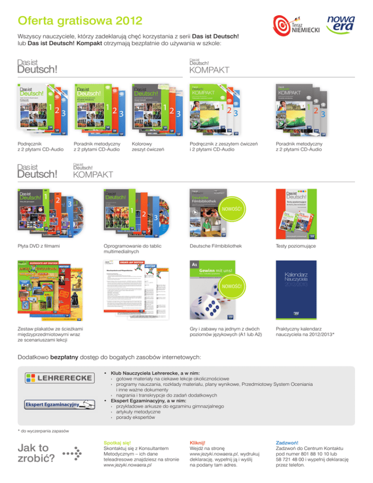 Oferta gratisowa 2012 Teraz NIEMIECKI Wszyscy nauczyciele, którzy zadeklarują chęć korzystania z serii Das ist Deutsch! lub Das ist Deutsch! Kompakt otrzymają bezpłatnie do używania w szkole: PODSTAWY EJ m 2 CD PODSTAWY PROGRAMOWEJ Podręcznik Jolanta Y Y Podręcznik z zeszytem ćwiczeń Język niemiecki dla gimnazjum 12 Zeszyt ćwiczeń 12 3 KOMPAKT KOMPAKT KOMPAKT Język niemiecki dla gimnazjum zawiera 2 CD Podręcznik z zeszytem ćwiczeń Jolanta Kamińska, Sylwia Mróz 3 W TA DS PO EJ EJ W MOW NO RA DO OG PR PODSTAWY WEJ PODSTAWY J NOWEJ DO PROGRAMO NOWEJ DO PROGRAMOWE Das ist Deutsch! PODSTAWY DO NOWEJ PROGRAMOWEJ Jolanta Kamińska PODSTAWY EJ NOWEJ DO PROGRAMOW 1 s Język niemiecki dla gimnazjum Poradnik metodyczny zawiera 2 CD 12 zawiera 2 CD Język niemiecki dla gimnazjum Poradnik metodyczny zawiera 2 CD 3 zawiera 2 CD 3 zawiera 2 CD zawiera 2 CDniemiecki dla gimnazjum Język Język niemiecki dla gimnazjum Jolanta Kamińska Poradnik metodyczny Sylwia Rapacka 3 1 zawiera 2 CD Język niemiecki dla gimnazjum Poradnik metodyczny Sylwia Rapacka 2 2 zawiera 2 CD Język niemiecki dla gimnazjum Poradnik metodyczny Sylwia Mróz www.nowaera.pl Podręcznik z 2 płytami CD-Audio PODSTAWY NOWEJ DO PROGRAMOWEJ zawiera 2 CD Język niemiecki dla gimnazjum Podręcznik PODSTAWY EJ Das ist Deutsch! 1 2 3 4 A1 A1/A2 A2/B1 B1 Język niemiecki dla gimnazjum Podręcznik z zeszytem ćwiczeń 2 Podręcznik 2 www.nowaera.pl 4 KOMPAKT KOMPAKT KOMPAKT Z notatnikiem ucznia Zeszyt ćwiczeń PODSTAWY PODSTAWY NOWEJ DO PROGRAMOWEJ 1 2 2 CD Język niemiecki dla gimnazjum Sylwia Rapacka, Sylwia Mróz, Jolanta Kamińska zawiera 2 CD 1 Europejski System Opisu Kształcenia Językowego: 3 zawiera 2 CD C1. typusię C z: umożliwiają indywidualizację toku nauczania. Są togramatyczne, zadaniacały trudniejsze. Ćwiczenia typu B Podręcznik to ćwiczenia spiralne,karty utrwalające poznany dotąd materiał. Są propozycją pracy Komplet materiałów na każdy rokĆwiczenia nauki składa zawiera: B1. domowej dla ucznia, który wykonując takie ćwiczenia, będzie powtarzał materiał i stosował swoją wiedzę intensywny trening fonetyczny, • podręcznika oraz dwóch płyt CD, w nowych kontekstach. przygotowanie do egzaminu Komplet materiałów na każdy rok nauki składa się z: Podręcznik • kolorowego zeszytu ćwiczeń z notatnikiem ucznia, zawiera: karty 1 gimnazjalnego, aktywny słownik, gramatyczne, • podręcznika oraz dwóch płyt CD, C1. intensywny Ćwiczenia typu C CLIL umożliwiają indywidualizację toku nauczania. Są to zadania trudniejsze. (nauka języka i przedmiotu) oraz • poradnika metodycznego dla nauczycielatrening fonetyczny, projekty. • kolorowego zeszytu ćwiczeń z notatnikiem ucznia, z dwoma płytami CD. przygotowanie do egzaminu • poradnika metodycznego dla nauczyciela gimnazjalnego, aktywny Podręcznik zawiera: Komplet materiałów na każdy rok nauki składa się z: karty Europejski System Opisu Kształcenia Językowego: Poradnikz metodyczny zawiera: dwoma płytami CD. słownik, CLIL (nauka języka i gramatyczne, przygotowanie Das ist Deutsch! scenariusze lekcji, opisy gier, zadania • podręcznika oraz dwóch płyt CD, przedmiotu) oraz projekty. do egzaminu gimnazjalnego, A1 1 Europejski System Opisu Kształcenia zeszytu Językowego: dla dyslektyków, dodatkowe materiały • kolorowego ćwiczeń z notatnikiem ucznia, 1 dosłownik, A1/A2 2 aktywny CLIL (nauka wykorzystania w trakcie oraz Daszajęć ist •Deutsch! poradnika metodycznego dla nauczyciela A2 3 języka i testy. przedmiotu)A1oraz 1 A2/B1 4 z dwoma płytami CD. projekty. Poradnik metodyczny zawiera: A1/A2 2 www.nowaera.pl scenariusze lekcji, opisy gier, A2 3 Europejski System Opisu Kształcenia Językowego: A2/B1 4 zadania dla dyslektyków, Das ist Deutsch! dodatkowe materiały do A1 1 wykorzystania w trakcie zajęć Poradnik metodyczny zawiera: A1/A2 2 oraz testy. www.nowaera.pl scenariusze lekcji, zadania A2/B1 3 B1 4 dla dyslektyków, dodatkowe materiały do wykorzystania w trakcie zajęć oraz testy. NOWEJ DO PROGRAMOWEJ PODSTAWY NOWEJ DO PROGRAMOWEJ A1 A1/A2 A2 A2/B1 zawiera Język niemiecki dlaSylwia gimnazjum Sylwia Rapacka, Jolanta Kamińska, Mróz 12 Jolanta Kamińska Z notatnikiem ucznia Język niemiecki dla gimnazjum m 2 CD 234 Język niemiecki dla gimnazjum Zeszyt ćwiczeń Sylwia Rapacka, Sylwia Mróz, Jolanta Kamińska Zeszyt ćwiczeń zawiera zawiera 2 CD Podręcznik Z notatnikiem ucznia Język niemiecki dla gimnazjum Sylwia Mróz, Jolanta Kamińska dla gimnazjum Poradnik metodyczny Sylwia Mróz zawiera 2 CD Podręcniemieck znik i dla gimnazju Kamińska Jolanta niemiecki ik Kamińska dla gimnazjum Zeszyt ćwiczeń Poradnik metodyczny 3 Język niemiecki dla gimnazjum Kamińska Język1niemiecki dla gimnazjum Język niemiecki dla gimnazjum Sylwia Rapacka Język niemiecki dla gimnazjum Jolanta Kamińska Język Podręczn Jolanta Język niemiecki Poradnik metodyczny Z notatnikiem ucznia Język Podręcznik Zeszyt ćwiczeń Podręcznik 2 CD Jolanta Sylwia Rapacka, Sylwia Mróz, Jolanta Kamińska Jolanta Kamińska zawiera 2 CD 4 123 Jolanta Kamińska zawiera 2 CD Język niemiecki dla gimnazjum Podręcznik m zawiera 2 CD Podręcznik NOWEJ DO PROGRAMOW PODSTAWY NOWEJ DO PROGRAMOWEJ Z notatnikiem ucznia zawiera 2 CD Język niemiecki dla gimnazjum Jolanta Kamińska Podręcznik Język niemiecki dla gimnazjum Język niemiecki dla gimnazjum A i B, transkrypcje tekstów,4. testy do podręcznika1.w wersji pomniejszony podręcznik umożliwiający nauczycielowi przeprowadzenie lekcji pomocy jednej książki, 5. zadania dla dyslektyków przy / zadania dodatkowe, klucze. 2. scenariusze do każdej lekcji, 6. plany wynikowe, Komplet materiałów na7.każdy rok nauki składa z: 3.sięoceniania, testy do podręcznika w wersji A i B, przedmiotowy system 8. płyt transkrypcje tekstów,4. zadania dla dyslektyków / zadania dodatkowe, • podręcznika oraz dwóch CD, 5. plany wynikowe, 9. klucze. • kolorowego zeszytu ćwicz