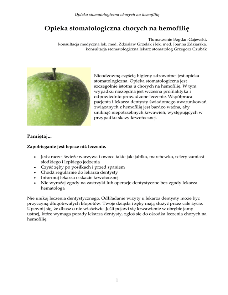 Opieka stomatologiczna chorych na hemofilię Opieka stomatologiczna chorych na hemofilię Tłumaczenie Bogdan Gajewski, konsultacja medyczna lek. med. Zdzisław Grzelak i lek. med. Joanna Zdziarska, konsultacja stomatologiczna lekarz stomatolog Grzegorz Czubak Nieodzowną częścią higieny zdrowotnej jest opieka stomatologiczna. Opieka stomatologiczna jest szczególnie istotna u chorych na hemofilię. W tym wypadku niezbędna jest wczesna profilaktyka i odpowiednio prowadzone leczenie. Współpraca pacjenta i lekarza dentysty świadomego uwarunkowań związanych z hemofilią jest bardzo ważna, aby uniknąć niepotrzebnych krwawień, występujących w przypadku skazy krwotocznej. Pamiętaj... Zapobieganie jest lepsze niż leczenie. • • • • • Jedz raczej świeże warzywa i owoce takie jak: jabłka, marchewka, selery zamiast słodkiego i lepkiego jedzenia Czyść zęby po posiłkach i przed spaniem Chodź regularnie do lekarza dentysty Informuj lekarza o skazie krwotocznej Nie wyrażaj zgody na zastrzyki lub operacje dentystyczne bez zgody lekarza hematologa Nie unikaj leczenia dentystycznego. Odkładanie wizyty u lekarza dentysty może być przyczyną długotrwałych kłopotów. Twoje dziąsła i zęby mają służyć przez całe życie. Upewnij się, że dbasz o nie właściwie. Jeśli pojawi się krwawienie w obrębie jamy ustnej, które wymaga porady lekarza dentysty, zgłoś się do ośrodka leczenia chorych na hemofilię. 1 Opieka stomatologiczna chorych na hemofilię Zęby mleczne u dziecka Pierwsze zęby pojawiają się na ogół w żuchwie. Nawet w tym wstępnym okresie właściwa opieka dentystyczna ma duże znaczenie. Nie ma zastrzeżeń do smoczków, ale unikaj takich, które zawierają słodki płyn. Zachęcaj dziecko do gryzienia sucharków. Unikaj cukierków: Cukier gromadzi się pomiędzy zębami a tam stanowi doskonałą pożywkę dla bakterii, które niszczą zęby i szkodzą dziąsłom. Z tego punktu widzenia chrupki, a nawet czekolada są lepszą alternatywą. Jak i kiedy czyścić zęby Czyść pierwsze zęby u dziecka miękką szczoteczką i wodą. Dzieci w wieku dwu lat i starsze mogą używać szczoteczki z nylonowym włosiem oraz pasty do zębów. Dziecko powinno samodzielnie rozpocząć czyszczenie zębów w wieku czterech lat. Bardzo ważne jest dokładne czyszczenie najlepiej po każdym posiłku. Oczywiście obowiązkowo po śniadaniu i przed spaniem. Powinno to się stać nawykiem, który towarzyszy nam przez całe życie. Umieść szczoteczkę naprzeciw dziąsła. Zwracając ją w stronę korzenia obracaj zdecydowanie tak, aby włosie delikatnie oczyszczało obszar ponad dziąsłami. Szoruj zęby górne z góry na dół Szczotkuj zęby dolne z dołu do góry Szoruj powierzchnię górną 2 Opieka stomatologiczna chorych na hemofilię Oczyszczaj powierzchnie za przednimi zębami wykonując ruch z dołu do góry Czasem rodzice obawiają się, że kiedy dziecko traci zęby, mogą pojawić się krwawienia. Zazwyczaj nie są one znaczące. Zęby wychodzą stopniowo, a podczas ich ubywania zachodzi proces gojenia dziąseł. Może pojawić się niewielkie krwawienie. Nie stanowi jednak dużego problemu. Wizyty u stomatologa W wieku dwóch lat należy rozpocząć regularne wizyty u dentysty. Czasem niektórzy dentyści obawiają się leczenia zębów u chorego na hemofilię. Inni czasami nie traktują hemofilii i skazy krwotocznej zbyt poważnie. Lekarz powinien... • • • Lekarz powinien wiedzieć o skazie krwotocznej. Nie zapomnij poinformować o tym lekarza. Pokaż legitymację chorego na hemofilię. Czasami lekarze specjaliści z Twojego ośrodka leczenia chorych na hemofilię współpracują z Twoim lekarzem dentystą. Niektóre zabiegi chirurgiczne są wykonywane u dentysty przy ośrodku chorych na hemofilię. U chorego nie wolno wykonywać zastrzyków domięśniowych. Nie wolno wykonywać ekstrakcji zębów bez przygotowania hematologicznego. W wypadku krwawienia Jeśli pojawi się niewielkie krwawienie, może pomóc przykładanie do policzka kostki lodu. W przypadku poważniejszego krwawienia należy rozważyć podanie czynnika krzepnięcia i leku antyfibrynolitycznego. W chorobie von Willebranda krwawienia mogą stanowić trochę poważniejszy problem. Dzieje się tak z uwagi na większą skłonność do krwawień z dziąseł i jamy ustnej niż w wypadku hemofilii. Do krwawienia może dojść gwałtownie podczas zabiegu 3 Opieka stomatologiczna chorych na hemofilię dentystycznego, nawet w wyniku małego zranienia lub zadrapania. W tym wypadku stosujemy leczenie desmopresyną i koncentratem czynnika VIII zawierającym czynnik von Willebranda (zależy to od typu choroby von Willebranda) oraz Exacyl. Niektórzy rodzice obawiają się zakładania aparatów korekcyjnych, które mogą wywoływać krwawienia. Ośrodek opieki chorych na hemofilię udzieli porady, jak założyć aparat korekcyjny. Ogólnie ujmując aparaty, mogą być zakładane u dzieci. Stosowanych w celach higienicznych wykałaczek należy używać bardzo ostrożnie tylko wówczas, kiedy nie występuje stan zapalny dziąsła. Ekstrakcja zęba Kilkadziesiąt lat temu ekstrakcje zębów u osób chorych na hemofilię wymagały kilkudniowego pobytu w szpitalu i wielokrotnego podawania leków krwiopochodnych. Obecnie dzięki nowoczesnym czynnikom krzepnięcia oraz lekom antyfibrynolitycznym stało się to znacznie prostsze. Leki antyfibrynolityczne (np. Exacyl) wpływają na proces rozpuszczania skrzepu. Aby działały, najpierw musi powstać skrzep. Powyższe leki są bezwartościowe we wstępnym leczeniu chorych z ciężką postacią skazy krwotocznej. Natomiast po ekstrakcji zęba i utworzeniu skrzepu są bardzo użyteczne. Jeśli przed ekstrakcją u chorego pojawił się zaawansowany stan zapalny, obrzęk, zabieg powinien być przeprowadzony w warunkach szpitalnych. • • • • • • Przed zabiegiem należy przeprowadzić badania na obecność inhibitora. Stosownie do sytuacji n