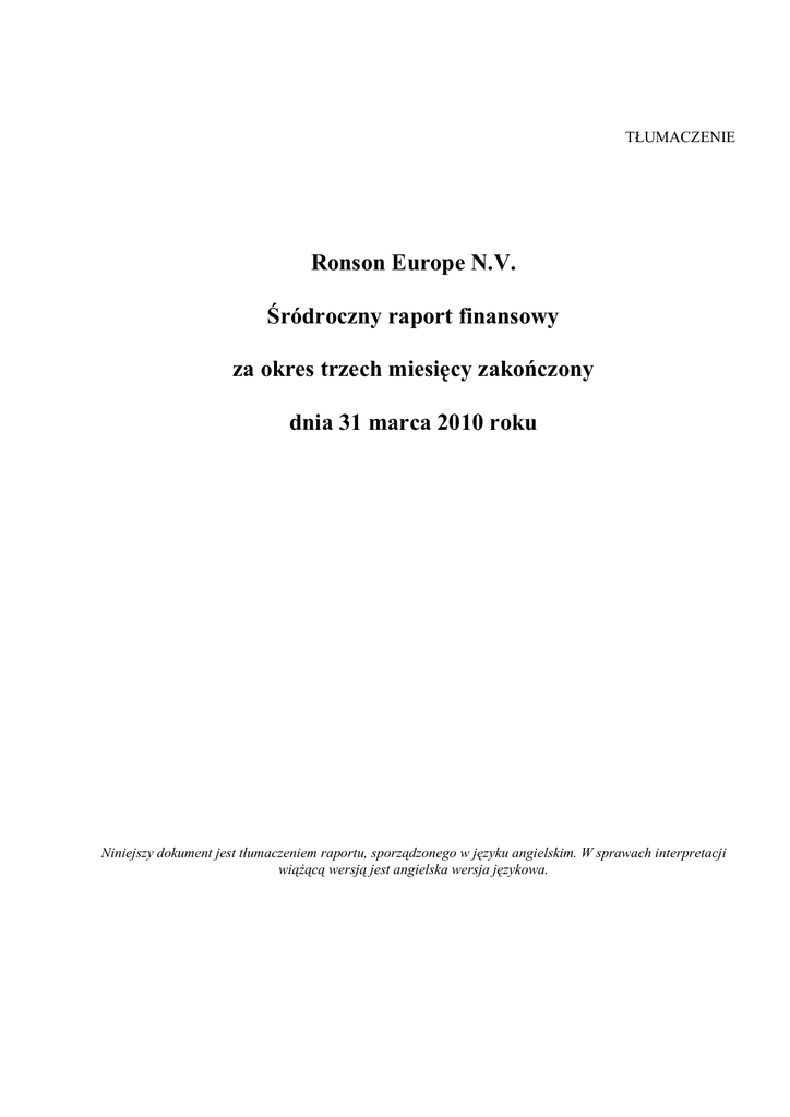 TŁUMACZENIE Ronson Europe N.V. Śródroczny raport finansowy za okres trzech miesięcy zakończony dnia 31 marca 2010 roku Niniejszy dokument jest tłumaczeniem raportu, sporządzonego w języku angielskim. W sprawach interpretacji wiąŜącą wersją jest angielska wersja językowa. Śródroczny raport finansowy za okres trzech miesięcy kończący się dnia 31 marca 2010 roku RONSON EUROPE N.V. TŁUMACZENIE SPIS TREŚCI Sprawozdanie Zarządu z działalności 1 Śródroczny skrócony skonsolidowany raport finansowy za okres trzech miesięcy zakończony dnia 31 marca 2010 Śródroczne skonsolidowane sprawozdanie z sytuacji finansowej 19 Śródroczne skonsolidowane sprawozdanie z całkowitych dochodów 20 Śródroczne skonsolidowane sprawozdanie ze zmian w kapitale własnym 21 Śródroczne skonsolidowane sprawozdanie z przepływów pienięŜnych 22 Dodatkowe noty objaśniające do śródrocznego skróconego skonsolidowanego raportu finansowego 23 Śródroczny raport finansowy za okres trzech miesięcy kończący się dnia 31 marca 2010 roku RONSON EUROPE N.V. TŁUMACZENIE Sprawozdanie Zarządu z działalności Informacje ogólne Wstęp Ronson Europe N.V. (zwany dalej „Spółką), holenderska spółka akcyjna (Dutch public company), z siedzibą w Rotterdamie, Holandia, została utworzona dnia 18 czerwca 2007 r. Spółka poprzez swoje spółki zaleŜne („Grupa”) prowadzi działalność deweloperską polegającą na budowie i sprzedaŜy lokali mieszkalnych, głównie mieszkań w budynkach wielorodzinnych oraz domów jednorodzinnych (w tym równieŜ w zabudowie bliźniaczej) indywidualnym odbiorcom na rynku polskim. Ponadto Grupa wynajmuje nieruchomości osobom trzecim. Akcje Spółki notowane są na Giełdzie Papierów Wartościowych w Warszawie od 5 listopada 2007 r. Na dzień 31 marca 2010 roku, 64,2% akcji było własnością I.T.R. Dori B.V.(zwana dalej „ITR Dori”), 15,3 % akcji pozostawało w posiadaniu GE Real Estate CE Residential B.V., a 20,5% było w posiadaniu pozostałych inwestorów, włączając w to Amplico OFE i ING OFE, gdzie kaŜdy z tych podmiotów posiada od 5% do 10% akcji. Lista największych akcjonariuszy przedstawiona została na stronie 17. Na dzień 12 maja 2010 roku cena rynkowa akcji wynosiła 1,85 złotego za akcję, dając łączną kapitalizację Spółki na poziomie 503,9 milionów złotych. Przegląd spółki Spółka jest doświadczonym, dynamicznie rozwijającym się deweloperem rozszerzającym zasięg geograficzny swojej działalności w głównych miastach Polski. W oparciu o duŜy portfel posiadanych gruntów, Spółka ma dobrą pozycję, aby zostać jednym z wiodących deweloperów na polskim rynku nieruchomości mieszkalnych. Celem Spółki jest maksymalizowanie wartości dla akcjonariuszy poprzez ekspansję w wybranych regionach geograficznych w Polsce jak równieŜ poprzez tworzenie odpowiedniego portfela nieruchomości pod projekty deweloperskie. W opinii zarządu Spółka podjęła odpowiednie działania i jest bardzo dobrze przygotowana do prowadzenia działalności w niestabilnym otoczeniu gospodarczym. Z jednej strony moŜna bowiem dostrzec pewną stabilizację polskiej gospodarki i jej dalszy rozwój, co powinno być odbierane jako dobry prognostyk dla Spółki, z drugiej jednak strony kryzys związany z zadłuŜeniem państw europejskich i jego negatywny wpływ na wspólną europejską walutę moŜe ostatecznie mieć negatywne przełoŜenie zarówno na polską gospodarkę jak i na Spółkę. Mając na uwadze powyŜsze, Zarząd Spółki stosuje strategię pozwalającą na szybkie dostosowanie się do zmieniających się warunków rynkowych i dywersyfikację ryzyka prowadzonej działalności poprzez bieŜącą ocenę i potencjalnie modyfikację liczby projektów, ich wielkości i jakości oraz rozwaŜenie róŜnych lokalizacji geograficznych. Do dnia 31 marca 2010 roku, Grupa zakończyła realizację dziesięciu projektów, obejmujących łącznie 1.406 lokali o łącznej powierzchni 97.100 m2, przekazując klientom 1.312 lokali o łącznej powierzchni 89.700 m2. Przekazanie pozostałych 94 lokali w ramach zakończonych projektów o łącznej powierzchni 7.400 m2 planowane jest do końca 2010 roku (patrz strona 13). Na dzień sporządzenia niniejszego śródrocznego skróconego skonsolidowanego raportu finansowego, Grupa jest w trakcie realizacji sześciu projektów obejmujących 419 lokali, o łącznej powierzchni około 42.000 m2, których ukończenie jest spodziewane do końca 2010 roku oraz w 2011 roku. Ponadto, Spółka planuje rozpocząć dodatkowe pięć nowych projektów do końca 2010 roku Ponadto, Grupa jest w trakcie przygotowywania kolejnych 21 projektów na róŜnych etapach realizacji obejmujących łącznie około 5.300 lokali o łącznej powierzchni 380.000m2 w Warszawie, Poznaniu, Wrocławiu i Szczecinie. 1 Śródroczny raport finansowy za okres trzech miesięcy kończący się dnia 31 marca 2010 roku RONSON EUROPE N.V. TŁUMACZENIE Pomimo trudnej sytuacji rynkowej przychody ze sprzedaŜy Spółki stopniowo poprawiały się od czwartego kwartału 2008 roku, który był najtrudniejszym momentem zarówno dla Spółki jak i dla całego rynku. W 2009 roku Spółka sprzedała 263 mieszkania, podczas gdy w ciągu pierwszego kwartału 2010 roku sprzedaŜ netto osiągnęła poziom 85 lokali, co w opinii zarządu Spółki moŜe być uwaŜane za dobry wynik biorąc pod uwagę sytuację na rynku i wielkość oferty Spółki. W związku z tym, Ŝe dzięki postępującej sprzedaŜy zmniejsza się liczba mieszkań oferowanych przez Spółkę, zamierza ona wykorzystać poprawiające się warunki rynkowe i po rozpoczęciu w pierwszym kwartale 2010 roku dwóch nowych projektów planuje zainicjowanie kolejnych pięciu w dalszej części 2010 roku. W celu zminimalizowania ryzyka, zarząd zamierza podzielić nowe projekty na relatywnie mniejsze etapy. Ponadto plany Spółki zakładają stopniowe uruchamianie nowych inwestycji w ciągu zbl