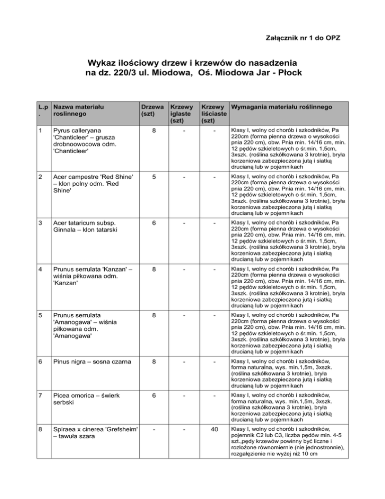Załącznik nr 1 do OPZ Wykaz ilościowy drzew i krzewów do nasadzenia na dz. 220/3 ul. Miodowa, Oś. Miodowa Jar - Płock L.p Nazwa materiału . roslinnego Drzewa (szt) Krzewy iglaste (szt) Krzewy Wymagania materiału roślinnego liściaste (szt) 1 Pyrus calleryana 'Chanticleer' – grusza drobnoowocowa odm. 'Chanticleer' 8 - - Klasy I, wolny od chorób i szkodników, Pa 220cm (forma pienna drzewa o wysokości pnia 220 cm), obw. Pnia min. 14/16 cm, min. 12 pędów szkieletowych o śr.min. 1,5cm, 3xszk. (roślina szkółkowana 3 krotnie), bryła korzeniowa zabezpieczona jutą i siatką drucianą lub w pojemnikach 2 Acer campestre 'Red Shine' – klon polny odm. 'Red Shine' 5 - - Klasy I, wolny od chorób i szkodników, Pa 220cm (forma pienna drzewa o wysokości pnia 220 cm), obw. Pnia min. 14/16 cm, min. 12 pędów szkieletowych o śr.min. 1,5cm, 3xszk. (roślina szkółkowana 3 krotnie), bryła korzeniowa zabezpieczona jutą i siatką drucianą lub w pojemnikach 3 Acer tataricum subsp. Ginnala – klon tatarski 6 - - Klasy I, wolny od chorób i szkodników, Pa 220cm (forma pienna drzewa o wysokości pnia 220 cm), obw. Pnia min. 14/16 cm, min. 12 pędów szkieletowych o śr.min. 1,5cm, 3xszk. (roślina szkółkowana 3 krotnie), bryła korzeniowa zabezpieczona jutą i siatką drucianą lub w pojemnikach 4 Prunus serrulata 'Kanzan' – wiśnia piłkowana odm. 'Kanzan' 8 - - Klasy I, wolny od chorób i szkodników, Pa 220cm (forma pienna drzewa o wysokości pnia 220 cm), obw. Pnia min. 14/16 cm, min. 12 pędów szkieletowych o śr.min. 1,5cm, 3xszk. (roślina szkółkowana 3 krotnie), bryła korzeniowa zabezpieczona jutą i siatką drucianą lub w pojemnikach 5 Prunus serrulata 'Amanogawa' – wiśnia piłkowana odm. 'Amanogawa' 8 - - Klasy I, wolny od chorób i szkodników, Pa 220cm (forma pienna drzewa o wysokości pnia 220 cm), obw. Pnia min. 14/16 cm, min. 12 pędów szkieletowych o śr.min. 1,5cm, 3xszk. (roślina szkółkowana 3 krotnie), bryła korzeniowa zabezpieczona jutą i siatką drucianą lub w pojemnikach 6 Pinus nigra – sosna czarna 8 - - Klasy I, wolny od chorób i szkodników, forma naturalna, wys. min.1,5m, 3xszk. (roślina szkółkowana 3 krotnie), bryła korzeniowa zabezpieczona jutą i siatką drucianą lub w pojemnikach 7 Picea omorica – świerk serbski 6 - - Klasy I, wolny od chorób i szkodników, forma naturalna, wys. min.1,5m, 3xszk. (roślina szkółkowana 3 krotnie), bryła korzeniowa zabezpieczona jutą i siatką drucianą lub w pojemnikach 8 Spiraea x cinerea 'Grefsheim' – tawuła szara - - 40 Klasy I, wolny od chorób i szkodników, pojemnik C2 lub C3, liczba pędów min. 4-5 szt.,pędy krzewów powinny być liczne i rozlożone równomiernie (nie jednostronnie), rozgałęzienie nie wyżej niż 10 cm 9 Spiraea japonica 'Goldflame' – tawuła japońska 'Goldflame' - - 40 Klasy I, wolny od chorób i szkodników, pojemnik C2 lub C3, liczba pędów min. 4-5 szt.,pędy krzewów powinny być liczne i rozlożone równomiernie (nie jednostronnie), rozgałęzienie nie wyżej niż 10 cm 10 Berberis thunbergii 'Atropurpurea' – berberys Thunberga 'Atropurpurea' - - 40 Klasy I, wolny od chorób i szkodników, pojemnik C2 lub C3, liczba pędów min. 4-5 szt.,pędy krzewów powinny być liczne i rozlożone równomiernie (nie jednostronnie), rozgałęzienie nie wyżej niż 10 cm 11 Hydrangea paniculata 'Limelight' – hortensja bukietowa 'Limelight' - - 40 Klasy I, wolny od chorób i szkodników, pojemnik C2 lub C3, liczba pędów min. 4-5 szt.,pędy krzewów powinny być liczne i rozlożone równomiernie (nie jednostronnie), rozgałęzienie nie wyżej niż 10 cm 12 Weigela 'Nana Variegata' – krzewuszka 'Nana Variegata' - - 40 Klasy I, wolny od chorób i szkodników, pojemnik C2 lub C3, liczba pędów min. 4-5 szt.,pędy krzewów powinny być liczne i rozlożone równomiernie (nie jednostronnie), rozgałęzienie nie wyżej niż 10 cm 13 Juniperus xpfitzeriana 'Gold Star' – jalowiec Pfitzera 'Gold Star' - 40 - Klasy I, wolny od chorób i szkodników, pojemnik C2 lub C3, średnica min. 40 cm, liczba pędów min. 4-5 szt.,pędy krzewów powinny być liczne i rozlożone równomiernie (nie jednostronnie), rozgałęzienie nie wyżej niż 10 cm 14 Juniperus squamata 'Blue Carpet' – jałowiec łuskowaty 'Blue Carpet' - 40 - Klasy I, wolny od chorób i szkodników, pojemnik C2 lub C3, średnica min. 40 cm, liczba pędów min. 4-5 szt.,pędy krzewów powinny być liczne i rozlożone równomiernie (nie jednostronnie), rozgałęzienie nie wyżej niż 10 cm 49 80 200 Podsumowanie: *obwód drzew z tabeli mierzony na wys. 1m