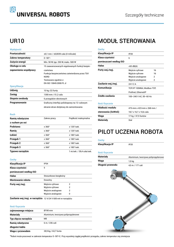 Szczegóły techniczne UR10 MODUŁ STEROWANIA Wydajność Cechy Powtarzalność ±0,1 mm / ±0,0039 cala (4 milicale) Klasyfikacja IP IP20 Zakres temperatury 0–50°* Klasa czystości 6 Zużycie energii Min. 90 W, typ. 250 W, maks. 500 W pomieszczeń według ISO Obsługa w celu 15 zaawansowanych regulowanych funkcji bezpie- Hałas <65 dB(A) zapewnienia współpracy czeństwa. Porty wej./wyj. Wejście cyfrowe 16 Funkcja bezpieczeństwa zatwierdzona przez TüV Wyjście cyfrowe 16 NORD Wejście analogowe 2 Testowano zgodnie z: Wyjście analogowe 2 EN ISO 13849:2008 PL d Specyfikacja Udźwig 10 kg /22 funty Zasięg 1300 mm / 51,2 cala Stopnie swobody 6 przegubów obrotowych Programowanie Ruch Zasilanie wej./wyj. 24 V 2 A Komunikacja TCP/IP 100Mbit, Modbus TCP, Profinet, EthernetIP Źródło zasilania 100–240 V AC, 50–60 Hz Graficzny interfejs poliskopowy na 12-calowym Ilość fizycznie ekranie ekran dotykowy do zamontowania Wielkość modułu 475 mm x 423 mm x 268 mm / sterowania (SxWxG) 18,7 x 16,7 x 10,6 cala Waga 17 kg / 37,5 funtów Materiały Stal Zakres pracy Prędkość maksymalna Podstawa ± 360° ± 120°/sek. Ramię ± 360° ± 120°/sek. Łokieć ± 360° ± 180°/sek. Przegub 1 ± 360° ± 180°/sek. Przegub 2 Cechy ± 360° ± 180°/sek. Przegub 3 Klasyfikacja IP ± 360° ± 180°/sek. Typowe narzędzie 1 m/sek. / 39,4 cala/sek. Cechy Klasyfikacja IP IP54 Klasa czystości 5 Ramię robotyczne z ruchem po osi PILOT UCZENIA ROBOTA IP20 Ilość fizycznie Materiały Aluminium, tworzywa polipropylenowe Waga 1,5 kg Długość przewodu 4,5 m / 177 cali pomieszczeń według ISO Hałas Stosunkowo bezgłośny Montowanie robota Dowolny Porty wej./wyj. Wejście cyfrowe 2 Wyjście cyfrowe 2 Wejście analogowe 2 Wyjście analogowe 0 Zasilanie wej./wyj. w narzędziu 12 V/24 V 600 mA w narzędziu Ilość fizycznie zajmowanego miejsca Ø190 mm Materiały Aluminium, tworzywa polipropylenowe Typ złącza narzędzia M8 Ramię robotyczne 6 m / 236 cali długości kabla Waga z przewodem 28,9 kg / 63,7 funta *Robot może pracować w zakresie temperatur 0–50°*C. Przy wysokiej ciągłej prędkości przegubu, zakres temperatur się zmniejsza