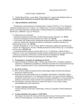 Brzeg Dolny 09.09.2015 ZAPYTANIE OFERTOWE 1. Gmina Brzeg Dolny, zwana dalej „Zamawiającym”, zaprasza do składania ofert na wykonanie płyty betonowej na gruncie lodowiska stacjonarnego. 2 Opis przedmiotu zamówienia Przedmiotem zamówienia jest wykonanie płyty z betonu C20/25 gr. 15 cm zbrojonej włóknami kopolimerowymi ( 2 kg/m3 , dł. włókien min. 54 mm) na istniejącym podłożu z piasku sztucznego lodowiska stacjonarnego w Brzegu Dolnym przy Kompleksie HotelowoSportowym „ ROKITA” przy ul. Wilczej 8. 2.1 Zakres prac do wykonania: - demontaż istniejącej nawierzchni z kostki betonowej przy obrzeżach ok. 40 m2 - demontaż istniejących obrzeży betonowych 30x8 o dł. 126 mb - wyrównanie oraz dogęszczenie istniejącego podłoża piaskowego o pow. 875,951 m2 - ponowne wbudowane istniejących obrzeży na podsypce cementowo-piaskowej z oporem betonowym o dł. 126 mb - ułożenie posadzki gr. 15 cm z betonu B20/25 zbrojonego włóknem kopolimerowym 2 kg/m3, dł. włókien min. 54 mm z wkładką dystansową wokół obrzeży np. ze styropianu gr.1cm o pow. 875,951 m2 - wykonanie dylatacji poprzez nacięcia płyty po ok. 2-3 dniach po wylaniu betonu o polach ok. 5x4 m oraz wypełnieniu szczelin sznurem dylatacyjnym oraz masą elastyczną - ponowne wykonanie nawierzchni z kostki betonowej istniejącej ok. 40 m2 Oferent udzieli 36-cio miesięcznej gwarancji na wykonane roboty. 3 Wymagania w stosunku do składających ofertę: 3.1 Należy przedłożyć aktualny odpis z właściwego rejestru lub z centralnej ewidencji i informacji o działalności gospodarczej. Wskazane jest także aby oferent dokonał wizji miejsca wykonania robót w celu zweryfikowania podanego wyżej obmiaru. 4 Kryteria wyboru: 4.1 Przy wyborze najkorzystniejszej oferty zamawiający będzie się kierował jedynym kryterium: najniższą ceną. 4.2 Wykonawca powinien podać cenę za wykonanie zamówienia w formularzu oferty stanowiącym załącznik nr 1 do zapytania ofertowego. Cena musi zawierać zapłatę za przedmiot zamówienia wraz ze wszystkimi kosztami niezbędnymi w celu prawidłowej realizacji zamówienia, także kosztami nieuwzględnionymi w zapytaniu ofertowym. 4.3 Zamawiający zastrzega sobie prawo odrzucenia oferty o cenie rażąco niskiej, niewspółmiernej do cen rynkowych. 5 Termin realizacji zamówienia: Termin realizacji zamówienia zamawiający ustala na 4 tygodnie od dnia podpisania umowy. 6 Termin składania ofert upływa: 14.09.2015r. Decydujące znaczenie dla oceny zachowania powyższego terminu ma data wpływu oferty do zamawiającego, a nie data jej wysłania. Oferty można składać: 1 6.1 listownie na adres: Urząd Miejski w Brzegu Dolnym, ul. Kolejowa 29, 56-120 Brzeg Dolny; 6.2 e-mailem na adres [email protected] – skan w formacie PDF; 6.3 osobiście w sekretariacie Urzędu Miejskiego w Brzegu Dolnym, w zamkniętej kopercie; z dopiskiem „Lodowisko” 7 Prawidłowo sporządzona oferta powinna zawierać co najmniej: 7.1 Formularz oferty. 7.2 Aktualny odpis z właściwego rejestru lub z centralnej ewidencji i informacji o działalności gospodarczej 8 Pozostałe informacje 8.1 Dane kontaktowe: tel. 690 643 801, [email protected] 8.1 Przedmiot zamówienia nie jest objęty przepisami ustawy z dnia 29 stycznia 2004 r. Prawo zamówień publicznych. 8.1 Zamawiający zastrzega sobie prawo do: - zmiany lub odwołania niniejszego ogłoszenia, - unieważnienia postępowania na każdym jego etapie bez podania przyczyny, a także do pozostawienia postępowania bez wyboru oferty. 9 Załączniki do zapytania: 9.1 Formularz oferty 9.2 Rzut lodowiska 9.3 Przekrój poprzeczny płyty 9.4 Mapa sytuacyjna 2 Załącznik nr 1 Formularz oferty Nazwa wykonawcy: …………………………………………………………………………………………………………………………………………………………… Adres: ……………………………………………………………………………………………………………………………………………… REGON: …………………………………………………………………………………………………………………………………………… NIP: …………………………………………………………………………………………………………………………………………………. Tel: …………………………………………………………………………………………………………………………………………………. Fax: …………………………………………………………………………………………………………………………………………………. E-mail: ……………………………………………………………………………………………………………………………………………… GMINA BRZEG DOLNY ul. Kolejowa 29 56-120 Brzeg Dolny Odpowiadając na zaproszenie do składania ofert na wykonanie płyty betonowej na gruncie lodowiska stacjonarnego. 1. Oświadczamy, że akceptujemy w całości wszystkie warunki zawarte w zapytaniu ofertowym. 2. SKŁADAMY OFERTĘ na wykonanie przedmiotu zamówienia, zgodnie z opisem przedmiotu zamówienia i wzorem umowy, za: ŁĄCZNĄ CENĘ OFERTOWĄ _ . _ _ _ . _ _ _ , _ _ PLN brutto słownie złotych: ………………………………………………………………………………………………………………………………… …………………………………………………………………………………………………………………………………………………………… …………………………………………………………………………………………………………………………………………………………… W tym podatek VAT w wysokości ………… % 3. Oświadczamy, że powyższa cena brutto zawiera wszystkie koszty, jakie po