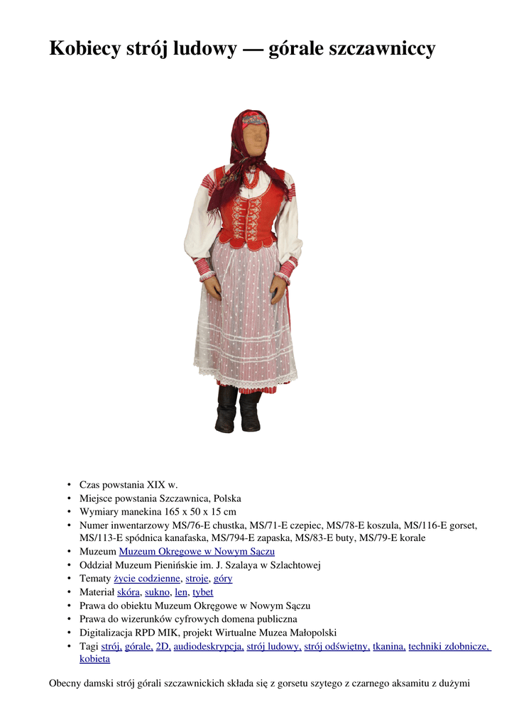 Kobiecy strój ludowy — górale szczawniccy • • • • • • • • • • • • Czas powstania XIX w. Miejsce powstania Szczawnica, Polska Wymiary manekina 165 x 50 x 15 cm Numer inwentarzowy MS/76E chustka, MS/71E czepiec, MS/78E koszula, MS/116E gorset, MS/113E spódnica kanafaska, MS/794E zapaska, MS/83E buty, MS/79E korale Muzeum Muzeum Okręgowe w Nowym Sączu Oddział Muzeum Pienińskie im. J. Szalaya w Szlachtowej Tematy życie codzienne, stroje, góry Materiał skóra, sukno, len, tybet Prawa do obiektu Muzeum Okręgowe w Nowym Sączu Prawa do wizerunków cyfrowych domena publiczna Digitalizacja RPD MIK, projekt Wirtualne Muzea Małopolski Tagi strój, górale, 2D, audiodeskrypcja, strój ludowy, strój odświętny, tkanina, techniki zdobnicze, kobieta Obecny damski strój górali szczawnickich składa się z gorsetu szytego z czarnego aksamitu z dużymi wzorami kwiatów wyszywanymi jedwabnymi nićmi na plecach i przodach, zakładanego na białą koszulę, spódnicy z zielonego tybetu drukowanego w duże czerwone kwiaty, zapaski tiulowej haftowanej i kierpców zakładanych na białą skarpetę. Dawniej mężatki zakładały na głowę czepce, później chustki. W zimie nosiły sukienne pantofle, długie kożuchy z rękawami. Zamiast dzisiejszych spódnic tybetowych ubierano białoczerwone pasiaste „kanafaski”. Gorsety szyto z czerwonego sukna, zapinane na jeden rząd guzików. Z czasem wzdłuż guzików zaczął się rozwijać haft. Tradycja ludowa podaje, że te najstarsze gorsety przerabiano ze spodni mundurów austriackich przynoszonych przez mężczyzn wracających z długoletniej służby wojskowej. Zakładano je na białe koszule bogato marszczone przy szyi, a na ramionach i manszetach zdobione czerwonymi smużkami. Na ramiona narzucano biały „rańtuch”, a na nogi wciągano czarne buty z cholewami. Na szyi kilka sznurków korali, spod których wystawała kokarda z czerwonej wstążki. Do ślubu panna młoda i towarzyszące jej drużki zakładały na głowę wianki ze sztucznych kwiatów, z których opadały na plecy kolorowe wstążki. Ten stary szczawnicki strój kobiecy możemy zobaczyć w Muzeum Pienińskim. Wiele w nim wpływów spiskich, jak obcisły kolorowy czepek z ostrym zębem nad czołem, koszula z czerwonymi prążkami na ramionach i samodziałowa spódnica z białoczerwonego pasiaka zwana kanafaską czy wysokie skórzane buty zwane węgierskimi. Opracowanie: Barbara Węglarz (Muzeum Okręgowe w Nowym Sączu), © wszystkie prawa zastrzeżone