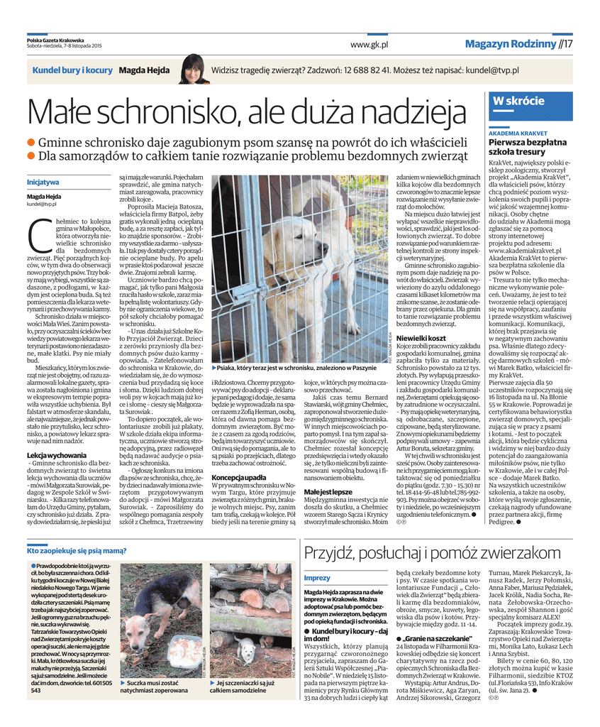 Polska Gazeta Krakowska Sobota–niedziela, 7–8 listopada 2015 Magazyn Rodzinny //17 www.gk.pl Kundel bury i kocury Magda Hejda Widzisz tragedię zwierząt? Zadzwoń: 12 688 82 41. Możesz też napisać: [email protected] Małe schronisko, ale duża nadzieja A Gminne schronisko daje zagubionym psom szansę na powrót do ich właścicieli A Dla samorządów to całkiem tanie rozwiązanie problemu bezdomnych zwierząt Magda Hejda [email protected] C hełmiec to kolejna gmina w Małopolsce, która otworzyła niewielkie schronisko dla bezdomnych zwierząt. Pięć porządnych kojców, w tym dwa do obserwacji nowo przyjętych psów. Trzy boksy mają wybiegi, wszystkie są zadaszone, z podłogami, w każdym jest ocieplona buda. Są też pomieszczenia dla lekarza weterynarii i przechowywania karmy. Schronisko działa w miejscowości Mała Wieś. Zanim powstało, przy oczyszczalni ścieków bez wiedzy powiatowego lekarza weterynarii postawiono niezadaszone, małe klatki. Psy nie miały bud. Mieszkańcy, którym los zwierząt nie jest obojętny, od razu zaalarmowali lokalne gazety, sprawa została nagłośniona i gmina w ekspresowym tempie poprawiła wszystkie uchybienia. Był falstart w atmosferze skandalu, ale najważniejsze, że jednak powstało nie przytulisko, lecz schronisko, a powiatowy lekarz sprawuje nad nim nadzór. Lekcja wychowania – Gminne schronisko dla bezdomnych zwierząt to świetna lekcja wychowania dla uczniów – mówi Małgorzata Surowiak, pedagog w Zespole Szkół w Świniarsku. – Kilka razy telefonowałam do Urzędu Gminy, pytałam, czy schronisko już działa. Z prasy dowiedziałam się, że pieski już są i mają złe warunki. Pojechałam sprawdzić, ale gmina natychmiast zareagowała, pracownicy zrobili kojce . Poprosiła Macieja Batosza, właściciela firmy Batpol, żeby gratis wykonali jedną ocieplaną budę, a za resztę zapłaci, jak tylko znajdzie sponsorów. – Zrobimy wszystkie za darmo – usłyszała. I tak psy dostały cztery porządnie ocieplane budy. Po apelu w prasie ktoś podarował jeszcze dwie. Znajomi zebrali karmę. Uczniowie bardzo chcą pomagać, jak tylko pani Małgosia rzuciła hasło w szkole, zaraz miała pełną listę wolontariuszy. Gdyby nie ograniczenia wiekowe, to pół szkoły chciałoby pomagać w schronisku. – U nas działa już Szkolne Koło Przyjaciół Zwierząt. Dzieci z zerówki przyniosły dla bezdomnych psów dużo karmy – opowiada. – Zatelefonowałam do schroniska w Krakowie, dowiedziałam się, że do wymoszczenia bud przydadzą się koce i słoma. Dzięki ludziom dobrej woli psy w kojcach mają już koce i słomę – cieszy się Małgorzata Surowiak . To dopiero początek, ale wolontariusze zrobili już plakaty. W szkole działa ekipa informatyczna, uczniowie stworzą stronę adopcyjną, przez radiowęzeł będą nadawać audycje o psiakach ze schroniska. – Ogłoszę konkurs na imiona dla psów ze schroniska, chcę, żeby dzieci nadawały imiona zwierzętom przygotowywanym do adopcji – mówi Małgorzata Surowiak. – Zaprosiliśmy do wspólnego pomagania zespoły szkół z Chełmca, Trzetrzewiny zdaniem w niewielkich gminach kilka kojców dla bezdomnych czworonogów to znacznie lepsze rozwiązanie niż wysyłanie zwierząt do molochów. Na miejscu dużo łatwiej jest wyłapać wszelkie nieprawidłowości, sprawdzić, jaki jest los odłowionych zwierząt. To dobre rozwiązanie pod warunkiem rzetelnej kontroli ze strony inspekcji weterynaryjnej. Gminne schronisko zagubionym psom daje nadzieję na powrót do właścicieli. Zwierzak wywieziony do azylu oddalonego czasami kilkaset kilometrów ma znikome szanse, że zostanie odebrany przez opiekuna. Dla gmin to tanie rozwiązanie problemu bezdomnych zwierząt. FOT. MAGDA HEJDA Inicjatywa bPsiaka, który teraz jest w schronisku, znaleziono w Paszynie i Rdziostowa. Chcemy przygotowywać psy do adopcji – deklaruje pani pedagog i dodaje, że sama będzie je wyprowadzała na spacer razem z Zofią Herman, osobą, która od dawna pomaga bezdomnym zwierzętom. Być może z czasem za zgodą rodziców, będą im towarzyszyć uczniowie. Oni rwą się do pomagania, ale to są psiaki po przejściach, dlatego trzeba zachować ostrożność. Koncepcja upadła W prywatnym schronisku w Nowym Targu, które przyjmuje zwierzęta z różnych gmin, brakuje wolnych miejsc. Psy, zanim tam trafią, czekają w kolejce. Pół biedy jeśli na terenie gminy są Małe jest lepsze Międzygminna inwestycja nie doszła do skutku, a Chełmiec wzorem Starego Sącza i Krynicy stworzył małe schronisko. Moim Imprezy Magda Hejda zaprasza na dwie imprezy w Krakowie. Można adoptować psa lub pomóc bezdomnym zwierzętom, będącym pod opieką fundacji i schroniska. a Kundel bury i kocury – daj FOT. MAGDA HEJDA FOT. MAGDA HEJDA im dom! b Suczka musi zostać natychmiast zoperowana Kojce zrobili pracownicy zakładu gospodarki komunalnej, gmina zapłaciła tylko za materiały. Schronisko powstało za 12 tys. złotych. Psy wyłapują przeszkoleni pracownicy Urzędu Gminy i zakładu gospodarki komunalnej. Zwierzętami opiekują się osoby zatrudnione w oczyszczalni. – Psy mają opiekę weterynaryjną, są odrobaczane, szczepione, czipowane, będą sterylizowane. Z nowymi opiekunami będziemy podpisywali umowy – zapewnia Artur Boruta, sekretarz gminy. W tej chwili w schronisku jest sześć psów. Osoby zainteresowane ich przygarnięciem mogą kontaktować się od poniedziałku do piątku (godz. 7.30 – 15.30) nr tel. 18 414-56-48 lub tel.785-992903. Psy można obejrzeć w soboty i niedziele, po wcześniejszym uzgodnieniu telefonicznym. a ¹ AKADEMIA KRAKVET Pierwsza bezpłatna szkoła tresury KrakVet, największy polski esklep zoologiczny, stworzył projekt „Akademia KrakVet”, dla właścicieli psów, którzy chcą podnieść poziom wyszkolenia swoich pupili i poprawić jakość wzajemnej komunikacji. Osoby chętne do udziału w Akademii mogą zgłaszać się za pomocą strony internetowej projekt