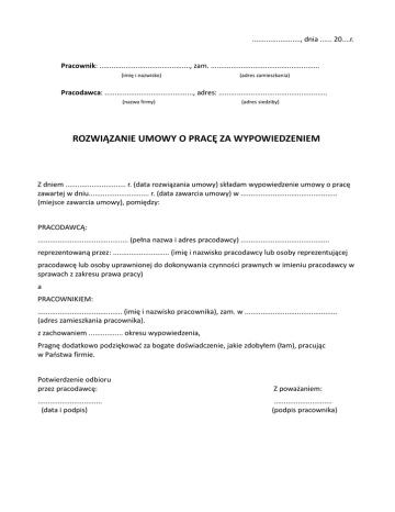 ........................, dnia ...... 20....r. Pracownik: ............................................., zam. ...................................................... (imię i nazwisko) (adres zamieszkania) Pracodawca: ............................................, adres: ...................................................... (nazwa firmy) (adres siedziby) ROZWIĄZANIE UMOWY O PRACĘ ZA WYPOWIEDZENIEM Z dniem .............................. r. (data rozwiązania umowy) składam wypowiedzenie umowy o pracę zawartej w dniu.............................. r. (data zawarcia umowy) w ................................................ (miejsce zawarcia umowy), pomiędzy: PRACODAWCĄ: ............................................. (pełna nazwa i adres pracodawcy) ............................................ reprezentowaną przez: ............................ (imię i nazwisko pracodawcy lub osoby reprezentującej pracodawcę lub osoby uprawnionej do dokonywania czynności prawnych w imieniu pracodawcy w sprawach z zakresu prawa pracy) a PRACOWNIKIEM: .......................................... (imię i nazwisko pracownika), zam. w .............................................. (adres zamieszkania pracownika). z zachowaniem ................. okresu wypowiedzenia, Pragnę dodatkowo podziękować za bogate doświadczenie, jakie zdobyłem (łam), pracując w Państwa firmie. Potwierdzenie odbioru przez pracodawcę: Z poważaniem: ................................ (data i podpis) ............................. (podpis pracownika)