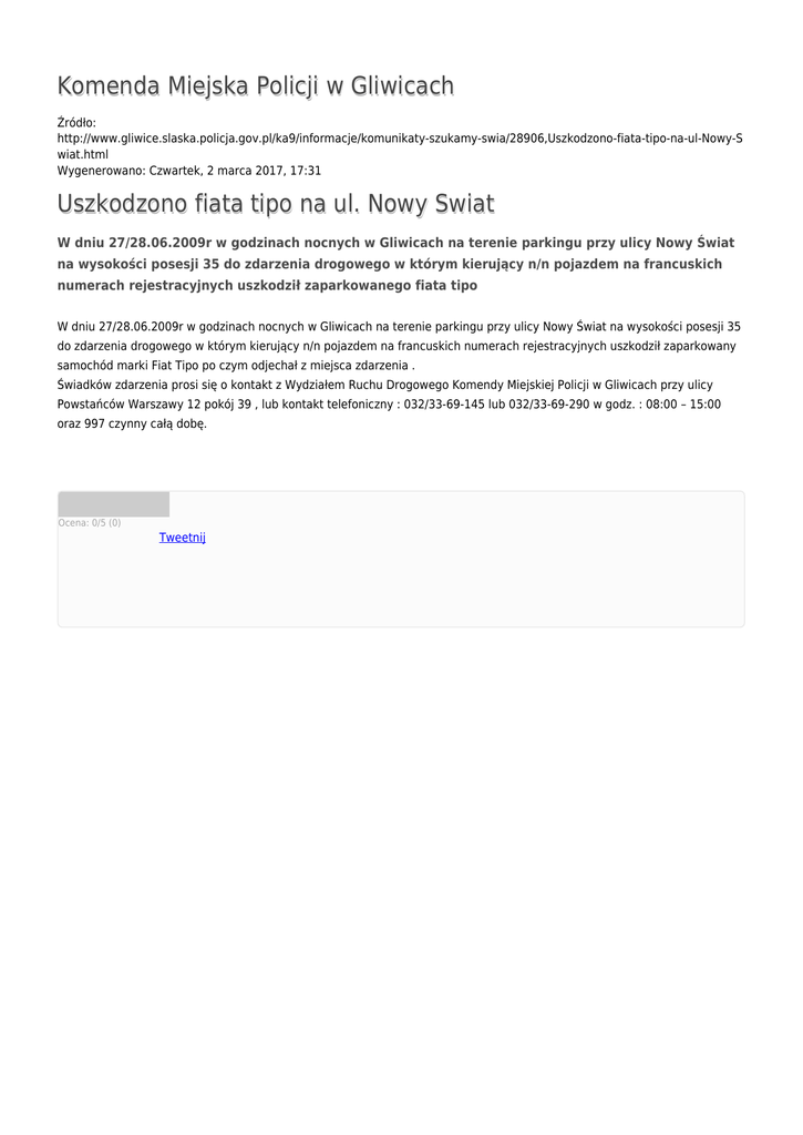 Komenda Miejska Policji w Gliwicach Źródło: http://www.gliwice.slaska.policja.gov.pl/ka9/informacje/komunikaty-szukamy-swia/28906,Uszkodzono-fiata-tipo-na-ul-Nowy-S wiat.html Wygenerowano: Czwartek, 2 marca 2017, 17:31 Uszkodzono fiata tipo na ul. Nowy Swiat W dniu 27/28.06.2009r w godzinach nocnych w Gliwicach na terenie parkingu przy ulicy Nowy Świat na wysokości posesji 35 do zdarzenia drogowego w którym kierujący n/n pojazdem na francuskich numerach rejestracyjnych uszkodził zaparkowanego fiata tipo W dniu 27/28.06.2009r w godzinach nocnych w Gliwicach na terenie parkingu przy ulicy Nowy Świat na wysokości posesji 35 do zdarzenia drogowego w którym kierujący n/n pojazdem na francuskich numerach rejestracyjnych uszkodził zaparkowany samochód marki Fiat Tipo po czym odjechał z miejsca zdarzenia . Świadków zdarzenia prosi się o kontakt z Wydziałem Ruchu Drogowego Komendy Miejskiej Policji w Gliwicach przy ulicy Powstańców Warszawy 12 pokój 39 , lub kontakt telefoniczny : 032/33-69-145 lub 032/33-69-290 w godz. : 08:00 – 15:00 oraz 997 czynny całą dobę. Ocena: 0/5 (0) Tweetnij