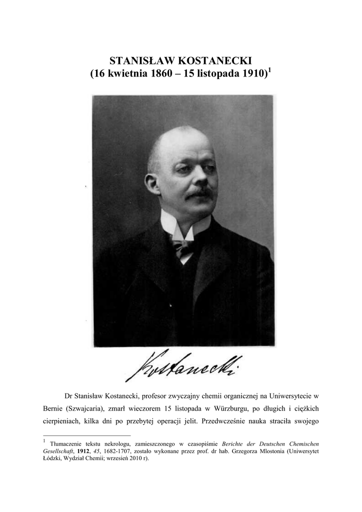 STANISŁAW KOSTANECKI (16 kwietnia 1860 – 15 listopada 1910)1 Dr Stanisław Kostanecki, profesor zwyczajny chemii organicznej na Uniwersytecie w Bernie (Szwajcaria), zmarł wieczorem 15 listopada w Würzburgu, po długich i cięŜkich cierpieniach, kilka dni po przebytej operacji jelit. Przedwcześnie nauka straciła swojego 1 Tłumaczenie tekstu nekrologu, zamieszczonego w czasopiśmie Berichte der Deutschen Chemischen Gesellschaft, 1912, 45, 1682-1707, zostało wykonane przez prof. dr hab. Grzegorza Mlostonia (Uniwersytet Łódzki, Wydział Chemii; wrzesień 2010 r). 2 wybitnego przedstawiciela, a ta strata jest szczególnie bolesna dla Uniwersytetu w Bernie, na którym Kostanecki prowadził z duŜym powodzeniem badania naukowe i kształcił studentów od ponad dwudziestu lat. Ja, jako uczeń profesora Kostaneckiego i jego wieloletni asystent, czuję się w obowiązku poświęcić mu we wdzięcznej pamięci tych kilka słów wspomnień. Nie mam pod ręką Ŝadnego zachowanego zdjęcia, Ŝadnego listu, które mogłyby mi pomóc przedstawić sylwetkę tego wyjątkowego, szlachetnego człowieka. Mam jednak zachowaną w pamięci jego postać, która niczym jak Ŝywa jawi mi przed oczyma; zapamiętam go na zawsze jako najlepszego nauczyciela, który przez okres ostatnich dwudziestu lat, odkąd związałem z nim mój los, był moim opiekunem i wiernym doradcą, a takŜe niezawodnym przyjacielem, który zawsze traktował mnie z ojcowską troskliwością. Stanisław Kostanecki urodził się w dniu 16 kwietnia 1860 roku, w miejscowości Myszaków, w obwodzie Słupcy (ówczesny zabór rosyjski na terenie Polski – przyp. tłumacza) jako syn tamtejszego ziemianina i jednocześnie najstarsze dziecko spośród pięciorga rodzeństwa. Po przedwczesnej śmierci ojca, matka musiała przejąć cały cięŜar wychowania dzieci. Było to wielkie wyzwanie dla tej szlachetnej kobiety, o której Kostanecki zawsze wyraŜał się niezwykle ciepło i z wielkim szacunkiem. Swój macierzyński obowiązek wypełniła ona z wielkim powodzeniem. Po pierwszym etapie edukacji, który Kostanecki odbył we własnej miejscowości, przeniósł się później do Poznania, gdzie przebywał pod troskliwą opieką jednej ze swoich ciotek. Najpierw ukończył tam szkołę średnią I stopnia, później nazywaną gimnazjum, w którym w roku 1881 uzyskał świadectwo dojrzałości. JuŜ w tej szkole, niezwykle uzdolniony młodzieniec pokazał cechy charakteru, które były widoczne w jego zachowaniu przez następne lata; szczególnie waŜną okazała się zdolność i skłonność do silnego, wewnętrznego skupienia. Uwielbiał on, inaczej niŜ jego rówieśnicy, głęboko analizować problemy matematyczne, fizyczne oraz inne związane z pokrewnymi dziedzinami. W późniejszych latach, w taki sam sposób, podchodził do rozwiązywania skomplikowanych problemów chemicznych. Kostanecki miał wielkie szczęście, Ŝe juŜ w szkole średniej spotkał wspaniałego nauczyciela przedmiotów ścisłych. Ogromne korzyści wyniósł z lekcji chemii prowadzonych przez prof. dr Th. Kruga, który rozbudzał wśród swoich uczniów wielkie zainteresowanie tym przedmiotem. Przez całe Ŝycie ’uczeń Kostanecki’ wspominał swojego nauczyciela z wielkim szacunkiem. Przypominam sobie jak pewnego dnia Kostanecki chodził w tę i z powrotem w swoim laboratorium; był wtedy niezwykle oŜywiony i czytał wciąŜ na nowo jakiś list, w 3 którym, jak się okazało, stary nauczyciel gratulował swojemu wychowankowi, osiągniętych ostatnio, sukcesów. Wyraźnie zadowolony tymi przejawami pamięci, Kostanecki powtarzał : ‘Nie mam wątpliwości, Ŝe to właśnie stary Krug był tym nauczycielem, którego zawsze będę wspominał z wielkim uznaniem; od niego nauczyłem się tak wiele ….’. Nawet pod koniec Ŝycia, w czasie swojej ostatniej choroby, odpowiadał na kaŜdy list swojego nauczyciela i między innymi, napisał mu wtedy: ‘Chemicznego myślenia nauczyłem się w szkole średniej, w Poznaniu’. Wdzięczność i trwała pamięć stanowiły wspaniałe cechy zmarłego mistrza. W czasie Wielkanocy 1881 roku, Kostanecki podjął studia w Berlinie. Tutaj, pracował najpierw w grupie prof. Finkenera w Akademii Górniczej, a następnie w grupie prof. C. Liebermanna na Politechnice. Uczęszczał na wykłady prowadzone przez tak wybitnych naukowców jak: A. W. Hofmann, Rammelsberg, Finkener, Liebermann, Schneider, Helmholtz, Paalzow oraz Weierstrass. O tym ostatnim mówił, Ŝe zapisał się na jego wykłady po to, aby nauczyć się matematyki; zamiast tego dowiedział się o wiele więcej na temat filozofii. Tak doświadczony naukowiec jak C. Liebermann szybko rozpoznał wielki talent w osobie swojego młodego współpracownika i dlatego awansował go w roku 1884 na stanowisko prywatnego asystenta, które następnie zostało zamienione na stanowisko drugiego asystenta dydaktycznego. W tym czasie C. Liebermann oraz S. Kostanecki wspólnie opublikowali wiele prac dotyczących chemii barwników. Dwie pierwsze publikacje dotyczyły badań przeprowadzonych z barwnikami azowymi. O wiele większe znaczenie posiadały późniejsze badania dotyczące Właściowości barwiących oraz metod syntezy hydroksyantrachinonów, które na zawsze powiązały nazwiska Liebermanna i Kostaneckiego z teorią barwników zaprawowych. KaŜdy z chemików pracujący w dziedzinie chemii organicznej powinien znać ‘Regułę Liebermanna i Kostaneckiego’, według której techniczne znaczenie posiadają tylko takie barwniki, w których dwie grupy hydroksylowe zajmują ‘pozycje alizarynowe’. Znaczenie tej reguły jest ciągle duŜe, niezaleŜnie od tego, Ŝe późniejsze badania doprowadziły do jej uściślenia i odpowiedniego rozszerzenia. Do serii opracowań w zakresie chemii barwników, odnosi się takŜe wiele publikacji na temat barwników zaprawowych, które Kostanecki przygotował później samodzielnie. Zanim omówię je szerzej, chciałbym wspomnieć pew