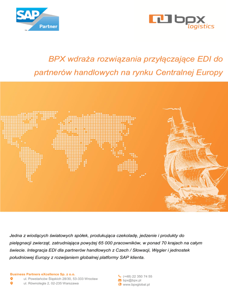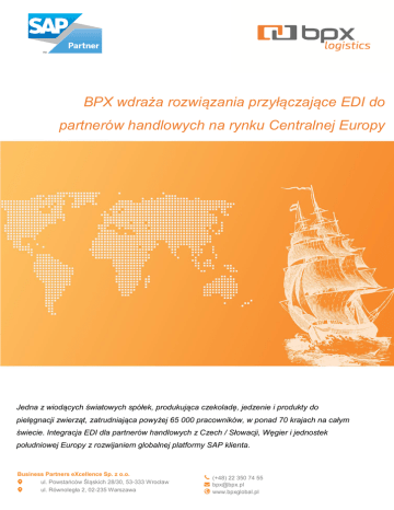 BPX wdraża rozwiązania przyłączające EDI do partnerów handlowych na rynku Centralnej Europy Jedna z wiodących światowych spółek, produkująca czekoladę, jedzenie i produkty do pielęgnacji zwierząt, zatrudniająca powyżej 65 000 pracowników, w ponad 70 krajach na całym świecie. Integracja EDI dla partnerów handlowych z Czech / Słowacji, Węgier i jednostek południowej Europy z rozwijaniem globalnej platformy SAP klienta. Business Partners eXcellence Sp. z o.o. ul. Powstańców Śląskich 28/30, 53-333 Wrocław ul. Równoległa 2, 02-235 Warszawa (+48) 22 350 74 55 [email protected] www.bpxglobal.pl Opis problemu Widząc rosnące zapotrzebowanie partnerów na komunikację EDI w tych sektorach oraz już istniejące pole partnerów zintegrowanych ze starszym systemem, oczywiste stało się, że jest to istotny etap projektu. BPX dostarczyło rozwiązanie, zapewniające całkowicie zintegrowany porządek w przepływie pieniężnym z partnerami EDI, umożliwiając poprawę wydajności i przejrzystości w sprzedaży i obsłudze klienta. Wymagania prawne, duża liczba partnerów i różne wymagania partnerów EDI klienta, sprawiły, że projekt był dużym wyzwaniem. Rozwiązanie problemu Trzydziestu partnerów EDI i łącznie 50 różnych interfejsów zostało zintegrowane z uwzględnieniem różnych wymagań każdego partnera. Dodatkowa logika w konsolidacji odwzorowań była niezbędna do redukcji kosztów związanych z dostawcą klienta EDI, w czasie zapewniania elastycznego rozwiązania wraz ze zrównoważonym rozwojem w razie przyszłych wymagań partnera. Uzyskany benefit Dzięki połączeniu wysiłków przedsiębiorstwa i grupy wdrożeniowej, projekt z sukcesem wszedł w życie w styczniu 2011 roku jako wskazany przez KPI. Wraz z partnerami EDI, BPX wdrożyło całkowicie zintegrowane rozwiązanie, pozwalające poprawić efektywność obsługi klienta poprzez usprawnienie porządku klienta w przepływie pieniężnym. Nowe rozwiązanie sprawiło, że komunikacja stała się szybsza i bardziej efektywna poprzez kolejne eliminowanie ręcznego przepływu pracy i ryzyka pomyłki z tym związanym. Kluczem do sukcesu była doskonała komunikacja pomiędzy każdym zespołem przez każdą fazę projektu. KONTAKT: (+48) 22 350 74 55 [email protected] www.bpxglobal.pl