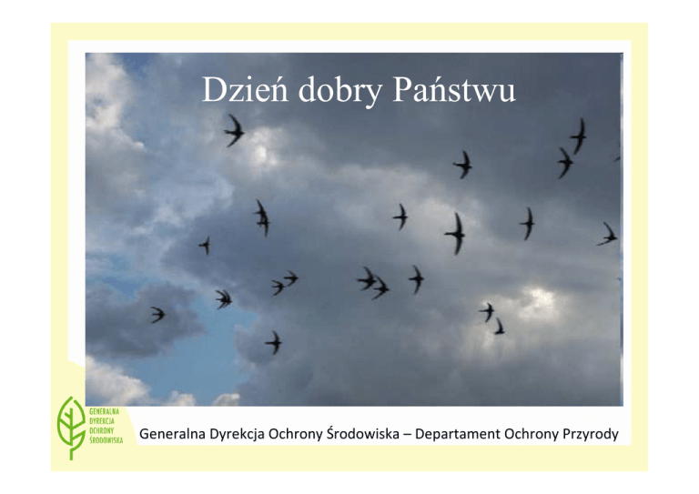 Dzień dobry Państwu Generalna Dyrekcja Ochrony Środowiska – Departament Ochrony Przyrody Niektóre obowiązujące przepisy dot. ochrony gatunkowej zwierząt, ze szczególnym uwzględnieniem problematyki dotyczącej ptaków i nietoperzy w mieście. Dyrektywa Ptasia • Dyrektywa Rady 79/409/EWG z dnia 2 kwietnia 1979 r. w sprawie ochrony dzikiego ptactwa • chroni wszystkie gatunki ptaków w stanie dzikim na terenie UE • w załączniku I są zamieszczone gatunki objęte szczególną ochroną Zakazy dyrektywy ptasiej • umyślnego zabijania lub chwytania jakimikolwiek metodami • umyślnego niszczenia lub uszkadzania ich gniazd i jaj lub usuwania gniazd • wybierania ich jaj dziko występujących oraz zatrzymywania tych jaj nawet gdy są puste • przetrzymywania ptactwa naleŜącego do gatunków, na których polowanie i których chwytanie jest zabronione • transportu w celu sprzedaŜy, przetrzymywania w celu sprzedaŜy, oferowania do sprzedaŜy i. in. (nie dotyczy gatunków z zał. III dyrektywy ptasiej) Zakazy dyrektywy ptasiej c. d. • umyślnego płoszenia tych ptaków, szczególnie w okresie lęgowym i wychowu młodych, jeśli mogłoby mieć to znaczenie do celów niniejszej dyrektywy z art. 2 Celem jest zachowanie populacji <wszystkich gatunków ptaków> na poziomie, który odpowiada w szczególności wymogom ekologicznym, naukowym i kulturowym, mając na uwadze wymogi ekonomiczne i rekreacyjne lub w celu dostosowania populacji tych gatunków do tego poziomu Niektóre akty prawne krajowe • ustawa z dnia 16 kwietnia o ochronie przyrody 2004, (Dz. U. 2009 r., Nr 151, poz. 1220, jednolity tekst) • rozporządzenie Ministra Środowiska z dnia 28 września 2004 r. w sprawie gatunków dziko występujących zwierząt objętych ochroną (Dz. U. Nr 220, poz. 2237) • ustawa z dnia 21 sierpnia 1997 r., o ochronie zwierząt (Dz. U. Nr 106, poz. 1002) art. 52 ustawy stanowi jakie zakazy mogą być wprowadzone, a § 6 rozporządzenia je wprowadza 1) umyślnego zabijania, okaleczania i chwytania; 1a) transportu, pozyskiwania, przetrzymywania, chowu i hodowli, a takŜe posiadania Ŝywych zwierząt; 2) zbierania, przetrzymywania i posiadania okazów gatunków; 1) zabijania, okaleczania, chwytania, transportu, pozyskiwania, przetrzymywania, a takŜe posiadania Ŝywych zwierząt; 2) zbierania, przetrzymywania i posiadania zwierząt martwych, w tym spreparowanych, a takŜe ich części i produktów pochodnych; art. 52 stawy a § 6 rozporządzenia c. d. 3) umyślnego niszczenia ich jaj, postaci młodocianych i form rozwojowych; 4) niszczenia ich siedlisk i ostoi; 5) niszczenia ich gniazd, mrowisk, nor, legowisk, Ŝeremi, tam, tarlisk, zimowisk i innych schronień; 3) niszczenia ich jaj, postaci młodocianych i form rozwojowych; 4) niszczenia ich siedlisk i ostoi; 5) niszczenia ich gniazd, mrowisk, nor, legowisk, Ŝeremi, tam, tarlisk, zimowisk i innych schronień; 6) wybierania, posiadania i przechowywania ich jaj; 7) wyrabiania, posiadania i przechowywania wydmuszek; 8) preparowania okazów gatunków; 9) zbywania, nabywania, oferowania do sprzedaŜy, wymiany i darowizny okazów gatunków; 6) wybierania, posiadania i przechowywania ich jaj; 7)wyrabiania, posiadania i przechowywania wydmuszek; 8) preparowania martwych zwierząt lub ich części, w tym znalezionych; 9) zbywania, nabywania, oferowania do sprzedaŜy, wymiany i darowizny zwierząt Ŝywych, martwych, przetworzonych i spreparowanych, a takŜe ich części i produktów pochodnych; art. 52 stawy a § 6 rozporządzenia c. d. 10)wwoŜenia z zagranicy i wywoŜenia poza granicę państwa okazów gatunków; 11) umyślnego płoszenia i niepokojenia; 12)fotografowania, filmowania i obserwacji, mogących powodować ich płoszenie lub niepokojenie; 13)przemieszczania z miejsc regularnego przebywania na inne miejsca; 14)przemieszczania urodzonych i hodowanych w niewoli do stanowisk naturalnych. 10)wwoŜenia z zagranicy i wywoŜenia poza granicę państwa zwierząt Ŝywych, martwych, przetworzonych i spreparowanych, a takŜe ich części i produktów pochodnych; 11) umyślnego płoszenia i niepokojenia; 12)fotografowania, filmowania i obserwacji mogących powodować płoszenie lub niepokojenie ptaków, przy nazwach których w załączniku nr 1 do rozporządzenia zamieszczono symbol "(1)", oraz nietoperzy; 13)przemieszczania z miejsc regularnego przebywania na inne miejsca; 14)przemieszczania urodzonych i hodowanych w niewoli do stanowisk naturalnych. zwolnienia od zakazów • odstępstwa od zakazów - nie wymagają zezwoleń • zezwolenia odpowiednich organów na wykonanie czynności zakazanych odstępstwa od zakazów z katalogu • art. 52 ust 2 stanowi jakie odstępstwa od zakazów mogą być wprowadzone a § 7 rozporządzenia je wprowadza • odstępstwo od zakazu jest moŜliwe po spełnieniu dwóch przesłanek 1) w przypadku braku rozwiązań alternatywnych 2) jeŜeli wykonywanie czynności nie spowoduje zagroŜenia dla dziko występujących populacji zwierząt objętych ochroną gatunkową art. 52 stawy a § 7 rozporządzenia c. d. odstępstwa od zakazów (bez zezwolenia) 1)usuwania od dnia 16 października do końca lutego gniazd z budek dla ptaków i ssaków; 2)usuwania od dnia 16 października do końca lutego gniazd ptasich z obiektów budowlanych i terenów zieleni, jeŜeli wymagają tego względy bezpieczeństwa lub sanitarne; 3)chwytania na terenach zabudowanych przez podmioty upowaŜnione przez regionalnego dyrektora ochrony środowiska zabłąkanych zwierząt i przemieszczania ich do miejsc regularnego przebywania; 1)usuwania od dnia 16 października do końca lutego gniazd z budek dla ptaków i ssaków; 2)usuwania od dnia 16 października do końca lutego gniazd ptasich z obiektów budowlanych i terenów zieleni, jeŜeli wymagają tego względy bezpieczeństwa lub sanitarne; 3)chwytania na terenach zabudowanych przez podmioty upowaŜnione przez wojewodę zabłąkanych zwierząt i przemieszania ich do miejsc regularnego pr