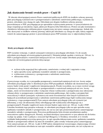 Jak skutecznie bronić swoich praw - Część II W obecnie obowiązującej ustawie Prawo zamówień publicznych (PZP) do środków ochrony prawnej, jakie przysługują wykonawcom w postępowaniach o udzielenie zamówienia publicznego, wymienia się: protest, odwołanie oraz skargę do sądu. Odwołanie jest drugim środkiem ochrony prawnej przewidzianym w PZP, przysługującym po uprzednim wykorzystaniu protestu i w przeciwieństwie do niego rozpatruje go niezależny organ, jakim jest Krajowa Izba Odwoławcza. Protest zaś jako instrument o charakterze informacyjno-reklamacyjnym rozpatrywany jest przez samego zamawiającego. Jednak aby móc skorzystać ze środków ochrony prawnej, takich jak odwołanie czy skarga do sądu, należy najpierw wnieść do zamawiającego protest w przewidzianym przez PZP terminie oraz w odpowiedniej formie. Kiedy przysługuje odwołanie PZP wyraźnie wskazuje, w jakich sytuacjach wykonawcy przysługuje odwołanie. Co do zasady odwołanie przysługuje od rozstrzygnięcia protestu[1]. Niemniej jednak zgodnie z treścią art. 184 ust. 1a PZP w postępowaniach o wartościach mniejszych niż tzw. kwoty unijne odwołanie przysługuje wyłącznie od rozstrzygnięcia protestu dotyczącego: wyboru trybu negocjacji bez ogłoszenia, zamówienia z wolnej ręki i zapytania o cenę, opisu sposobu oceny spełniania warunków udziału w postępowaniu, wykluczenia wykonawcy z postępowania o udzielenie zamówienia, odrzucenia oferty. Z powyższego wynika, że w przypadku postępowań o wartościach mniejszych niż tzw. kwoty unijne odwołanie przysługuje tylko w określonych przez PZP przypadkach. Jednakże tak skonstruowany zapis ustawy budzi wiele pytań i wątpliwości interpretacyjnych. Przede wszystkim, na co musi zwrócić uwagę wykonawca, chcąc wnieść odwołanie w postępowaniach o wartościach mniejszych niż tzw. kwoty unijne,, może on kwestionować tylko i wyłącznie własne wykluczenie z postępowania oraz odrzucenie własnej oferty w postępowaniu o udzielenie zamówienia publicznego. Jak wynika z przyjętej linii orzeczniczej w takich sytuacjach, wykonawca nie może kwestionować ofert innych wykonawców będących uczestnikami postępowania o udzielenie zamówienia publicznego bądź wykluczenia innego wykonawcy z tego postępowania[2].Tym samym odwołanie przysługuje tylko od czynności już dokonanej, a więc od odrzucenia oferty odwołującego lub wykluczenia odwołującego się z postępowania[3]. Ponadto wątpliwość może również budzić zapis treści art. 184 ust. 1a pkt 2 PZP. Literalne brzmienie tego przepisu wskazuje, że odwołanie przysługuje tylko na opis sposobu oceny spełniania warunków udziału w postępowaniu, nie zaś na sam opis postawionych przez zamawiającego warunków udziału w postępowaniu. Powyższa problematyka była również przedmiotem analizy orzecznictwa sądów okręgowych. Niestety, na dzień dzisiejszy orzecznictwo w tym zakresie nie do końca wydaje się spójne. I tak w jednym z orzeczeń Sąd Okręgowy w Świdnicy stwierdził, iż w świetle wykładni funkcjonalnej oczywistą sprawą jest, że opis sposobu dokonywania oceny spełnienia warunków udziału w postępowaniu odnieść się musi do warunków, jakie zostały wskazane przez zamawiającego. Tym samym przepis art. 184 ust. 1a pkt 2) PZP należy interpretować rozszerzająco, dopuszczając również możliwość wniesienia odwołania na sam opis warunków udziału w postępowaniu, nie zaś wyłącznie na opis sposobu ich oceny[4].W innym zaś orzeczeniu (postanowienie Sądu Okręgowego w Katowicach) możemy przeczytać, że: „Wykładnia rozszerzająca co do katalogu czynności, które podlegają zaskarżeniu odwołaniem, nie jest uprawniona w świetle obowiązującej zasady legalizmu oznaczającej w tym przypadku możliwość wnoszenia środka ochrony prawnej, jakim jest odwołanie, tylko w takim zakresie, jak dopuszcza to ustawodawca"[5].Zakładając, iż nie wypracowano jeszcze jednolitej linii orzeczniczej w przedstawionym zakresie, wykonawca, składając odwołanie, powinien pamiętać, że musi w nim podważać opis sposobu oceny spełniania warunków udziału w postępowaniu, nie zaś sam opis warunków udziału, w przeciwnym wypadku jego odwołanie może zostać odrzucone. Ponadto w przypadku postępowań o wartościach mniejszych niż tzw. kwoty unijne wykonawca może również złożyć odwołanie od rozstrzygnięcia protestu dotyczącego wyboru trybu negocjacji bez ogłoszenia, zamówienia z wolnej ręki i zapytania o cenę. W praktyce jednak podważenie np. trybu zamówienia z wolnej ręki może być trudne dla wykonawcy, gdyż zanim zdobędzie on wiedzę o prowadzonym przez zamawiającego postępowaniu w tym trybie, to najczęściej zamawiający zawrze już umowę na przedmiotowe zamówienie. W takich wypadkach wykonawcy pozostaje możliwość złożenia skargi do Prezesa Urzędu Zamówień Publicznych, który jest uprawniony do wszczęcia kontroli doraźnej[6] Wykonawca, składając odwołanie, powinien również pamiętać, że błędne pouczenie zawarte w rozstrzygnięciu protestu, o prawie wniesienia odwołania, pozostaje bez znaczenia dla skuteczności skorzystania przez wykonawcę z tego środka ochrony prawnej[7].Tym samym niezależnie od tego, czy wykonawca zostanie właściwie pouczony w rozstrzygnięciu protestu o przysługujących mu środkach ochrony prawnej, sam powinien zbadać, czy w świetle obowiązujących przepisów PZP w konkretnym stanie faktycznym przysługuje mu odwołanie. Kiedy i jak skutecznie wnosić odwołanie Zgodnie z treścią art. 184 ust. 2 ustawy Prawo zamówień publicznych odwołanie wnosi się do Prezesa Urzędu Zamówień Publicznych w terminie 10 dni od dnia doręczenia rozstrzygnięcia protestu lub upływu terminu rozstrzygnięcia protestu, a jeżeli wartość zamówienia jest mniejsza niż tzw. kwoty unijne - w terminie 5 dni, jednocześnie należy przekazać kopię treści odwołania zamawiającemu