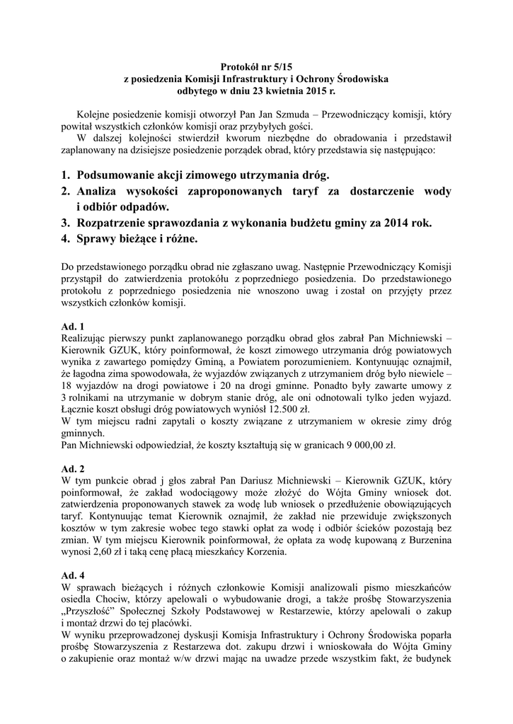 Protokół nr 5/15 z posiedzenia Komisji Infrastruktury i Ochrony Środowiska odbytego w dniu 23 kwietnia 2015 r. Kolejne posiedzenie komisji otworzył Pan Jan Szmuda – Przewodniczący komisji, który powitał wszystkich członków komisji oraz przybyłych gości. W dalszej kolejności stwierdził kworum niezbędne do obradowania i przedstawił zaplanowany na dzisiejsze posiedzenie porządek obrad, który przedstawia się następująco: 1. Podsumowanie akcji zimowego utrzymania dróg. 2. Analiza wysokości zaproponowanych taryf za dostarczenie wody i odbiór odpadów. 3. Rozpatrzenie sprawozdania z wykonania budżetu gminy za 2014 rok. 4. Sprawy bieżące i różne. Do przedstawionego porządku obrad nie zgłaszano uwag. Następnie Przewodniczący Komisji przystąpił do zatwierdzenia protokółu z poprzedniego posiedzenia. Do przedstawionego protokołu z poprzedniego posiedzenia nie wnoszono uwag i został on przyjęty przez wszystkich członków komisji. Ad. 1 Realizując pierwszy punkt zaplanowanego porządku obrad głos zabrał Pan Michniewski – Kierownik GZUK, który poinformował, że koszt zimowego utrzymania dróg powiatowych wynika z zawartego pomiędzy Gminą, a Powiatem porozumieniem. Kontynuując oznajmił, że łagodna zima spowodowała, że wyjazdów związanych z utrzymaniem dróg było niewiele – 18 wyjazdów na drogi powiatowe i 20 na drogi gminne. Ponadto były zawarte umowy z 3 rolnikami na utrzymanie w dobrym stanie dróg, ale oni odnotowali tylko jeden wyjazd. Łącznie koszt obsługi dróg powiatowych wyniósł 12.500 zł. W tym miejscu radni zapytali o koszty związane z utrzymaniem w okresie zimy dróg gminnych. Pan Michniewski odpowiedział, że koszty kształtują się w granicach 9 000,00 zł. Ad. 2 W tym punkcie obrad j głos zabrał Pan Dariusz Michniewski – Kierownik GZUK, który poinformował, że zakład wodociągowy może złożyć do Wójta Gminy wniosek dot. zatwierdzenia proponowanych stawek za wodę lub wniosek o przedłużenie obowiązujących taryf. Kontynuując temat Kierownik oznajmił, że zakład nie przewiduje zwiększonych kosztów w tym zakresie wobec tego stawki opłat za wodę i odbiór ścieków pozostają bez zmian. W tym miejscu Kierownik poinformował, że opłata za wodę kupowaną z Burzenina wynosi 2,60 zł i taką cenę płacą mieszkańcy Korzenia. Ad. 4 W sprawach bieżących i różnych członkowie Komisji analizowali pismo mieszkańców osiedla Chociw, którzy apelowali o wybudowanie drogi, a także prośbę Stowarzyszenia „Przyszłość” Społecznej Szkoły Podstawowej w Restarzewie, którzy apelowali o zakup i montaż drzwi do tej placówki. W wyniku przeprowadzonej dyskusji Komisja Infrastruktury i Ochrony Środowiska poparła prośbę Stowarzyszenia z Restarzewa dot. zakupu drzwi i wnioskowała do Wójta Gminy o zakupienie oraz montaż w/w drzwi mając na uwadze przede wszystkim fakt, że budynek użytkowany przez Stowarzyszenie jest własnością gminy. Natomiast prośba mieszkańców Chociwia dot. budowy nakładki na drodze w osiedlu zdaniem Komisji nie może zostać zrealizowana w tym roku z tego względu, że zadanie to nie było ujęte w budżecie gminy. W tym miejscu głos zabrał Pan Szmuda – Przewodniczący komisji, który zapytał w temacie zakupu ciągnika na potrzeby GZUK. Pan Kierownik odpowiedział, że potrzeba zakupu ciągnika jest bardzo duża, ale w budżecie GZUK nie ma na to zadanie przeznaczonych środków. Kolejno radny Stępnik pytał o koszty kruszenia gruzu powstałego po rozbiórce budynku byłej pralni. Odpowiadając na powyższe Pan Michniewski oznajmił, że nie było analizy związanej z kruszeniem gruzu powstałego po rozbiórce, ale dodał, że w przeszłości była wynajmowana kruszarka, gdzie koszt kruszenia ok. 1200 t gruzu kosztowało ok. 50 tys. zł. W związku z wyczerpaniem tematyki zaplanowanej na dzisiejsze posiedzenie, Pan Jan Szmuda – Przewodniczący komisji podziękował za udział w spotkaniu i zakończył obrady. Na tym protokół zakończono. Protokołowała: Emilia Konieczna Przewodniczący Komisji Infrastruktury i Ochrony Środowiska Jan Szmuda