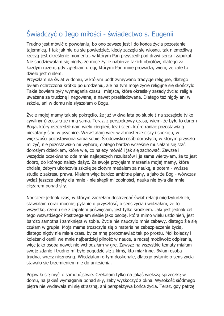 Świadczyć o Jego miłości - świadectwo s. Eugenii Trudno jest mówić o powołaniu, bo ono zawsze jest i do końca życia pozostanie tajemnicą. I tak jak nie da się powiedzieć, kiedy zaczęła się wiosna, tak niemożliwą rzeczą jest określenie momentu, w którym Pan przyszedł pod drzwi serca i zapukał. Nie spodziewałam się nigdy, że moje życie nabierze takich obrotów, dlatego za każdym razem, gdy zgłębiam drogi, którymi Pan mnie prowadzi, wiem, ze całe to dzieło jest cudem. Przyszłam na świat w domu, w którym podtrzymywano tradycje religijne, dlatego byłam ochrzczona krótko po urodzeniu, ale na tym moje życie religijne się skończyło. Takie bowiem były wymagania czasu i miejsca, które określały zasady życia: religia uważana za truciznę i negowana, a nawet prześladowana. Dlatego też nigdy ani w szkole, ani w domu nie słyszałam o Bogu. Życie mojej mamy tak się pokręciło, że już w dwa lata po ślubie ( na szczęście tylko cywilnym) została ze mną sama. Teraz, z perspektywy czasu, wiem, że było to darem Boga, który oszczędził nam wielu cierpień, łez i scen, które raniąc pozostawiają niezatarty ślad w psychice. Wzrastałam więc w atmosferze ciszy i spokoju, w większości pozostawiona sama sobie. Środowisko osób dorosłych, w którym przyszło mi żyć, nie pozostawiało mi wyboru, dlatego bardzo wcześnie musiałam się stać dorosłym dzieckiem, które wie, co należy mówić i jak się zachować. Zawsze i wszędzie oczekiwano ode mnie najlepszych rezultatów i ja sama wierzyłam, że to jest dobro, do którego należy dążyć. Za swoje przyjęłam marzenia mojej mamy, która chciała, żebym ukończyła szkołę ze złotym medalem za naukę, a potem - wyższe studia z zakresu prawa. Miałam więc bardzo ambitne plany, a jako że Bóg - wówczas wciąż jeszcze ukryty dla mnie - nie skąpił mi zdolności, nauka nie była dla mnie ciężarem ponad siły. Nadszedł jednak czas, w którym zaczęłam dostrzegać świat relacji międzyludzkich, stawiałam coraz mocniej pytanie o przyszłość, o sens życia i widziałam, że to wszystko, czemu się z zapałem poświęcam, jest tylko środkiem. Jaki jest jednak cel tego wszystkiego? Postrzegałam siebie jako osobę, która mimo wielu uzdolnień, jest bardzo samotna i zamknięta w sobie. Życie nie nauczyło mnie zabawy, dlatego źle się czułam w grupie. Moja mama troszczyła się o materialne zabezpieczenie życia, dlatego nigdy nie miała czasu by ze mną porozmawiać tak po prostu. Moi koledzy i koleżanki cenili we mnie najbardziej pilność w nauce, a raczej możliwość odpisania, więc jako osoba nawet nie wchodziłam w grę. Zawsze na wszystkie tematy miałam swoje zdanie i trudno mi było pogodzić się z kimś, kto miał inne. Byłam osobą trudną, wręcz nieznośną. Wiedziałam o tym doskonale, dlatego pytanie o sens życia stawało się brzemieniem nie do uniesienia. Pojawiła się myśl o samobójstwie. Czekałam tylko na jakąś większą sprzeczkę w domu, na jakieś wymagania ponad siły, żeby wyskoczyć z okna. Wysokość siódmego piętra nie wydawała mi się straszną, ani perspektywa końca życia. Teraz, gdy patrzę na to doświadczenie, wiem, że dzięki niemu mam większą wyrozumiałość do ludzi młodych, którzy nie radzą sobie sami z odpowiedzią na trudne pytania i często reagują buntem i wrogością do wszelkich systemów. Na własnej skórze doświadczyłam bowiem, że jedynie akceptacja i miłość może uratować człowieka, który się zbliża do krawędzi parapetu, na którym stoi. I właśnie w tym tak trudnym dla mnie momencie w moim życiu pojawili się ludzie, którzy wydawali mi się być inni, lepsi, ludzie, którzy robili coś, co było dla mnie niezrozumiałe - odkryli przede mną kotarę, która zasłaniała istnienie Kościoła w świecie otaczającym. Nagle do mojej świadomości dotarł fakt, że w moim rodzinnym mieście jest wiele kościołów, które nie stoją puste. Czasy się zmieniły i powoli do szkół wchodziła nauka religii. Pamiętam moją pierwszą "wizytę" w kościele. Weszłam za mamą i uczyniłam ręką zamoczoną w wodzie święconej znak podobny do tego, co ona, czyli znak krzyża, tylko że lewą ręką (ale dla mnie to nie miało znaczenia), zorientowałam się jednak, że coś było nie tak, gdy zobaczyłam zdziwioną minę księdza, który obserwował nas z konfesjonału. Jakiś czas po tym mama zadała mi pytanie, które mnie zaskoczyło: czy chciałabyś przystąpić do I Komunii Świętej? Dla mnie te słowa nie znaczyły wówczas nic. Zrozumiałam jedynie, że jest to coś, co w życiu można "zaliczyć" dodatkowo. Mama zapytała księdza, który przygotowywał dzieci w parafii do komunii świętej o wymagania i przekazała mi kartkę z kilkoma pytaniami katechizmowymi i modlitwami, których miałam się nauczyć na pamięć. Myślę, że w tym miejscu warto dodać, że językiem, w którym rozmawiałam od urodzenia i którym się posługiwałam na co dzień był język rosyjski, a modlitw miałam się nauczyć po polsku... była to dla mnie czarna magia. Nikt z moich najbliższych nie potrafił mi wytłumaczyć sensu tych modlitw, a mi też nie zależało na tym. Żadnej katechezy przygotowawczej nie było, więc nie rozumiałam nawet tego, czym w ogóle jest obrzęd przystępowania do komunii świętej. Pamiętam, że gdy drżąca ze strachu przed egzaminem, przyszłam do zakrystii, ksiądz kazał mi powiedzieć jakieś dwie modlitwy i wymienić istniejące sakramenty. Potem dowiedziałam się o terminie spowiedzi przedkomunijnej i o dniu komunii. Gdyby ktoś racjonalnie myślący zapytał mnie wówczas, po co to robię, ucząc się jakiejś "chińszczyzny" nie wiedziałabym co odpowiedzieć. A teraz wiem, i jestem przekonana, że było to pierwsze mocne pociągnięcie Bożej łaski. I w tym momencie można by napisać piękne zakończenie, ale na tym moja przygoda z Kościołem się nie skończ