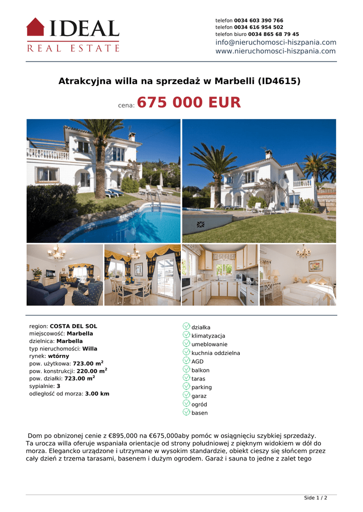 telefon 0034 603 390 766 telefon 0034 616 954 502 telefon biuro 0034 865 68 79 45 [email protected] www.nieruchomosci-hiszpania.com Atrakcyjna willa na sprzedaż w Marbelli (ID4615) cena: region: COSTA DEL SOL miejscowość: Marbella dzielnica: Marbella typ nieruchomości: Willa rynek: wtórny pow. użytkowa: 723.00 m2 pow. konstrukcji: 220.00 m2 pow. działki: 723.00 m2 sypialnie: 3 odległość od morza: 3.00 km 675 000 EUR działka klimatyzacja umeblowanie kuchnia oddzielna AGD balkon taras parking garaz ogród basen Dom po obnizonej cenie z €895,000 na €675,000aby pomóc w osiągnięciu szybkiej sprzedaży. Ta urocza willa oferuje wspaniała orientacje od strony południowej z pięknym widokiem w dół do morza. Elegancko urządzone i utrzymane w wysokim standardzie, obiekt cieszy się słońcem przez cały dzień z trzema tarasami, basenem i dużym ogrodem. Garaż i sauna to jedne z zalet tego Side 1 / 2 pieknego obiektu. Najbliższa plaża: 3 min. samochodem. Najbliższy bar / restauracja: 2 min. samochodem. www.nieruchomosci-hiszpania.com Side 2 / 2 Powered by TCPDF (www.tcpdf.org)