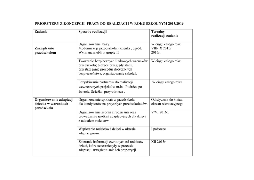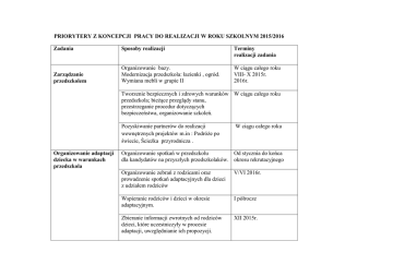 PRIORYTERY Z KONCEPCJI PRACY DO REALIZACJI W ROKU SZKOLNYM 2015/2016 Zadania Sposoby realizacji Terminy realizacji zadania Zarządzanie przedszkolem Organizowanie bazy. Modernizacja przedszkola: łazienki , ogród. Wymiana mebli w grupie II W ciągu całego roku VIII- X 2015r. 2016r. Tworzenie bezpiecznych i zdrowych warunków W ciągu całego roku przedszkola; bieżące przeglądy stanu, przestrzeganie procedur dotyczących bezpieczeństwa, organizowanie szkoleń. Pozyskiwanie partnerów do realizacji wewnętrznych projektów m.in : Podróże po świecie, Ścieżka przyrodnicza . Organizowanie adaptacji dziecka w warunkach przedszkola W ciągu całego roku Organizowanie spotkań w przedszkolu Od stycznia do końca dla kandydatów na przyszłych przedszkolaków. okresu rekrutacyjnego Organizowanie zebrań z rodzicami oraz prowadzenie spotkań adaptacyjnych dla dzieci z udziałem rodziców V/VI 2016r. Wspieranie rodziców i dzieci w okresie adaptacyjnym. I półrocze Zbieranie informacji zwrotnych od rodziców dzieci, które uczestniczyły w procesie adaptacji, uwzględnianie ich propozycji. XII 2015r. Współpraca z rodzicami Proponowanie rodzicom wypracowanych form współpracy: -zebranie ogólne -zebrania grupowe -,,popołudnia z rodzicami” -spotkania indywidualne podsumowujące obserwacje pedagogiczne -uroczystości -imprezy w ogrodzie -dyżury nauczycieli -dyżury specjalistów -rozmowy bieżące -współpraca z Radą Rodziców- działania, zebrania z radą pedagogiczną Włączanie rodziców w działania na rzecz przedszkola: -akcje charytatywne ,,Dary dla domu dziecka”, Wszystkie kolory świata, zbiórka nakrętek i inne wynikające z propozycji -galerie przedszkolne -akcje czytelnicze ,,Przeczytaj- podaj dalej” -,,goście w przedszkolu” Promowanie wśród rodziców wartości edukacji przedszkolnej. Współdziałanie z rodzicami w zakresie wspierania w rozwoju i wychowania ich dzieci, w tym również w ramach pomocy psychologiczno- pedagogicznej. 3 IX 2015r. 22, 23 IX 2015r., II, VI 2016r. od X 2015r. do V 2016r. X 2015r. V/VI 2016r. I, V 2016r. 25 IX 2015r, VI 2016r. Zgodnie z harmonogramem grup Zgodnie z ustaleniami, X, XII 2015, II, VI 2016r. XI- XII 2015r. II półrocze W ciągu roku szkolnego X/XI 2015r. IV 2016r. W ciągu całego roku Zgodnie z harmonogramem ustalonym we wrześniu W ciągu całego roku W ciągu całego roku. Uwzględnianie podczas spotkań i zebrań problematyki radzenia sobie przez dzieci z emocjami w sytuacjach trudnych. Współpraca ze środowiskiem lokalnym Włączanie do planu działań ogólnoprzedszkolnych inicjatyw rodziców. W ciągu całego roku. Promowanie wśród rodziców zagadnień bezpieczeństwa żywności i żywienia – zebrania grupowe, rozmowy indywidualne, materiały na stronie internetowej oraz e-mailowe, zajęcia kulinarne. W ciągu całego okresu realizacji koncepcji Zbieranie opinii rodziców o pracy przedszkola. -oczekiwania IX 2015r. -adaptacja XI 2015r. -losy wychowanków XII 2015 -,,popołudnia z rodzicami” X 2015r. -V 2016r. -ewaluacja wewnętrzna- II, VI 2016r. Kontynuacja współpracy ze szkołami, placówkami oświatowymi, instytucjami w najbliższym rejonie. W ciągu całego roku zgodnie z przyjętymi ustaleniami. Organizowanie akcji, przedsięwzięć na rzecz środowiska, uczestniczenie w akcjach charytatywnych. Zgodnie z propozycjami/ ofertami Promowanie wychowania przedszkolnego w środowisku poprzez m.in. informowanie o W ciągu całego roku działalności przedszkola na stronach internetowych, zajęć modelowych, uczestnictwie w projektach warszawskich i imprez w ogrodzie. ZADANIA WIODĄCE DO PRACY WYCHOWAWCZO- DYDAKTYCZNEJ W ROKU SZKOLNYM 2015/2016. Zadania wiodące do planu rocznego. Sposoby realizacji Zdrowie i bezpieczeństwo Organizowanie działań edukacyjnych związanych z bezpieczeństwem żywności oraz zdrowym żywieniem poprzez: - realizacji tematów kompleksowych -spotkań z lekarzem, kucharką i dietetykiem -realizacji projektu Akademia przedszkolaka -zajęcia edukacyjne,,Mały Ratownik” -organizowanie sytuacji służących kształtowaniu dobrych manier przy jedzeniu -akcje prozdrowotne: fluoryzacja, przegląd -usamodzielnianie w zakresie przygotowywania i spożywania posiłku z podanych produktówśniadania, podwieczorki. Systematyczne organizowanie różnorodnych form zabaw i ćwiczeń ruchowych: -zabawy ruchowe w grupach -ćwiczenia ruchowe w sali gimnastycznej -zajęcia dodatkowe dla dzieci – gimnastyka -zajęcia ruchowe z trenerami Varsovii -udział w imprezach sportowych proponowanych przez MOS i Polonię -uwzględnianie tematyki aktywności ruchowej planowaniu działań ogólnoprzedszkolnych tj: imprezy w ogrodzie, ,,popołudnia z rodzicami” Uczenie bezpiecznych zachowań poprzez; -realizację tematów kompleksowych - realizacji projektu Akademia przedszkolaka -organizowanie spotkań z policją - zorganizowanie zajęć edukacyjnych ze Strażą Miejską ,,Moje pierwsze kroki ze Strażą Miejską” -realizacja zewnętrznych projektów tj: Bezpieczny przedszkolak -promowanie działalności służb mundurowych Świat wokół nas Stwarzanie warunków do dostarczania wiedzy o świecie przyrody: -tematy kompleksowe -zajęcia biblioteczne -warsztaty z gośćmi -obserwacje przyrodnicze -spacery/ wycieczki -zabawy badawcze- żywioły Dostarczanie wiedzy o najbliższym otoczeniu przedszkola- Warszawie oraz kraju ojczystym i odległym świecie: -tematy kompleksowe -spotkania z gośćmi -zajęcia biblioteczne -literatura dot. zagadnienia -realizacja projektu wewnętrznego ,,Podróże po świecie -warsztaty kulturowe W realizacji pracy przygotowywanie dzieci do aktywnego uczestnictwa w kulturze i odbioru sztuki: muzyka, taniec, teatr, plastyka: -warsztaty z gośćmi -teatrzyki/koncerty -zajęcia biblioteczne/ w muzeum -spektakl globalny Poszerzanie wiedzy dzieci w zagadnieniach wynikających z zainteresowań i potrzeb np.: architektura, technika, kosmos: -uwzględnianie w tematach kompleksowych -st