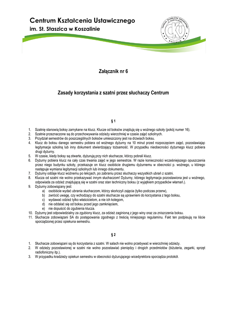 Centrum Kształcenia Ustawicznego im. St. Staszica w Koszalinie Załącznik nr 6 Zasady korzystania z szatni przez słuchaczy Centrum §1 1. 2. 3. 4. Szatnię stanowią boksy zamykane na klucz. Klucze od boksów znajdują się u woźnego szkoły (pokój numer 16). Szatnie przeznaczone są do przechowywania odzieży wierzchniej w czasie zajęć szkolnych. Przydział semestrów do poszczególnych boksów umieszczony jest na drzwiach boksu. Klucz do boksu danego semestru pobiera od woźnego dyżurny na 10 minut przed rozpoczęciem zajęć, pozostawiając legitymacje szkolną lub inny dokument stwierdzający tożsamość. W przypadku nieobecności dyżurnego klucz pobiera drugi dyżurny. 5. W czasie, kiedy boksy są otwarte, dyżurują przy nich słuchacze, którzy pobrali klucz. 6. Dyżurny pobiera klucz na cały czas trwania zajęć w jego semestrze. W razie konieczności wcześniejszego opuszczenia przez niego budynku szkoły, przekazuje on klucz osobiście drugiemu dyżurnemu w obecności p. woźnego, u którego następuje wymiana legitymacji szkolnych lub innego dokumentu. 7. Dyżurny oddaje klucz woźnemu po lekcjach, po zabraniu przez słuchaczy wszystkich ubrań z szatni. 8. Klucza od szatni nie wolno przekazywać innym słuchaczom! Dyżurny, którego legitymacja pozostawiona jest u woźnego, odpowiada za odzież znajdującą się w szatni oraz stan techniczny boksu (z wyjątkiem przypadków włamań.). 9. Dyżurny zobowiązany jest: a) osobiście wydać ubrania słuchaczom, którzy skończyli zajęcia (tylko podczas przerw), b) zwrócić uwagę, czy wchodzący do szatni słuchacze są uprawnieni do korzystania z tego boksu, c) wydawać odzież tylko właścicielom, a nie ich kolegom, d) nie oddalać się od boksu przed jego zamknięciem, e) nie dopuścić do zgubienia klucza. 10. Dyżurny jest odpowiedzialny za zgubiony klucz, za odzież zaginioną z jego winy oraz za zniszczenia boksu. 11. Słuchacze zobowiązani SA do postępowania zgodnego z treścią niniejszego regulaminu. Fakt ten podpisują na liście sporządzonej przez opiekuna semestru. §2 1. 2. 3. Słuchacze zobowiązani są do korzystania z szatni. W salach nie wolno przebywać w wierzchniej odzieży. W odzieży pozostawionej w szatni nie wolno pozostawiać pieniędzy i drogich przedmiotów (biżuteria, zegarki, sprzęt radiofoniczny itp.). W przypadku kradzieży opiekun semestru w obecności dyżurującego wicedyrektora sporządza protokół.