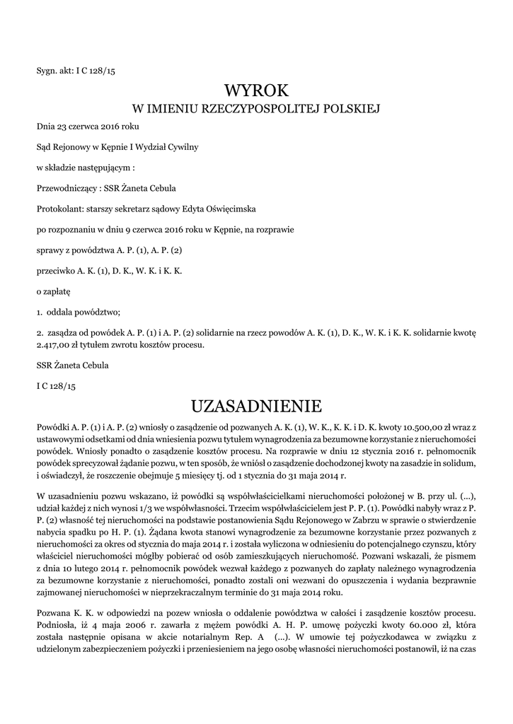 Sygn. akt: I C 128/15 WYROK W IMIENIU RZECZYPOSPOLITEJ POLSKIEJ Dnia 23 czerwca 2016 roku Sąd Rejonowy w Kępnie I Wydział Cywilny w składzie następującym : Przewodniczący : SSR Żaneta Cebula Protokolant: starszy sekretarz sądowy Edyta Oświęcimska po rozpoznaniu w dniu 9 czerwca 2016 roku w Kępnie, na rozprawie sprawy z powództwa A. P. (1), A. P. (2) przeciwko A. K. (1), D. K., W. K. i K. K. o zapłatę 1. oddala powództwo; 2. zasądza od powódek A. P. (1) i A. P. (2) solidarnie na rzecz powodów A. K. (1), D. K., W. K. i K. K. solidarnie kwotę 2.417,00 zł tytułem zwrotu kosztów procesu. SSR Żaneta Cebula I C 128/15 UZASADNIENIE Powódki A. P. (1) i A. P. (2) wniosły o zasądzenie od pozwanych A. K. (1), W. K., K. K. i D. K. kwoty 10.500,00 zł wraz z ustawowymi odsetkami od dnia wniesienia pozwu tytułem wynagrodzenia za bezumowne korzystanie z nieruchomości powódek. Wniosły ponadto o zasądzenie kosztów procesu. Na rozprawie w dniu 12 stycznia 2016 r. pełnomocnik powódek sprecyzował żądanie pozwu, w ten sposób, że wniósł o zasądzenie dochodzonej kwoty na zasadzie in solidum, i oświadczył, że roszczenie obejmuje 5 miesięcy tj. od 1 stycznia do 31 maja 2014 r. W uzasadnieniu pozwu wskazano, iż powódki są współwłaścicielkami nieruchomości położonej w B. przy ul. (...), udział każdej z nich wynosi 1/3 we współwłasności. Trzecim współwłaścicielem jest P. P. (1). Powódki nabyły wraz z P. P. (2) własność tej nieruchomości na podstawie postanowienia Sądu Rejonowego w Zabrzu w sprawie o stwierdzenie nabycia spadku po H. P. (1). Żądana kwota stanowi wynagrodzenie za bezumowne korzystanie przez pozwanych z nieruchomości za okres od stycznia do maja 2014 r. i została wyliczona w odniesieniu do potencjalnego czynszu, który właściciel nieruchomości mógłby pobierać od osób zamieszkujących nieruchomość. Pozwani wskazali, że pismem z dnia 10 lutego 2014 r. pełnomocnik powódek wezwał każdego z pozwanych do zapłaty należnego wynagrodzenia za bezumowne korzystanie z nieruchomości, ponadto zostali oni wezwani do opuszczenia i wydania bezprawnie zajmowanej nieruchomości w nieprzekraczalnym terminie do 31 maja 2014 roku. Pozwana K. K. w odpowiedzi na pozew wniosła o oddalenie powództwa w całości i zasądzenie kosztów procesu. Podniosła, iż 4 maja 2006 r. zawarła z mężem powódki A. H. P. umowę pożyczki kwoty 60.000 zł, która została następnie opisana w akcie notarialnym Rep. A (...). W umowie tej pożyczkodawca w związku z udzielonym zabezpieczeniem pożyczki i przeniesieniem na jego osobę własności nieruchomości postanowił, iż na czas zabezpieczenia ta pozostaje we władaniu K. K. bezpłatnie. Pozwana zatem włada przedmiotową nieruchomością na podstawie umowy zawartej z H. P. (1) i ponosi koszty jej utrzymania. Wniosła również o zawieszenie postępowania do czasu prawomocnego zakończenia sprawy toczącej się przed Sądem Okręgowym w Kaliszu w sprawie I C 1720/14 prowadzonej z powództwa K. K. przeciwko powódkom o zobowiązanie do złożenia oświadczenia woli przenoszącego na rzecz K. K. udział wynoszący po 1/3 w sprawie własności nieruchomości Pozwany D. K. w odpowiedzi na pozew również wniósł o oddalenie powództwa, zasądzenie kosztów procesu oraz zawieszenie postępowania do czasu prawomocnego zakończenia sprawy I C 1720/14. Podniósł, iż nie zamieszkuje w domu położonym w B., nie korzysta również z nieruchomości w inny sposób, zamieszkuje wraz z rodzicami w R., gdzie skupia się centrum jego życia rodzinnego i społecznego. Pozwani W. K. i A. K. (1) w odpowiedzi na pozew również wnieśli o oddalenie powództwa, zasądzenie kosztów procesu, zawieszenie postępowania do czasu prawomocnego zakończenia sprawy I C 1720/14. Podnieśli, iż nie zamieszkują w domu położonym w B., zamieszkują w R. wraz ze swoim synem D. K., tam też skupia się centrum ich życia rodzinnego i społecznego. Wszyscy pozwani wnieśli ponadto o przekazanie sprawy do Sądu Rejonowego w Kępnie jako miejscowo właściwego ze względu na położenie nieruchomości, której dotyczy spór. Postanowieniem z dnia 24 marca 2015 r. Sąd Rejonowy w Zabrzu przekazał sprawę do rozpoznania tut. Sądowi. Pismem procesowym z dnia 13 marca 2015 r. powódki podniosły, iż umowa z dnia 4 maja 2006 r. zawarta pomiędzy pozwaną K. K., a H. P. (1) jest nieważna, gdyż przeniesienie własności nieruchomości może nastąpić tylko w formie aktu notarialnego, a umowa ta została zawarta w zwykłej formie pisemnej. Natomiast zawarta w formie aktu notarialnego umowa pożyczki i przeniesienia własności z dnia 9 maja 2006 r. nie przewiduje postanowienia, że na czas zabezpieczenia nieruchomość ta pozostaje we władaniu K. K. bezpłatnie. Stąd też należy wnioskować, iż wolą stron nie było powierzenie pozwanej prawa bezpłatnego korzystania z nieruchomości. Nadto podniosły, iż gdyby nawet przyznać, iż umowa użyczenia zawarta z H. P. (1) była ważna to wygasła ona z chwilą jego śmierci, zaś spadkobiercy H. P. (1) nie zawierali z pozwaną K. K. żadnej umowy uprawniającej jej do korzystania z nieruchomości. Nadto powódki zaprzeczyły, aby pozwani A. i W. K. oraz D. K. zamieszkiwali w R.. Pozwani w odpowiedzi na pisma podtrzymali swoje stanowiska w sprawie. Sąd ustalił następujący stan faktyczny: Pozwani W. i A. K. (2) zakupili w latach 90 – tych nieruchomość położoną w B. przy ul. (...), zabudowaną wówczas budynkiem jednorodzinnym w stanie surowym, a objętą księgą wieczystą Kw (...) prowadzoną przez Sąd Rejonowy w Kępnie. Zakupu domu dokonali z myślą, aby przekazać go później córce, jak również dlatego aby być bliżej rodziców mieszkających w P. gm. C.. Pozwani zamieszkiwali wówczas na stałe w R.. Początkowo w domu tym nikt nie mieszkał, dopiero po kilku latach wprowadziła się do niego pozwana K. K.. Pozwany D. K. zamieszkał w domu w B. przynaj