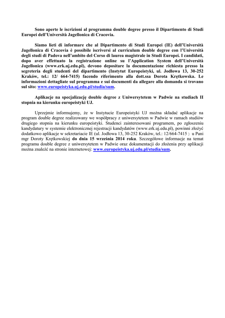 Sono aperte le iscrizioni al programma double degree presso il Dipartimento di Studi Europei dell’Università Jagellonica di Cracovia. Siamo lieti di informare che al Dipartimento di Studi Europei (IE) dell’Università Jagellonica di Cracovia è possibile iscriversi al curriculum double degree con l’Università degli studi di Padova nell’ambito del Corso di laurea magistrale in Studi Europei. I candidati, dopo aver effettuato la registrazione online su l’Application System dell’Università Jagellonica (www.erk.uj.edu.pl), devono depositare la documentazione richiesta presso la segreteria degli studenti del dipartimento (Instytut Europeistyki, ul. Jodłowa 13, 30-252 Kraków, tel.: 12/ 664-7415) facendo riferimento alla dott.ssa Dorota Krętkowska. Le informazioni dettagliate sul programma e sui documenti da allegare alla domanda si trovano sul sito: www.europeistyka.uj.edu.pl/studia/sum. Aplikacje na specjalizację double degree z Uniwersytetem w Padwie na studiach II stopnia na kierunku europeistyki UJ. Uprzejmie informujemy, że w Instytucie Europeistyki UJ można składać aplikacje na program double degree realizowany we współpracy z uniwersytetem w Padwie w ramach studiów drugiego stopnia na kierunku europeistyki. Studenci zainteresowani programem, po zgłoszeniu kandydatury w systemie elektronicznej rejestracji kandydatów (www.erk.uj.edu.pl), powinni złożyć dodatkowo aplikacje w sekretariacie IE (ul. Jodłowa 13, 30-252 Kraków, tel.: 12/664-7415 ) u Pani mgr Doroty Krętkowskiej do dnia 15 września 2014 roku. Szczegółowe informacje na temat programu double degree z uniwersytetem w Padwie oraz dokumentacji do złożenia przy aplikacji można znaleźć na stronie internetowej: www.europeistyka.uj.edu.pl/studia/sum.