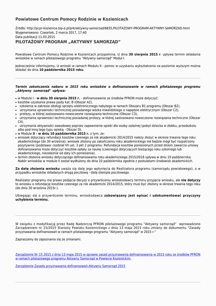 Powiatowe Centrum Pomocy Rodzinie w Kozienicach Źródło: http://pcpr-kozienice.bip-e.pl/prk/aktywny-samorzad/6835,PILOTAZOWY-PROGRAM-AKTYWNY-SAMORZAD.html Wygenerowano: Czwartek, 2 marca 2017, 17:40 Data publikacji 11.03.2015 PILOTAŻOWY PROGRAM „AKTYWNY SAMORZĄD” Powiatowe Centrum Pomocy Rodzinie w Kozienicach przypomina, iż dnia 30 sierpnia 2015 r. upływa termin składania wniosków w ramach pilotażowego programu "Aktywny samorząd" Moduł I. Jednocześnie informujemy, iż wnioski w ramach Modułu II - pomoc w uzyskaniu wykształcenia na poziomie wyższym można składać do dnia 10 października 2015 roku. Termin zakończenia naboru w 2015 roku wniosków o dofinansowanie w ramach pilotażowego programu „Aktywny samorząd" upływa: ● ● ● ● ● ● ● ● ● ● w Module I - w dniu 30 sierpnia 2015 r. - dofinansowanie ze środków PFRON może dotyczyć: kosztów uzyskania prawa jazdy kat. B (Obszar A2), szkolenia w zakresie obsługi sprzętu elektronicznego nabytego w ramach Obszaru B1 programu (Obszar B2), utrzymania sprawności technicznej posiadanego wózka inwalidzkiego o napędzie elektrycznym (Obszar C2), protezy, w której zastosowano nowoczesne rozwiązania techniczne (Obszar C3), utrzymania sprawności technicznej posiadanej protezy, w której zastosowano nowoczesne rozwiązania techniczne (Obszar C4), utrzymania aktywności zawodowej poprzez zapewnienie opieki dla osoby zależnej (pobyt dziecka w żłobku, przedszkolu albo pod inną tego typu opieką - Obszar D). w Module II - w dniu 10 października 2015 r. z tym, że: wniosek dotyczący refundacji kosztów czesnego za rok akademicki 2014/2015 należy złożyć w okresie trwania tego roku akademickiego (do 30 września); wniosek złożony po zakończeniu roku akademickiego nie będzie mógł być rozpatrzony pozytywnie (podstawa: rozdział VII ust. 3 pkt 2 programu: Refundacja kosztów poniesionych przed dniem zawarcia umowy dofinansowania może dotyczyć kosztów opłaty za naukę (czesnego) dotyczących bieżącego roku szkolnego lub akademickiego, niezależnie od daty ich poniesienia). termin złożenia wniosku dotyczącego dofinansowania roku akademickiego 2015/2016 upływa w dniu 10 października. Nabór wniosków w module II został wydłużony do dnia 10 października zgodnie z postulatami środowisk akademickich. Za datę złożenia wniosku uważa się datę jego wpłynięcia do Realizatora programu (samorządu powiatowego), a w przypadku wniosków składanych drogą pocztową - datę stempla pocztowego. Realizator programu ma prawo podjęcia decyzji o przywróceniu wnioskodawcy terminu przyjęcia wniosku, ale nie dotyczy to wniosku o refundację kosztów czesnego za rok akademicki 2014/2015, który musi być złożony w okresie trwania tego roku (do dnia 30 września 2015r.). Ubiegając się o przywrócenie terminu, wnioskodawca zobowiązany jest opisać i udokumentować przyczyny uchybienia terminu. W związku z modyfikacją przez Radę Nadzorczą PFRON pilotażowego programu "Aktywny samorząd" wprowadzono Zarządzeniem nr 15/2015 Starosty Powiatu Kozienickiego z dnia 13 maja 2015 roku zmiany do dokumentu "Zasady przyznawania dofinansowań w ramach pilotażowego programu "Aktywny samorząd" w 2015 r." Zapraszamy do zapoznania się ze zmianami. Zarządzenie Nr 15 2015 z dnia 13 maja 2015 w sprawie zasad przyznawania dofinansowania w 2015 roku ze środków PFRON w ramach pilotażowego programu Aktywny Samorząd w Powiecie Kozienickim. Zarządzenie Zasady przyznawania dofinansowań-Aktywny Samorząd 2015 Powiatowe Centrum Pomocy Rodzinie w Kozienicach informuje, iż dnia 09 marca 2015 roku pomiędzy Powiatem Kozienickim a Państwowym Funduszem Rehabilitacji Osób Niepełnosprawnych podpisany został Aneks nr 7 do umowy nr AS3/000013/07/D z dnia 25 kwietnia 2013 roku w sprawie realizacji pilotażowego programu „Aktywny samorząd” przyznający środki PFRON na realizację ww. programu. Program realizowany jest przez Powiatowe Centrum Pomocy Rodzinie w Kozienicach. Formy wsparcia przewidziane w Programie adresowane są do uprawnionych osób fizycznych. Dotyczą likwidacji barier ograniczających społeczne i zawodowe funkcjonowanie osób niepełnosprawnych i obejmują następujące obszary wsparcia: 1. Moduł I – likwidacja barier utrudniających aktywizację społeczną i zawodową, w tym: a. Obszar A – likwidacja bariery transportowej: Zadanie 2: pomoc w uzyskaniu prawa jazdy kategorii B, b. Obszar B – likwidacja barier w dostępie do uczestniczenia w społeczeństwie informacyjnym: ❍ ● Zadanie 2: dofinansowanie szkoleń w zakresie obsługi nabytego w ramach programu sprzętu elektronicznego i oprogramowania, a. Obszar C – likwidacja barier w poruszaniu się: ● ● ● Zadanie 2: pomoc w utrzymaniu sprawności technicznej posiadanego wózka inwalidzkiego o napędzie elektrycznym, Zadanie 3: pomoc w zakupie protezy kończyny, w której zastosowano nowoczesne rozwiązania techniczne, tj. protezy co najmniej na III poziomie jakości, Zadanie 4: pomoc w utrzymaniu sprawności technicznej posiadanej protezy kończyny w której zastosowano nowoczesne rozwiązania techniczne, (co najmniej na III poziomie jakości), a. Obszar D – pomoc w utrzymaniu aktywności zawodowej poprzez zapewnienie opieki dla osoby zależnej; 1. Moduł II – pomoc w uzyskaniu wykształcenia na poziomie wyższym. UWAGA !!! Wnioski o dofinansowanie kosztów nauki na poziomie wyższym Moduł II można składać w Powiatowym Centrum Pomocy Rodzinie w Kozienicach od dnia 10 marca 2015 roku do: ● ● dnia 30 marca w ramach I etapu; dnia 30 września w ramach II etapu Wnioski o dofinansowanie w ramach Moduł I przyjmowane są w od dnia 10 marca 2015 roku w trybie ciągłym do dnia 30 sierpnia 2015 roku. Poniższa tabela przedstawia zestawienie obszarów, adresatów programu, kwot dofinansowań i wysokości udziału własnego w poszczególnych zadaniach w ramach programu. Moduł Obszar Zadanie Zakres dofinansowania 