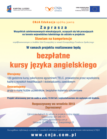 CNJA Edukacja spó³ka jawna Zaprasza Wszystkich zainteresowanych mieszkaj¹cych, ucz¹cych siê lub pracuj¹cych na terenie województwa lubelskiego do udzia³u w projekcie Stawiam na kompetencje wspó³finansowanym ze œrodków Unii Europejskiej w ramach Europejskiego Funduszu Spo³ecznego W ramach projektu realizowane bêd¹ bezp³atne kursy jêzyka angielskiego Oferujemy: 120 godzinne kursy zakoñczone egzaminem TELC, prowadzone przez wyszkolon¹ kadrê o wysokich kwalifikacjach i doœwiadczeniu zawodowym Gwarantujemy: grupy o ma³ej liczbie uczestników, bezp³atne materia³y szkoleniowe Projekt skierowany jest do osób w wieku 18-64 lat z wykszta³ceniem nie wy¿szym ni¿ œrednie. Rozpoczynamy we wrzeœniu 2013 Zapraszamy! Zg³oszenia chêtnych do udzia³u w projekcie mo¿na sk³adaæ: telefonicznie: 607-049-171 e-mailem : [email protected] listownie: 20-706 Lublin, ul. Œnie¿yñskiego 31 Szczegó³owe informacje o projekcie i zasadach rekrutacji zamieszczone s¹ na stronie internetowej CNJA www.cnja.com.pl