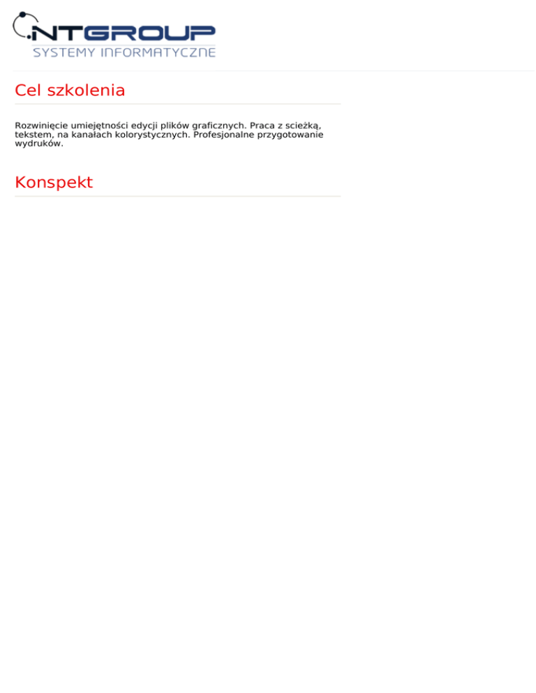 Cel szkolenia Rozwinięcie umiejętności edycji plików graficznych. Praca z scieżką, tekstem, na kanałach kolorystycznych. Profesjonalne przygotowanie wydruków. Konspekt Program szkolenia: 1. Powtórzenie podstaw. 2. Konfigurowanie interfejsu. 3. Rodzaje plików. 4. Skanowanie zdjęć. 5. Praca z maskami i warstwami. a. Tworzenie i edycja masek, 6. Szparowanie a. Praca ze ścieżką, b. Praca z tekstem. 7. Kolor i filtry a. Modele kolorów, b. Operacje obrysu i wypełnienia, c. Filtry na maskach i warstwach, 8. Praca na kanałach kolorystycznych, 9. Profesjonalne przygotowanie i wydruk bitmap a. Rozdzielczość, jakość, b. Funkcje dopasowywania, c. Język postscriptu. 10. Drukowanie i separacje barwne. Dodatkowe informacje W cenę szkolenia wliczony jest: Certyfikat ukończenia szkolenia NT Group Sp. z o.o. Materiały szkoleniowe, notatnik, długopis Kontakt z trenerem po szkoleniu Kawa, herbata, słodki poczęstunek Obiad Firma posiada wpis w Urzędzie Miasta Łodzi jako placówka kształcenia ustawicznego. Nazwa: Szkolenie Adobe Photoshop – operacje zaawansowane Czas trwania: 2 dni Ilość godzin: 16 Język: Prowadzący: Wykształcony grafik z 20 letnim doświadczeniem zawodowym w dziedzinie grafiki komputerowej oraz wykładowca programów graficznych od 14 lat. Lokalizacja: NT Group Łódź, siedziba klienta, lub dowolne miasto w Polsce Cena szkolenia: 850 PLN Dostępne terminy NT GROUP Sp. z o.o. 90-418 Łódź, Al. T. Kościuszki 39 III piętro infolina 801 011 684 Tel.: +48 42 655-33-77; Fax: +48 42 630-15-63 e-mail: [email protected] NT Group Systemy Informatyczne Sp. z o.o. Krajowy Rejestr Sądowy Konto Bankowe 90-418 Łódź, Al. T. Kościuszki 39 III piętro KRS 0000214993 Kredyt Bank S.A. tel.: +42 6553377 Sąd Rejonowy dla Łodzi-Śródmieścia Rozliczenie Krajowe: tel. / fax. +42 6301563 w Łodzi, XX Wydział KRS 71 1500 1246 1215 4005 5991 0000 e-mail: [email protected] www.ntgroup.pl Rozliczenie Zagraniczne: Regon: 470557218 PL 71 1500 1246 1215 4005 5991 0000 NIP: 7251888624 KRDBPLPW