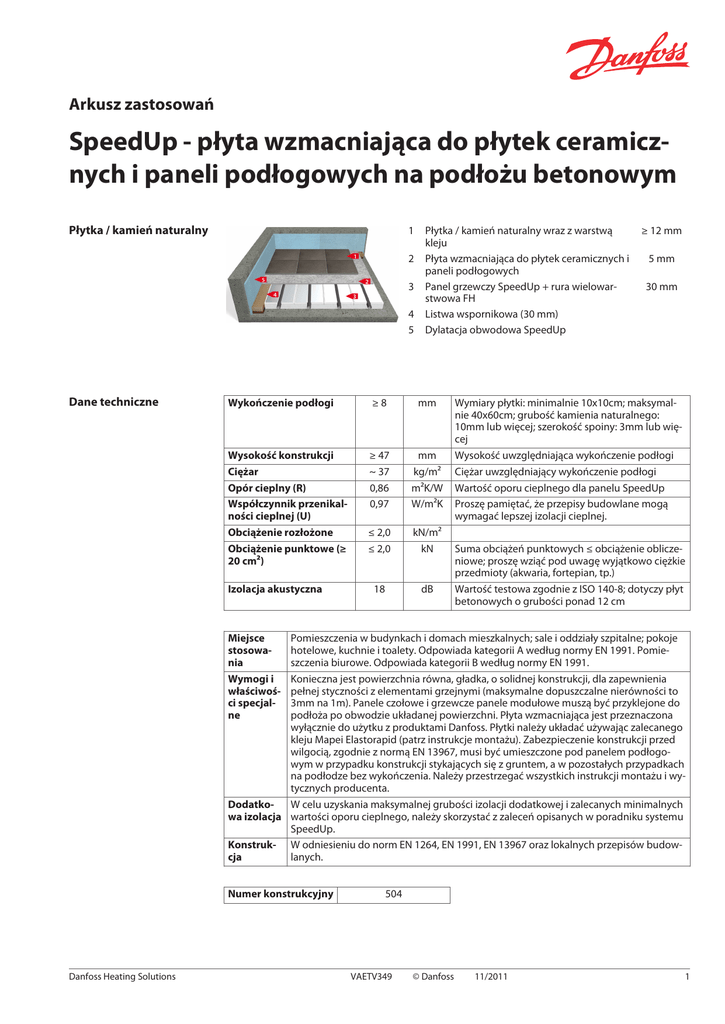 Arkusz zastosowań SpeedUp - płyta wzmacniająca do płytek ceramicznych i paneli podłogowych na podłożu betonowym Płytka / kamień naturalny 1 2 3 4 5 Dane techniczne Płytka / kamień naturalny wraz z warstwą kleju Płyta wzmacniająca do płytek ceramicznych i paneli podłogowych Panel grzewczy SpeedUp + rura wielowarstwowa FH Listwa wspornikowa (30 mm) Dylatacja obwodowa SpeedUp Wykończenie podłogi ≥8 mm Wysokość konstrukcji Ciężar Opór cieplny (R) Współczynnik przenikalności cieplnej (U) Obciążenie rozłożone Obciążenie punktowe (≥ 20 cm²) ≥ 47 ~ 37 0,86 0,97 mm kg/m² m²K/W W/m²K ≤ 2,0 ≤ 2,0 kN/m² kN 18 dB Izolacja akustyczna ≥ 12 mm 5 mm 30 mm Wymiary płytki: minimalnie 10x10cm; maksymalnie 40x60cm; grubość kamienia naturalnego: 10mm lub więcej; szerokość spoiny: 3mm lub więcej Wysokość uwzględniająca wykończenie podłogi Ciężar uwzględniający wykończenie podłogi Wartość oporu cieplnego dla panelu SpeedUp Proszę pamiętać, że przepisy budowlane mogą wymagać lepszej izolacji cieplnej. Suma obciążeń punktowych ≤ obciążenie obliczeniowe; proszę wziąć pod uwagę wyjątkowo ciężkie przedmioty (akwaria, fortepian, tp.) Wartość testowa zgodnie z ISO 140-8; dotyczy płyt betonowych o grubości ponad 12 cm Pomieszczenia w budynkach i domach mieszkalnych; sale i oddziały szpitalne; pokoje hotelowe, kuchnie i toalety. Odpowiada kategorii A według normy EN 1991. Pomieszczenia biurowe. Odpowiada kategorii B według normy EN 1991. Konieczna jest powierzchnia równa, gładka, o solidnej konstrukcji, dla zapewnienia pełnej styczności z elementami grzejnymi (maksymalne dopuszczalne nierówności to 3mm na 1m). Panele czołowe i grzewcze panele modułowe muszą być przyklejone do podłoża po obwodzie układanej powierzchni. Płyta wzmacniająca jest przeznaczona wyłącznie do użytku z produktami Danfoss. Płytki należy układać używając zalecanego kleju Mapei Elastorapid (patrz instrukcje montażu). Zabezpieczenie konstrukcji przed wilgocią, zgodnie z normą EN 13967, musi być umieszczone pod panelem podłogowym w przypadku konstrukcji stykających się z gruntem, a w pozostałych przypadkach na podłodze bez wykończenia. Należy przestrzegać wszystkich instrukcji montażu i wytycznych producenta. DodatkoW celu uzyskania maksymalnej grubości izolacji dodatkowej i zalecanych minimalnych wa izolacja wartości oporu cieplnego, należy skorzystać z zaleceń opisanych w poradniku systemu SpeedUp. Konstruk- W odniesieniu do norm EN 1264, EN 1991, EN 13967 oraz lokalnych przepisów budowcja lanych. Miejsce stosowania Wymogi i właściwości specjalne Numer konstrukcyjny Danfoss Heating Solutions 504 VAETV349 © Danfoss 11/2011 1 Arkusz zastosowań SpeedUp - płyta wzmacniająca do płytek ceramicznych i paneli podłogowych na . . . Danfoss Sp. z o. o. ul. Chrzanowska 505-825 Grodzisk Mazowiecki Telefon: (22) 755 07 00 Telefax: (22) 755 07 01 e-mail: [email protected] www.danfoss.pl Danfoss nie ponosi odpowiedzialności za możliwe błędy drukarskie w katalogach, broszurach i innych materiałach drukowanych. Dane techniczne zawarte w broszurze mogą ulec zmianie bez wcześniejszego uprzedzenia, jako efekt stałych ulepszeń i modyfikacji naszych urządzeń. Wszystkie znaki towarowe w tym materiale są własnością odpowiednich spółek. Danfoss Heating Solutions, logotyp Danfoss Heating Solutions są znakami towarowymi Danfoss A/S. Wszystkie prawa zastreżone. 2 VAETV349 © Danfoss 11/2011 Danfoss Heating Solutions