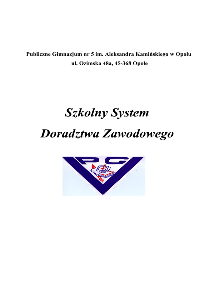 Publiczne Gimnazjum nr 5 im. Aleksandra Kamińskiego w Opolu ul. Ozimska 48a, 45-368 Opole Szkolny System Doradztwa Zawodowego Opole 2015 Obowiązujące akty prawne dotyczące udzielania uczniom pomocy w wyborze zawodu i kierunku kształcenia: Ustawa z dnia 7 września 1991 o systemie oświaty. Rozporządzenie Ministra Edukacji Narodowej z dnia 30 kwietnia 2013 r. w sprawie zasad udzielania i organizacji pomocy psychologiczno-pedagogicznej w publicznych przedszkolach, szkołach i placówkach. Rozporządzenie Ministra Edukacji Narodowej z dnia 1 lutego 2013 r. w sprawie szczegółowych zasad działania publicznych poradni psychologiczno-pedagogicznych, w tym publicznych poradni specjalistycznych. Rozporządzenie Ministra Edukacji Narodowej i Sportu z dnia 7 stycznia 2003 r. w sprawie zasad udzielania i organizacji pomocy psychologiczno – pedagogicznej w publicznych przedszkolach, szkołach i placówkach (Dz.U.nr 11 poz. 114). Rozporządzenie Ministra Edukacji Narodowej z dnia 21 maja 2001 r. w sprawie ramowych statutów publicznego przedszkola lub publicznych szkół wprowadzające funkcjonowanie wewnątrzszkolnego systemu doradztwa zawodowego, realizowanego we współpracy z poradniami psychologiczno – pedagogicznymi. Rozporządzenie Ministra Edukacji Narodowej i Sportu z dnia13 czerwca 2003 r. w sprawie rodzajów, organizacji oraz sposobu działania publicznych placówek kształcenia ustawicznego, w tym publicznych ośrodków dokształcenia i doskonalenia zawodowego (Dz. U. z 2003 r. nr 132 poz. 1225). Standardy doradztwa zawodowego w gimnazjach i szkołach ponadgimnazjalnych miasta Opola z dnia 01.09.2014 r. 2 W Publicznym Gimnazjum nr 5 im. Aleksandra Kamińskiego w Opolu cele i zadania systemu doradztwa zawodowego realizowane są w ramach działalności Szkolnego Ośrodka Kariery. 1. Ogólne cele systemu: a) przygotowanie uczniów do podjęcia decyzji o dalszym kształceniu i przyszłej aktywności zawodowej, pomoc w wyborze kierunku kształcenia, b) rozwijanie wśród uczniów świadomości swojego potencjału, c) kształtowanie u uczniów zachowań i postaw zgodnych z normami społecznymi, d) zapoznanie uczniów z zagadnieniami związanymi z rynkiem pracy, e) zapoznanie uczniów ze strukturą szkolnictwa w Polsce i zasadami rekrutacji do wybranych szkół, f) zapoznanie uczniów z wybranymi zawodami, g) tworzenie i systematyczna aktualizacja bazy edukacyjno-informacyjnej z zakresu doradztwa edukacyjno – zawodowego, h) gromadzenie i aktualizowanie oraz udostępnianie informacji z zakresu doradztwa edukacyjno – zawodowego, i) poznanie zapotrzebowania uczniów na informacje edukacyjno – zawodowe, j) wspieranie nauczycieli, wychowawców i innych specjalistów w udzielaniu uczniom i ich rodzicom pomocy psychologiczno – pedagogicznej w tym z zakresu doradztwa edukacyjno – zawodowego, k) wspieranie rodziców w działaniach wychowawczych podejmowanych wobec swoich dzieci, l) poznanie losów absolwentów, m) koordynowanie podejmowanych w szkole działań z zakresu doradztwa edukacyjno – zawodowego. 2. Szczegółowe cele systemu a) Uczniowie 1) Kształtowanie umiejętności określania swoich celów życiowych, podejmowania decyzji, planowania w zakresie dalszego rozwoju edukacyjno-zawodowego. 2) Poznanie siebie, swoich mocnych i słabych stron, zainteresowań i predyspozycji 3 zawodowych. 3) Kształtowanie odpowiedzialności za własny rozwój zawodowy. 4) Kształtowanie umiejętności społecznych pozwalających na radzenie sobie ze stresem i w trudnych sytuacjach, nauka prawidłowej i skutecznej autoprezentacji oraz kształtowanie pozytywnych postaw do nauki i pracy. 5) Kształtowanie postaw przedsiębiorczych, rozwijanie myślenia kreatywnego. 6) Budowanie motywacji do szeroko rozumianego rozwoju i nauka zarządzania czasem. 7) Zapoznanie z zagadnieniami dotyczącymi rynku pracy (praca, zawód, pracodawca, pracownik, bezrobocie, skutki bezrobocia, sposoby poszukiwania pracy, źródła informacji na temat zatrudnienia, dokumenty aplikacyjne itp.). 8) Zapoznanie ze strukturą szkolnictwa w Polsce (zasady rekrutacji do szkół, kierunki kształcenia, źródła informacji n temat kierunków kształcenia itp.) 9) Zapoznanie z mocnymi i słabymi stronami wybranych zawodów (przeciwwskazania do pracy w wybranym zawodzie, zawody nadwyżkowe i deficytowe itp.). 10) Diagnoza zapotrzebowania na informacje edukacyjno – zawodowe. 11) Gromadzenie informacji na temat losów absolwentów (wyboru szkoły ponadgimnazjalnej). b) Rodzice 1) Dostarczenie informacji o kierunkach kształcenia, zawodach, aktualnych trendach na rynku pracy. 2) Dostarczenie wiedzy o dziecku, jego umiejętnościach, preferowanych, wartościach, zdolnościach, zainteresowaniach, mocnych i słabych stronach; predyspozycjach zawodowych. 3) Dostarczenie informacji o przeciwwskazaniach zdrowotnych do wykonywania określonego zawodu. 4) Dostarczenie informacji na temat instytucji zajmujących się pomocą psychologiczno – pedagogiczną, doradztwem edukacyjno - zawodowym. 5) Dostarczenie informacji na temat czynników wpływających na podejmowanie przez dzieci decyzji związanej z wyborem drogi edukacyjno – zawodowej. c) Nauczyciele 1) Pomoc w organizowaniu pomocy psychologiczno –pedagogicznej w tym zajęć z zakresu doradztwa edukacyjno – zawodowego (prelekcje, spotkania z pracodawcami, specjalistami wspierającymi działania szkoły, organizacja wycieczek zawodoznawczych, wyjścia na Targi Pracy, Dni Otwarte szkół, itp.). 4 2) Uświadomienie konieczności wplatania w treści przedmiotowe informacji z zakresu doradztwa edukacyjno – zawodowego. 3) Pomoc w opracowaniu materiałów pomocniczych do prowadzenia zajęć z zakresu doradztwa edukacyjno – zawodowego na godzinach wychowawczych i spotkaniach z rodzicami. 4) Udostępnianie informacji związanych z pomocą psychologiczno – pedagogiczną w tym dotycząca doradztwa edukacyjno – zawodowego. 3. Zadania systemu Podejmowane działania z zakresu doradzt