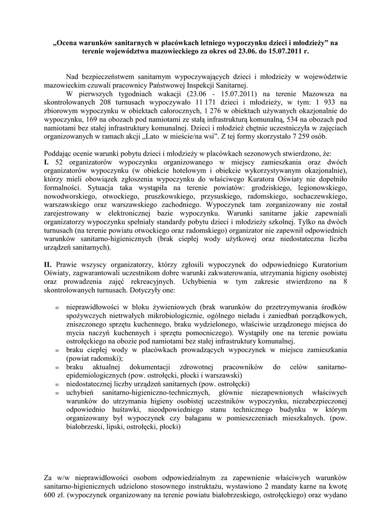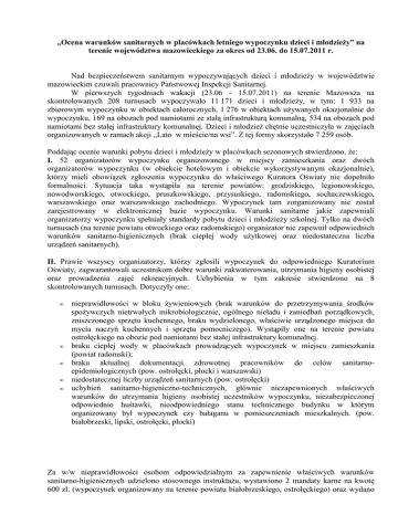 „Ocena warunków sanitarnych w placówkach letniego wypoczynku dzieci i młodzieży” na terenie województwa mazowieckiego za okres od 23.06. do 15.07.2011 r. Nad bezpieczeństwem sanitarnym wypoczywających dzieci i młodzieży w województwie mazowieckim czuwali pracownicy Państwowej Inspekcji Sanitarnej. W pierwszych tygodniach wakacji (23.06 - 15.07.2011) na terenie Mazowsza na skontrolowanych 208 turnusach wypoczywało 11 171 dzieci i młodzieży, w tym: 1 933 na zbiorowym wypoczynku w obiektach całorocznych, 1 276 w obiektach używanych okazjonalnie do wypoczynku, 169 na obozach pod namiotami ze stałą infrastrukturą komunalną, 534 na obozach pod namiotami bez stałej infrastruktury komunalnej. Dzieci i młodzież chętnie uczestniczyła w zajęciach organizowanych w ramach akcji „Lato w mieście/na wsi”. Z tej formy skorzystało 7 259 osób. Poddając ocenie warunki pobytu dzieci i młodzieży w placówkach sezonowych stwierdzono, że: I. 52 organizatorów wypoczynku organizowanego w miejscy zamieszkania oraz dwóch organizatorów wypoczynku (w obiekcie hotelowym i obiekcie wykorzystywanym okazjonalnie), którzy mieli obowiązek zgłoszenia wypoczynku do właściwego Kuratora Oświaty nie dopełniło formalności. Sytuacja taka wystąpiła na terenie powiatów: grodziskiego, legionowskiego, nowodworskiego, otwockiego, pruszkowskiego, przysuskiego, radomskiego, sochaczewskiego, warszawskiego oraz warszawskiego zachodniego. Wypoczynek tam zorganizowany nie został zarejestrowany w elektronicznej bazie wypoczynku. Warunki sanitarne jakie zapewniali organizatorzy wypoczynku spełniały standardy pobytu dzieci i młodzieży szkolnej. Tylko na dwóch turnusach (na terenie powiatu otwockiego oraz radomskiego) organizator nie zapewnił odpowiednich warunków sanitarno-higienicznych (brak ciepłej wody użytkowej oraz niedostateczna liczba urządzeń sanitarnych). II. Prawie wszyscy organizatorzy, którzy zgłosili wypoczynek do odpowiedniego Kuratorium Oświaty, zagwarantowali uczestnikom dobre warunki zakwaterowania, utrzymania higieny osobistej oraz prowadzenia zajęć rekreacyjnych. Uchybienia w tym zakresie stwierdzono na 8 skontrolowanych turnusach. Dotyczyły one: • • • • • nieprawidłowości w bloku żywieniowych (brak warunków do przetrzymywania środków spożywczych nietrwałych mikrobiologicznie, ogólnego nieładu i zaniedbań porządkowych, zniszczonego sprzętu kuchennego, braku wydzielonego, właściwie urządzonego miejsca do mycia naczyń kuchennych i sprzętu pomocniczego). Wystąpiły one na terenie powiatu ostrołęckiego na obozie pod namiotami bez stałej infrastruktury komunalnej. braku ciepłej wody w placówkach prowadzących wypoczynek w miejscu zamieszkania (powiat radomski); braku aktualnej dokumentacji zdrowotnej pracowników do celów sanitarnoepidemiologicznych (pow. ostrołęcki, płocki i warszawski) niedostatecznej liczby urządzeń sanitarnych (pow. ostrołęcki) uchybień sanitarno-higieniczno-technicznych, głównie niezapewnionych właściwych warunków do utrzymania higieny osobistej uczestników wypoczynku, niezabezpieczonej odpowiednio huśtawki, nieodpowiedniego stanu technicznego budynku w którym organizowany był wypoczynek czy bałaganu w pomieszczeniach mieszkalnych. (pow. białobrzeski, lipski, ostrołęcki, płocki) Za w/w nieprawidłowości osobom odpowiedzialnym za zapewnienie właściwych warunków sanitarno-higienicznych udzielono stosownego instruktażu, wystawiono 2 mandaty karne na kwotę 600 zł. (wypoczynek organizowany na terenie powiatu białobrzeskiego, ostrołęckiego) oraz wydano 1 decyzję merytoryczną oraz 1 decyzję płatniczą (wypoczynek organizowany na terenie powiatu ostrołęckiego). III. Brak aktualnej dokumentacji medycznej personelu stwierdzono na 5 turnusach: 1 na zbiorowym wypoczynku w obiekcie wykorzystywanym okazjonalnie do wypoczynku, 1 na obozie pod namiotami bez stałej infrastruktury, 3 podczas wypoczynku organizowanego w miejscu zamieszkania IV. Podczas wakacji nie odnotowano dużej liczby zachorowań oraz sporadycznie dochodziło do wypadków i urazów, głównie podczas zabaw na świeżym powietrzu. Z ogólnej liczby 11 171 uczestników wypoczynku odnotowano 9 (0,08%) przypadków zachorowań na 5 turnusach, głównie zapalenie górnych dróg oddechowych (powiat ostrołęcki i płocki). Wypadków lub urazów 12 (0,1%) na 10 turnusach, głównie kończyn dolnych. Zatruć nie odnotowano. V. Dzieci i młodzież korzystająca z form wyjazdowych objęta była całodziennym wyżywieniem, do zapewnienia którego zobowiązani byli organizatorzy takiego wypoczynku. Natomiast półkolonie, zapewniające opiekę przez część doby, organizowały dożywianie swoim podopiecznym, w zależności od posiadanych warunków lokalowych oraz możliwości finansowych. I tak, na 130 turnusów skontrolowanych, 104 oferowało dzieciom i młodzieży dożywianie. W ramach realizacji Rządowego Programu "Razem Bezpieczniej" podejmowano współpracę z jednostkami samorządu terytorialnego oraz innymi inspekcjami i służbami. Dziewiętnastu z 38 Państwowych Powiatowych Inspektorów Sanitarnych uczestniczyło w posiedzeniach Komisji Bezpieczeństwa i Porządku dotyczących zapewnienia szeroko rozumianego bezpieczeństwa podczas wypoczynku letniego. W dziewięciu powiatach odbyły się wspólne kontrole z udziałem przedstawicieli samorządu terytorialnego, Policji, Straży Pożarnej, Kuratorium Oświaty, Inspektorem Nadzoru Budowlanego. W sumie przeprowadzono 17 zintegrowanych kontroli. Skontrolowano obiekty hotelowe, obiekty sezonowe, obozy pod namiotami, wypoczynek w miejscu zamieszkania, place zabaw, kąpieliska. Wnioski: Podsumowując trwający okres wakacyjny należy stwierdzić, że był on dobrze przygotowany. Wyniki nadzoru sanitarnego wskazują, że warunki sanitarno-higieniczne w obiektach, przeznaczonych do akcji letniej w zasadzie nie budziły większych zastrzeżeń. Tylko na 11 turnusach z 208 