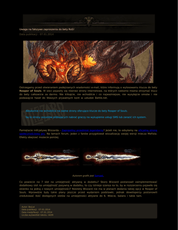 Uwaga na fałszywe zaproszenia do bety RoS! Data publikacji : 07.01.2014 Ostrzegamy przed otwieraniem podejrzanych wiadomości e-mail, które informują o wylosowaniu klucza do bety Reaper of Souls. W sieci pojawiły się również strony internetowe, na których rzekomo można otrzymać klucz do bety całkowicie za darmo. Nie klikajcie, nie wchodźcie i co najważniejsze, nie wysyłajcie smsów i nie podawajcie haseł do Waszych prywatnych kont w usłudze Battle.net. Absolutnie nie wchodźcie na żadne strony oferujące klucze do bety Reaper of Souls. Są to strony oszustów próbujących nabrać graczy na wykupienie usługi SMS lub zarazić ich system. Pamiętacie inifcjatywę Blizzarda - Zaprojektuj przedmiot legendarny? Jeżeli nie, to odsyłamy na oficjalną stronę społecznościową gry. Na łamach forum, jeden z fanów przygotował wizualizację swojej wersji miecza Mefista. Efekty obejrzeć możecie poniżej. Autorem grafik jest SamaeL. Co powiecie na 7 slot na umiejętność aktywną w dodatku? Skoro Blizzard postanowił zaimplementować dodatkowy slot na umiejętność pasywną w dodatku, to czy istnieje szansa na to, by w rozszerzeniu pojawiło się okienko na jedną z nowych umiejętności? Niestety Blizzard nie ma w planach dodania takiej opcji w Reaper of Souls. Wprawdzie były takie plany jeszcze przed wydaniem podstawki, jednak deweloperzy postanowili zredukować ilość dostępnych slotów na umiejętności aktywne do 6. Wiecie, balans i takie tam. Autor: BeLial Data publikacji : 07.01.2014 Data modyfikacji : 07.01.2014 Liczba wyświetleń tekstu: 4439 Tagi: beta, Diablo III: Reaper of Souls, Mefisto, miecz POWRÓT DRUKUJ PDF POLEĆ ZNAJOMEMU Komentarz (4) dodaj komentarz właśnie dzisiaj dostałem już 5 zaproszenie :D najlepsze w tym jest to że cały czas dostaje ten sam kod :D~ Gorki 2014/01/07 17:05 Mogliby dodać 7 slot na umiejętność przywoływania sojuszników typu: Mnich - mistyczny sojusznik Szaman - monstrum, psy DH - towarzysz Barb - zew starożytnych Wizard - hydra Zawsze to jakieś wzmocnienie by było. :)~Horror 2014/01/07 17:07 Ja myśle że obecna ilość jest wystarczająca, pasywne ok ale do aktywnych juz bym nie dodawal wiecej. Nie róbmy z tego WoW'a. :)~Debosy 2014/01/08 10:04 Cena dpdatku jak widać jest dość przystępna a sam klucz mozna dostać jeszcze taniej :D http://www.gram.pl/news/2014/01/09/diablo-iii-reaper-of-souls-dostepne-w-przedsprzedazy-w-sklepie-gram-pl. shtml~Zeniffar 2014/01/09 17:05 dodaj komentarz
