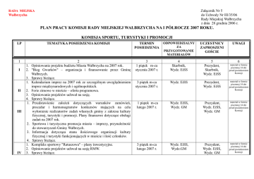 Załącznik Nr 5 do Uchwały Nr III/35/06 Rady Miejskiej Wałbrzycha z dnia 28 grudnia 2006 r. RADA MIEJSKA Wałbrzycha PLAN PRACY KOMISJI RADY MIEJSKIEJ WAŁBRZYCHA NA I PÓŁROCZE 2007 ROKU. KOMISJA SPORTU, TURYSTYKI I PROMOCJI LP TEMATYKA POSIEDZENIA KOMISJI TERMIN POSIEDZENIA ODPOWIEDZIALNY ZA PRZYGOTOWANIE MATERIAŁÓW UCZESTNICY ZAPROSZENI GOŚCIE 1 2 1. Opiniowanie projektu budżetu Miasta Wałbrzycha na 2007 rok. 2. "Bieg Gwarków" – organizacja i finansowanie przez Gminę Wałbrzych. 3. Sprawy bieżące. 1. Kalendarium imprez na 2007 rok ze szczególnym uwzględnieniem imprez międzynarodowych i ogólnopolskich. 2. Ferie zimowe w mieście – oferta programowa. 3. Opiniowanie projektów uchwał na sesję. 4. Sprawy bieżące. 1. Przedstawienie założeń dotyczących warunków zamówień, procedur i harmonogramów konkursów mających na celu wyłonienie realizatorów zadań własnych gminy z zakresu kultury fizycznej, turystyki i promocji. Plany finansowe dotyczące obsługi zadań na 2007 rok. 2. Sportowa i turystyczna promocja miasta – imprezy, przynależność do stowarzyszeń Gminy Wałbrzych. 3. Informacja dotycząca stanu ilościowego organizacji kultury fizycznej i turystyki funkcjonujących w mieście i ilość członków. 4. Sprawy bieżące. 1. Kompleks sportowy "Ratuszowa" – plany inwestycyjne. 2. Opiniowanie projektów uchwał na sesję RMW. 3. Sprawy bieżące. 3 1 piątek m-ca stycznia 2007 r. 4 Skarbnik, Wydz. EiSS 5 Prezydent, Skarbnik, Wydz. EiSS 3 piątek m-ca stycznia 2007 r. Wydz. EiSS Prezydent, Wydz. EiSS materiał w formie pisemnej 14 dni przed posiedzeniem Komisji 1 piątek m-ca lutego 2007 r. Wydz. EiSS, Wydz. GM Prezydent, Wydz. EiSS, Wydz. GM materiał w formie pisemnej 14 dni przed posiedzeniem Komisji 3 piątek m-ca lutego 2007 r. Wydz. EiSS, Wydz.GM Prezydent, Wydz. EiSS, Wydz. GM materiał w formie pisemnej 14 dni przed posiedzeniem Komisji I II III IV UWAGI 6 materiał w formie pisemnej 14 dni przed posiedzeniem Komisji 1. Organizacje kultury fizycznej i turystyki – stan, problemy, plany – 1 piątek m-ca JKKS "Górnik" Wałbrzych. marca 2007 r. V 2. Informacja na temat realizacji założeń programowych – ferie zimowe w mieście. 3. Opiniowanie sprawozdania z wykonania budżetu Miasta Wałbrzycha za 2006 rok. 4. Sprawy bieżące. 1. Wyniki sportu wałbrzyskiego za 2006 rok i jego miejsce 3 piątek m-ca w kwalifikacjach dolnośląskich i ogólnopolskich. Przyznane marca 2007 r. VI stypendia sportowe. 2. Zapoznanie się z wynikami konkursów dotyczącymi realizacji zadań własnych gminy z zakresu kultury fizycznej, sportu i turystyki. Imienny podział środków finansowych z budżetu miasta na 2007 rok. 3. Opiniowanie projektów uchwał na sesję RMW. 4. Sprawy bieżące. 1. Organizacje kultury fizycznej i turystyki – stan, problemy, plany – 1 piątek m-ca VII KS "Górnik – Zagłębie" Wałbrzych. kwietnia 2007 r. 2. Wydawnictwa turystyczne i promocyjne – przedstawienie działań miasta. 3. Sprawy bieżące. 1. Opiniowanie projektów uchwał na sesję RMW. 3 piątek m-ca VIII 2. Sprawy bieżące. kwietnia 2007 r. 3. Wizytacja obiektów sportowych: - ul. Kusocińskiego – Piaskowa Góra, - ul. Topolowa – "SCATEPARK", - u. Blankowa – boisko. 1. Organizacje kultury fizycznej – stan, problemy, plany – "Juventur" 1 piątek m-ca IX Wałbrzych. maja 2007 r. 2. "Skoda MTB" – przygotowania do imprezy. 3. Współpraca miast partnerskich na płaszczyźnie: sportu, kultury fizycznej, rekreacji, turystyki i promocji miasta. Dalsze plany współpracy. 4. Sprawy bieżące. Skarbnik, Wydz. EiSS, Prezydent, Skarbnik, Wydz. EiSS, JKKS "Górnik" materiał w formie pisemnej 14 dni przed posiedzeniem Komisji Wydz. EiSS, Prezydent, Wydz. EiSS, materiał w formie pisemnej 14 dni przed posiedzeniem Komisji Wydz. GM Prezydent, Wydz. GM, KS "Górnik-Zagłębie" materiał w formie pisemnej 14 dni przed posiedzeniem Komisji Wydz. EiSS Prezydent, Wydz. EiSS posiedzenie wyjazdowe Wydz. EiSS, Wydz. GM Prezydent, Wydz. EiSS, Wydz. GM materiał w formie pisemnej 14 dni przed posiedzeniem Komisji X XI XII 1. Opiniowanie projektów uchwał na sesję RMW. 2. Sprawy bieżące. 3. Wizytacja obiektów sportowych: – ul. Chopina – Nowe Miasto, – ul. Bystrzycka – Rusinowa. 1. Wakacje 2007 – oferta programowa. 2. Ścieżki rowerowe – funkcjonowanie na terenie miasta. 3. Plan pracy Komisji na II półrocze 2007 r. 4. Sprawy bieżące. 1. Opiniowanie projektów uchwał na sesje RMW. 2. Sprawy bieżące. 3. Wizytacja obiektów sportowych: – ul. Ratuszowa – Biały Kamień, – ul. Dąbrowskiego – Biały Kamień. 3 piątek m-ca maja 2007 r. Wydz. EiSS Prezydent, Wydz. EiSS materiał w formie pisemnej 14 dni przed posiedzeniem Komisji posiedzenie wyjazdowe 1 piątek m-ca czerwca 2007 r. Wydz. EiSS Prezydent, Wydz. EiSS materiał w formie pisemnej 14 dni przed posiedzeniem Komisji 3 piątek m-ca czerwca 2007 r. Wydz. EiSS Prezydent, Wydz. EiSS posiedzenie wyjazdowe Przewodniczący Komisji STiP /-/ Artur Torbus