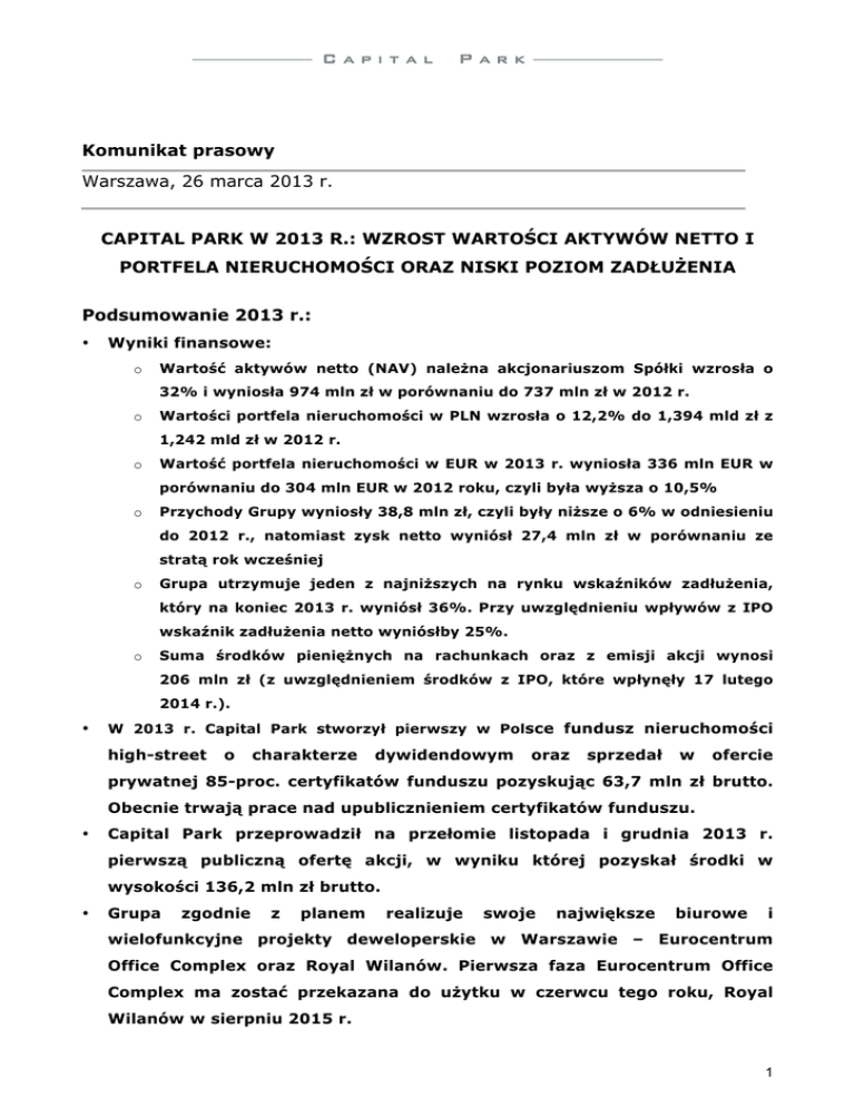 Komunikat prasowy Warszawa, 26 marca 2013 r. INFORMACJA PRASOWA CAPITAL PARK W 2013 R.: WZROST WARTOŚCI AKTYWÓW NETTO I PORTFELA NIERUCHOMOŚCI ORAZ NISKI POZIOM ZADŁUŻENIA Podsumowanie 2013 r.: • Wyniki finansowe: o Wartość aktywów netto (NAV) należna akcjonariuszom Spółki wzrosła o 32% i wyniosła 974 mln zł w porównaniu do 737 mln zł w 2012 r. o Wartości portfela nieruchomości w PLN wzrosła o 12,2% do 1,394 mld zł z 1,242 mld zł w 2012 r. o Wartość portfela nieruchomości w EUR w 2013 r. wyniosła 336 mln EUR w porównaniu do 304 mln EUR w 2012 roku, czyli była wyższa o 10,5% o Przychody Grupy wyniosły 38,8 mln zł, czyli były niższe o 6% w odniesieniu do 2012 r., natomiast zysk netto wyniósł 27,4 mln zł w porównaniu ze stratą rok wcześniej o Grupa utrzymuje jeden z najniższych na rynku wskaźników zadłużenia, który na koniec 2013 r. wyniósł 36%. Przy uwzględnieniu wpływów z IPO wskaźnik zadłużenia netto wyniósłby 25%. o Suma środków pieniężnych na rachunkach oraz z emisji akcji wynosi 206 mln zł (z uwzględnieniem środków z IPO, które wpłynęły 17 lutego 2014 r.). • W 2013 r. Capital Park stworzył pierwszy w Polsce fundusz nieruchomości high-street o charakterze dywidendowym oraz sprzedał w ofercie prywatnej 85-proc. certyfikatów funduszu pozyskując 63,7 mln zł brutto. Obecnie trwają prace nad upublicznieniem certyfikatów funduszu. • Capital Park przeprowadził na przełomie listopada i grudnia 2013 r. pierwszą publiczną ofertę akcji, w wyniku której pozyskał środki w wysokości 136,2 mln zł brutto. • Grupa zgodnie z planem realizuje swoje największe biurowe i wielofunkcyjne projekty deweloperskie w Warszawie – Eurocentrum Office Complex oraz Royal Wilanów. Pierwsza faza Eurocentrum Office Complex ma zostać przekazana do użytku w czerwcu tego roku, Royal Wilanów w sierpniu 2015 r. 1 WYNIKI FINANSOWE - SZCZEGÓŁY Wybrane roczne wyniki finansowe Grupy Capital Park przedstawia poniższa tabela: tys. PLN 2013 Przychody z wynajmu podstawowego Zysk (strata) z aktualizacji wyceny nieruchomości inwestycyjnych Zysk (strata) z działalności operacyjnej Zysk (strata) netto 2012 38 832 41 463 24 290 (108 395) 40 429 (87 988) 27 448 (115 034) Przychody Grupy Capital Park w 2013 r. były niższe o 6% względem analogicznego okresu ubiegłego roku. Wynikało to ze spadku przychodów z najmu, związanego z zakończeniem umów niektórych najemców. Największe spadki Spółka odnotowała w dwóch nieruchomościach warszawskich: budynku Alfa zlokalizowanym przy Al. Jerozolimskich (-2,3 mln zł) oraz budynku przy ul. Sobieskiego (-0,7 mln zł). Grupa systematycznie pracuje nad odbudową przychodów i podpisała już umowy na wynajem ponad 4,6 tys. m2, w tym umowę na 2,1 tys. m2 z firmą Provident oraz umowę z Hebe na 1,8 tys. m2. Zysk z działalności operacyjnej bez uwzględnienia aktualizacji wyceny nieruchomości wyniósł 16,1 mln zł, a po aktualizacji wyceny wyniósł 40,4 mln zł, w porównaniu do straty rok wcześniej. ROSNĄCA WARTOŚĆ AKTYWÓW NETTO I PORTFELA NIERUCHOMOŚCI Najważniejszym dla Grupy wskaźnikiem jest wzrost wartości aktywów netto (NAV) przypadająca na akcjonariuszy Capital Park. W 2013 roku wskaźnik ten wzrósł o 32% do wartości 974 mln zł, natomiast wartość brutto portfela nieruchomości wyniosła 1,4 mld zł i była wyższa o 12,2% w odniesieniu do 2012 r. Wartość portfela nieruchomości Grupy wyrażona w EUR rośnie nieprzerwanie od 10 lat i w 2013 r. wyniosła 336 mln EUR (wzrost o 10,5% względem 2012 r.). 2 Na portfel nieruchomości składają się inwestycje komercyjne o wartości 1,331 mld zł oraz nieruchomości mieszkaniowe prezentowane w zapasach o wartości 64 mln zł. Wzrost wartości wynikał przede wszystkim z ponoszonych nakładów inwestycyjnych na znajdujące się w budowie nieruchomości: Eurocentrum Office Complex (faza I) i Royal Wilanów. Mniejszy wpływ na wartość nieruchomości miały pozostałe czynniki, takie jak wzrost wartości kursu EUR/PLN i aktualizacja wyceny. Rok 2013 był przełomowy w historii naszej Grupy. W grudniu zadebiutowaliśmy na Giełdzie Papierów Wartościowych w Warszawie, pozyskując z oferty publicznej środki w wysokości 136,2 mln zł brutto. W minionym roku stworzyliśmy też pierwszy w Polsce fundusz nieruchomości nieruchomościowy high-street. Dzięki o charakterze unikalności dywidendowym, naszego produktu, oparty w o sierpniu sprzedaliśmy inwestorom indywidualnym w ofercie publicznej 85-proc. certyfikatów 3 funduszu pozyskując 63,7 mln zł brutto. Dzięki sukcesowi obu projektów Grupa pozyskała nowe środki o łącznej wartości ok. 200 mln zł, które będą przeznaczone na dalszą budowę wartości Capital Park poprzez realizację głównych projektów deweloperskich z obecnego portfolio, jak również na działalność akwizycyjną. Rozwija się również nasza działalność powiernicza związana z zarządzaniem funduszem Real Estate Income Assets FIZ AN - w styczniu tego roku zostało zrealizowane kluczowe założenie, czyli pierwsza wypłata dywidendy, która wyniosła 7%. Planujemy transakcje, które umożliwią znaczne powiększenie funduszu. Analizujemy wiele nowych projektów i przymierzamy się do kolejnych akwizycji – powiedział Jan Motz, Prezes Zarządu Capital Park SA. Zgodnie z zapowiedziami w trakcie IPO nasze najważniejsze inwestycje, m.in. na które zebraliśmy środki z oferty, czyli Eurocentrum Office Complex oraz Royal Wilanów są realizowane terminowo. I faza Eurocentrum Office Complex ma zostać przekazana do użytku w czerwcu tego roku, natomiast Royal Wilanów w sierpniu 2015 r. Zakończyliśmy też negocjacje warunków kluczowych umów najmu/dzierżawy w projektach Neptun House i street mall Vis à Vis Łódź. To pozwala nam z realnym optymizmem zakładać realizację naszych planów biznesowych dotyczących bieżących projektów. Jestem przekonany, że 2014 r. będzie równi