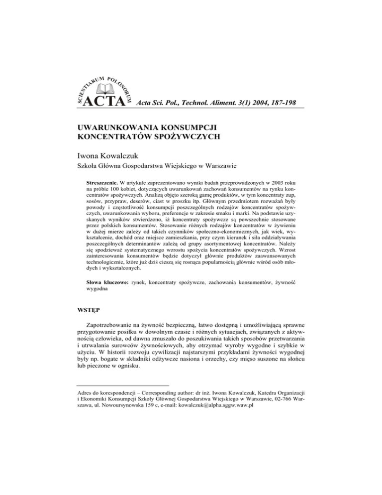 TI SCIEN RUM NO UM POLO AR ACTA Acta Sci. Pol., Technol. Aliment. 3(1) 2004, 187-198 UWARUNKOWANIA KONSUMPCJI KONCENTRATÓW SPOŻYWCZYCH Iwona Kowalczuk Szkoła Główna Gospodarstwa Wiejskiego w Warszawie Streszczenie. W artykule zaprezentowano wyniki badań przeprowadzonych w 2003 roku na próbie 100 kobiet, dotyczących uwarunkowań zachowań konsumentów na rynku koncentratów spożywczych. Analizą objęto szeroką gamę produktów, w tym koncentraty zup, sosów, przypraw, deserów, ciast w proszku itp. Głównym przedmiotem rozważań były powody i częstotliwość konsumpcji poszczególnych rodzajów koncentratów spożywczych, uwarunkowania wyboru, preferencje w zakresie smaku i marki. Na podstawie uzyskanych wyników stwierdzono, iż koncentraty spożywcze są powszechnie stosowane przez polskich konsumentów. Stosowanie różnych rodzajów koncentratów w żywieniu w dużej mierze zależy od takich czynników społeczno-ekonomicznych, jak wiek, wykształcenie, dochód oraz miejsce zamieszkania, przy czym kierunek i siła oddziaływania poszczególnych determinantów zależą od grupy asortymentowej koncentratów. Należy się spodziewać systematycznego wzrostu spożycia koncentratów spożywczych. Wzrost zainteresowania konsumentów będzie dotyczył głównie produktów zaawansowanych technologicznie, które już dziś cieszą się rosnąca popularnością głównie wśród osób młodych i wykształconych. Słowa kluczowe: rynek, koncentraty spożywcze, zachowania konsumentów, żywność wygodna WSTĘP Zapotrzebowanie na żywność bezpieczną, łatwo dostępną i umożliwiającą sprawne przygotowanie posiłku w dowolnym czasie i różnych sytuacjach, związanych z aktywnością człowieka, od dawna zmuszało do poszukiwania takich sposobów przetwarzania i utrwalania surowców żywnościowych, aby otrzymać wyroby wygodne i szybkie w użyciu. W historii rozwoju cywilizacji najstarszymi przykładami żywności wygodnej były np. bogate w składniki odżywcze nasiona i orzechy, czy mięso suszone na słońcu lub pieczone w ognisku. Adres do korespondencji – Corresponding author: dr inż. Iwona Kowalczuk, Katedra Organizacji i Ekonomiki Konsumpcji Szkoły Głównej Gospodarstwa Wiejskiego w Warszawie, 02-766 Warszawa, ul. Nowoursynowska 159 c, e-mail: [email protected] 188 I. Kowalczuk Obecnie żywność wygodna jest reprezentowana przez setki produktów otrzymywanych powszechnie, spełniających bardzo zróżnicowane oczekiwania konsumentów. Potrzeby konsumentów ulegają dynamicznym zmianom w wyniku wielu zjawisk ekonomicznych, socjalnych i kulturowych współczesnych społeczeństw. Popyt na żywność wygodną kształtują takie zjawiska, jak: – praca zawodowa kobiet, co wiąże się ze zmianą modelu organizacji życia i wyżywienia rodziny, – wzrost liczby gospodarstw domowych jedno- i dwuosobowych, – coraz większy udział w populacji osób w podeszłym wieku, – zwiększenie zamożności społeczeństw w krajach uprzemysłowionych, umożliwiające zakup droższej żywności o dużej wartości dodanej (wysoko przetworzonej) oraz sprzyjające nasyceniu gospodarstw domowych sprzętem ułatwiającym przygotowanie posiłków, – zwiększający się udział żywności spożywanej poza domem w ramach różnych form żywienia zorganizowanego, – zwiększenie popularności żywności przeznaczonej do „podjadania” między posiłkami (ang. snack – przekąski), – częste podróżowanie związane ze zmianą sposobu spędzania wolnego czasu oraz dużą ruchliwością zawodową, sprzyjające poznawaniu potraw pochodzących z innych obszarów kulturowych [Gwiazda 2002]. Oferta przemysłu dotycząca żywności wygodnej musi także uwzględnić zwiększającą się świadomość konsumentów, że jakość życia i zdrowia zależy m.in. od sposobu odżywiania oraz czystości środowiska. Projektując nowe rodzaje żywności wygodnej, producenci muszą spełnić oczekiwania konsumentów, np. takie, że żywność ta umożliwi im utrzymanie pożądanego poziomu cholesterolu czy sodu we krwi, ułatwi kontrolowanie masy ciała, będzie pozbawiona konserwantów i nie będzie skażona. Duży udział żywności wygodnej (ang. convenience foods) w ofercie rynkowej nie oznacza, że istnieje powszechnie akceptowana definicja tej grupy produktów spożywczych. Na przykład w sferze dystrybucji i sprzedaży oraz usług żywieniowych każdy produkt spożywczy, który przetworzono w sposób redukujący konieczność dodatkowej obróbki określa się jako żywność wygodną. Zgodnie z tym określeniem do żywności wygodnej można zaliczyć wysokoprzetworzone produkty spożywcze większości branż przemysłu spożywczego lub gastronomicznego [Żywność wygodna... 2000]. W sferze usług żywieniowych, indywidualnych i zbiorowych, stosuje się definicję obejmującą tylko te rodzaje produktów spożywczych, które umożliwiają komponowanie i podawanie posiłków. Uwzględniając sugestie Paulusa, można zaproponować następującą definicję żywności wygodnej: Żywność wygodna są to produkty spożywcze otrzymywane w wyniku przetwarzania surowców z wykorzystaniem operacji zalecanych przez dobrą praktykę technologiczną, które nadają wyrobom pożądaną trwałość i umożliwiają szybkie przygotowanie z nich lub w połączeniu z innymi przetworzonymi składnikami, bezpiecznych posiłków [Żywność wygodna... 2000]. Z podanej definicji wynika, że produkt spożywczy można zaklasyfikować do żywności wygodnej wówczas, gdy surowiec jest przetworzony w odpowiednio wysokim stopniu tak, aby przygotowanie posiłku do spożycia wymagało jedynie minimalnej obróbki kulinarnej. Okres przydatności do spożycia wyrobu powinien umożliwiać sprawną i bezpieczną dystrybucję, sprzedaż oraz przechowywanie w domu konsumenta. Acta Sci. Pol. Uwarunkowania konsumpcji koncentratów spożywczych 189 Ze względu na rozwój technologii produkcji można wyróżnić trzy generacje