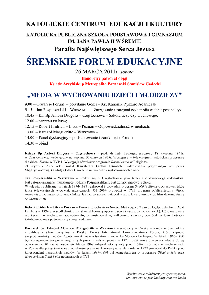 KATOLICKIE CENTRUM EDUKACJI I KULTURY KATOLICKA PUBLICZNA SZKOŁA PODSTAWOWA I GIMNAZJUM IM. JANA PAWŁA II W ŚREMIE Parafia Najświętszego Serca Jezusa ŚREMSKIE FORUM EDUKACYJNE 26 MARCA 2011r. sobota Honorowy patronat objął Ksiądz Arcybiskup Metropolita Poznański Stanisław Gądecki „MEDIA W WYCHOWANIU DZIECI I MŁODZIEśY” 9.00 – Otwarcie Forum – powitanie Gości – Ks. Kanonik Ryszard Adamczak 9.15 – Jan Pospieszalski – Warszawa – Zarządzanie nastrojami czyli media w dobie post polityki 10.45 – Ks. Bp Antoni Długosz – Częstochowa – Szkoła uczy czy wychowuje. 12.00 – przerwa na kawę 12.15 – Robert Fridrich – Litza – Poznań – Odpowiedzialność w mediach. 13.00 – Barnard Margueritte – Warszawa – … 14.00 – Panel dyskusyjny – podsumowanie i zamknięcie Forum 14.30 – obiad Ksiądz Bp Antoni Długosz – Częstochowa - prof. dr hab. Teologii, urodzony 18 kwietnia 1941r. w Częstochowie, wyświęcony na kapłana 20 czerwca 1965r. Występuje w telewizyjnym katolickim programie dla dzieci Ziarno w TVP 1. Występuje równieŜ w programie Rozmównica w Religia.tv. 21 stycznia 2007 roku został Kawalerem Orderu Uśmiechu, odznaczenia przyznanego mu przez Międzynarodową Kapitułę Orderu Uśmiechu na wniosek częstochowskich dzieci. Jan Pospieszalski – Warszawa – urodził się w Częstochowie jako trzeci z dziewięciorga rodzeństwa. Jest członkiem znanej muzykującej rodziny Pospieszalskich. Jest Ŝonaty, ma dwoje dzieci. W telewizji publicznej w latach 1994-1997 realizował i prowadził program Swojskie klimaty, opracował takŜe kilka telewizyjnych widowisk muzycznych. Od 2004 prowadzi w TVP program publicystyczny Warto rozmawiać. Po katastrofie smoleńskiej Jan Pospieszalski nakręcił wraz z Ewą Stankiewicz film dokumentalny Solidarni 2010. Robert Fridrich – Litza – Poznań – Twórca zespołu Arka Noego. MąŜ i ojciec 7 dzieci. Będąc członkiem Acid Drinkers w 1994 przeszedł dwukrotnie skomplikowaną operację serca (wszczepienie zastawek), które uratowały mu Ŝycie. To wydarzenie spowodowało, Ŝe postanowił się całkowicie zmienić, powrócił na łono Kościoła katolickiego oraz poświęcił się swojej rodzinie. Barnard Jean Edmond Alexandre Margueritte – Warszawa – urodzony w ParyŜu – francuski dziennikarz i publicysta silnie związany z Polską. Prezes International Communications Forum, które zajmuje się problematyką mediów. Opublikował wiele artykułów m.in. w Le Monde i Le Figaro. W latach 1966–1970 był korespondentem pierwszego z tych pism w Polsce, jednak w 1971 został zmuszony przez władze do jej opuszczenia. W czasie wydarzeń Marca 1968 odegrał istotną rolę jako źródło informacji o wydarzeniach w Polsce dla prasy światowej. Po okresie pracy na Uniwersytecie Harvarda w 1977 powrócił do Polski jako korespondent francuskich mediów. W latach 1987–1990 był komentatorem w programie BliŜej świata oraz telewizyjnym 7 dni świat nadawanych w TVP. Wychowanie młodzieŜy jest sprawą serca, ten, kto wie, Ŝe jest kochany sam teŜ kocha Śrem, dnia 1 marca 2011r. ZAPROSZENIE . Uprzejmie zapraszamy Panią/Pana na Śremskie Forum Edukacyjne MEDIA W WYCHOWANIU DZIECI I MŁODZIEśY Honorowy patronat objął Ksiądz Arcybiskup Metropolita Poznański Stanisław Gądecki Forum odbędzie się w Auli Szkoły Katolickiej w Śremie ul. Staszica 1, 63 – 100 Śrem, 26 marca 2011 r. (sobota) w godz. 9.00 – 14.30 Koszt udziału w sympozjum wynosi 50zł. Kwotę tę prosimy wpłacić na konto: Katolickie Publiczne Gimnazjum im Jana Pawła II w Śremie 30 1610 1188 0013 1977 2000 0002 z dopiskiem FORUM a dowód wpłaty przedstawić na spotkaniu. Prosimy o potwierdzenie udziału lub do dnia 21 marca 2011r. BieŜące informacje o konferencji na stronie www.kcek-srem.pl FORMULARZ ZGŁOSZENIA Wszelkich dodatkowych informacji udziela Wojciech Szolek e-mail: [email protected], tel. 61/ 62 53 710 FORUM WSPIERAJĄ: Parafia NSJ – Śrem Radio EMAUS - Poznań Przewodnik Katolicki - Poznań Telewizja PIELGRZYM – Śrem Ośrodek Doskonalenia Nauczycieli – Poznań Katolickie Stowarzyszenie Wychowawców