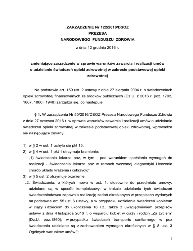 ZARZĄDZENIE Nr 122/2016/DSOZ PREZESA NARODOWEGO FUNDUSZU ZDROWIA z dnia 12 grudnia 2016 r. zmieniające zarządzenie w sprawie warunków zawarcia i realizacji umów o udzielanie świadczeń opieki zdrowotnej w zakresie podstawowej opieki zdrowotnej Na podstawie art. 159 ust. 2 ustawy z dnia 27 sierpnia 2004 r. o świadczeniach opieki zdrowotnej finansowanych ze środków publicznych (Dz.U. z 2016 r. poz. 1793, 1807, 1860 i 1948) zarządza się, co następuje: § 1. W zarządzeniu Nr 50/2016/DSOZ Prezesa Narodowego Funduszu Zdrowia z dnia 27 czerwca 2016 r. w sprawie warunków zawarcia i realizacji umów o udzielanie świadczeń opieki zdrowotnej w zakresie podstawowej opieki zdrowotnej, wprowadza się następujące zmiany: 1) w § 2 w ust. 1 uchyla się pkt 15; 2) w § 4 w ust. 1 pkt 1 otrzymuje brzmienie: „1) świadczenia lekarza poz, w tym - pod warunkiem spełnienia wymagań do realizacji - świadczenia lekarza poz w ramach wczesnej diagnostyki i leczenia chorób układu krążenia i cukrzycy;”; 3) w § 5 ust. 2 otrzymuje brzmienie: „2. Świadczenia, o których mowa w ust. 1, stosownie do przedmiotu umowy, udzielane są w sposób kompleksowy; w trakcie udzielania tych świadczeń świadczeniodawca zapewnia realizację zadań określonych w przepisach wydanych na podstawie art. 55 ust. 6 ustawy, a w przypadku udzielania świadczeń kobietom w ciąży i dzieciom do ukończenia 18 r.ż., także z uwzględnieniem przepisów ustawy z dnia 4 listopada 2016 r. o wsparciu kobiet w ciąży i rodzin „Za życiem” (Dz.U. poz.1860); w przypadku świadczeń transportu sanitarnego w poz świadczenia udzielane są z zachowaniem wymagań określonych w § 8 ust. 3 Ogólnych warunków umów.”; 1 4) w § 7 ust. 5 otrzymuje brzmienie: „5. W sytuacji udzielania przez świadczeniodawcę świadczeń profilaktycznych w profilaktyce chorób układu krążenia, profilaktyce gruźlicy lub profilaktyce raka szyjki macicy, przed rozpoczęciem udzielania świadczeń świadczeniodawca obowiązany jest do weryfikacji uprawnień świadczeniobiorcy do objęcia badaniem skryningowym, zgodnie z kryteriami określonymi odpowiednio w rozporządzeniu MZ, niniejszym zarządzeniu lub w przepisach wydanych na podstawie art. 31d ustawy w zakresie profilaktycznych programów zdrowotnych.”; 5) w § 11: a) ust. 2 otrzymuje brzmienie: „2. Świadczenia w ramach profilaktyki chorób układu krążenia realizowane są zgodnie z warunkami określonymi w załączniku nr 4 do zarządzenia; realizacja świadczeń dokumentowana jest w Systemie Informatycznym Monitorowania Profilaktyki oraz przez włączenie Karty badania profilaktycznego w profilaktyce chorób układu krążenia do dokumentacji medycznej świadczeniobiorcy, której wzór jest określony w załączniku nr 4a do zarządzenia.”, b) po ust. 2 dodaje się ust 2a i 2b w brzmieniu: „2a. W przypadku osób, u których w wyniku badania w profilaktyce chorób układu krążenia, stwierdzone zostało wysokie ryzyko lub choroba sercowo-naczyniowa, gdzie dla ustalenia ostatecznej diagnozy i zasad postępowania terapeutycznego niezbędna jest diagnostyka i konsultacja specjalistyczna, lekarz poz, o ile przewidują to warunki zawartej umowy, zapewnia pacjentowi w zależności od indywidualnych potrzeb: 1) konsultację specjalistyczną w chorobach układu krążenia (kardiolog lub specjalista chorób wewnętrznych lub lekarz ze specjalizacją II stopnia z dziedziny chorób wewnętrznych), z wykonaniem odpowiednio do wskazań medycznych: próby wysiłkowej, badania echokardiograficznego, badania spirometrycznego rezerw wentylacyjnych płuc u osób uzależnionych od tytoniu; 2) konsultację specjalistyczną w diagnozowaniu cukrzycy (diabetolog, specjalista chorób wewnętrznych lub lekarz ze specjalizacją II stopnia z dziedziny chorób wewnętrznych), z niezbędną diagnostyką i ustaleniem diety cukrzycowej. 2b. Świadczenia, o których mowa w ust. 2a, mogą być realizowane przy wykorzystaniu własnych zasobów kadrowo-sprzętowych świadczeniodawcy albo w oparciu o umowy podwykonawstwa. W przypadku nawiązania współpracy z podmiotami realizującymi umowy o udzielanie świadczeń opieki zdrowotnej w rodzaju ambulatoryjna opieka specjalistyczna, umowa podwykonawstwa z tymi 2 podmiotami winna zawierać klauzulę, że realizacja świadczeń na rzecz poz nie może być ujmowana w kolejce oczekujących na świadczenia poradni lub wpływać na wydłużenie czasu oczekiwania osób w niej zarejestrowanych. Informacja ze zrealizowanej konsultacji, autoryzowana przez lekarza jej udzielającego, podlega włączeniu do indywidualnej dokumentacji medycznej pacjenta prowadzonej przez lekarza poz.”; 6) w § 14 ust. 10 otrzymuje brzmienie: „10.. W przypadku zlecenia przez lekarza poz świadczeń gwarantowanych z zakresu zaopatrzenia w wyroby medyczne wydawane na zlecenie, o których mowa w przepisach wydanych na podstawie art. 38 ust. 4 ustawy z dnia 12 maja 2011 r. o refundacji leków, środków spożywczych specjalnego przeznaczenia żywieniowego oraz wyrobów medycznych (Dz. U. 2016 r. poz. 1536 i 1579), zlecenie winno pozostawać w zgodności z tymi przepisami oraz wystawiane jest na druku zgodnym ze wzorem określonym przepisami wydanymi na podstawie art. 38 ust. 7 tej ustawy.”; 7) w § 15 w ust. 2: a) w pkt 4: - lit. c otrzymuje brzmienie: „c) od dnia 1 września 2016 r. do dnia 31 sierpnia 2017 r. – współczynnikiem 1,2,”, - po lit. c dodaje się lit. d w brzmieniu: „d) od dnia 1 września 2017 r. – współczynnikiem 1,24;”, b) pkt 7 i 8 otrzymują brzmienie: „7) osoba niewymieniona w pkt 8, w wieku powyżej 75. roku życia – od dnia 1 września 2016 r. – współczynnikiem 2,7; 8) podopieczny domu pomocy społecznej, zwanego dalej ,,DPS” lub placówki socjalizacyjnej, interwencyjnej lub resocjalizacyjnej – od dnia 1 września 2016 r. – współczynnikiem 2,7.”; 8) załącznik nr 1 do zarządzenia otrzymuje brzmienie określone w załącznik