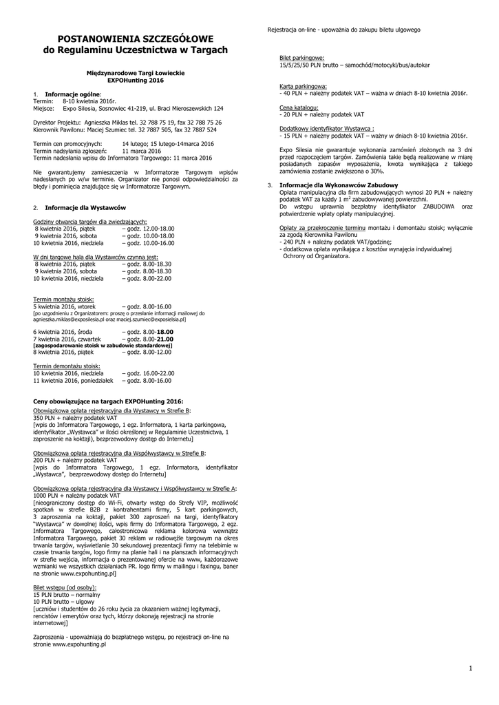 Rejestracja on-line - upoważnia do zakupu biletu ulgowego POSTANOWIENIA SZCZEGÓŁOWE do Regulaminu Uczestnictwa w Targach Bilet parkingowe: 15/5/25/50 PLN brutto – samochód/motocykl/bus/autokar Międzynarodowe Targi Łowieckie EXPOHunting 2016 Karta parkingowa: - 40 PLN + należny podatek VAT – ważna w dniach 8-10 kwietnia 2016r. 1. Informacje ogólne: Termin: 8-10 kwietnia 2016r. Miejsce: Expo Silesia, Sosnowiec 41-219, ul. Braci Mieroszewskich 124 Cena katalogu: - 20 PLN + należny podatek VAT Dyrektor Projektu: Agnieszka Miklas tel. 32 788 75 19, fax 32 788 75 26 Kierownik Pawilonu: Maciej Szumiec tel. 32 7887 505, fax 32 7887 524 Dodatkowy identyfikator Wystawca : - 15 PLN + należny podatek VAT – ważny w dniach 8-10 kwietnia 2016r. Termin cen promocyjnych: 14 lutego; 15 lutego-14marca 2016 Termin nadsyłania zgłoszeń: 11 marca 2016 Termin nadesłania wpisu do Informatora Targowego: 11 marca 2016 Nie gwarantujemy zamieszczenia w Informatorze Targowym wpisów nadesłanych po w/w terminie. Organizator nie ponosi odpowiedzialności za błędy i pominięcia znajdujące się w Informatorze Targowym. 2. Informacje dla Wystawców Godziny otwarcia targów dla zwiedzających: 8 kwietnia 2016, piątek – godz. 12.00-18.00 9 kwietnia 2016, sobota – godz. 10.00-18.00 10 kwietnia 2016, niedziela – godz. 10.00-16.00 W dni targowe hala dla Wystawców 8 kwietnia 2016, piątek – 9 kwietnia 2016, sobota – 10 kwietnia 2016, niedziela – czynna jest: godz. 8.00-18.30 godz. 8.00-18.30 godz. 8.00-22.00 Termin montażu stoisk: 5 kwietnia 2016, wtorek – godz. 8.00-16.00 6 kwietnia 2016, środa 7 kwietnia 2016, czwartek – godz. 8.00-18.00 – godz. 8.00-21.00 8 kwietnia 2016, piątek – godz. 8.00-12.00 Termin demontażu stoisk: 10 kwietnia 2016, niedziela 11 kwietnia 2016, poniedziałek – godz. 16.00-22.00 – godz. 8.00-16.00 Expo Silesia nie gwarantuje wykonania zamówień złożonych na 3 dni przed rozpoczęciem targów. Zamówienia takie będą realizowane w miarę posiadanych zapasów wyposażenia, kwota wynikająca z takiego zamówienia zostanie zwiększona o 30%. 3. Informacje dla Wykonawców Zabudowy Opłata manipulacyjna dla firm zabudowujących wynosi 20 PLN + należny podatek VAT za każdy 1 m2 zabudowywanej powierzchni. Do wstępu uprawnia bezpłatny identyfikator ZABUDOWA oraz potwierdzenie wpłaty opłaty manipulacyjnej. Opłaty za przekroczenie terminu montażu i demontażu stoisk; wyłącznie za zgodą Kierownika Pawilonu - 240 PLN + należny podatek VAT/godzinę; - dodatkowa opłata wynikająca z kosztów wynajęcia indywidualnej Ochrony od Organizatora. [po uzgodnieniu z Organizatorem: proszę o przesłanie informacji mailowej do [email protected] oraz [email protected]] [zagospodarowanie stoisk w zabudowie standardowej] Ceny obowiązujące na targach EXPOHunting 2016: Obowiązkowa opłata rejestracyjna dla Wystawcy w Strefie B: 350 PLN + należny podatek VAT [wpis do Informatora Targowego, 1 egz. Informatora, 1 karta parkingowa, identyfikator „Wystawca” w ilości określonej w Regulaminie Uczestnictwa, 1 zaproszenie na koktajl), bezprzewodowy dostęp do Internetu] Obowiązkowa opłata rejestracyjna dla Współwystawcy w Strefie B: 200 PLN + należny podatek VAT [wpis do Informatora Targowego, 1 egz. Informatora, identyfikator „Wystawca”, bezprzewodowy dostęp do Internetu] Obowiązkowa opłata rejestracyjna dla Wystawcy i Współwystawcy w Strefie A: 1000 PLN + należny podatek VAT [nieograniczony dostęp do Wi-Fi, otwarty wstęp do Strefy VIP, możliwość spotkań w strefie B2B z kontrahentami firmy, 5 kart parkingowych, 3 zaproszenia na koktajl, pakiet 300 zaproszeń na targi, identyfikatory “Wystawca” w dowolnej ilości, wpis firmy do Informatora Targowego, 2 egz. Informatora Targowego, całostronicowa reklama kolorowa wewnątrz Informatora Targowego, pakiet 30 reklam w radiowęźle targowym na okres trwania targów, wyświetlanie 30 sekundowej prezentacji firmy na telebimie w czasie trwania targów, logo firmy na planie hali i na planszach informacyjnych w strefie wejścia, informacja o prezentowanej ofercie na www, każdorazowe wzmianki we wszystkich działaniach PR. logo firmy w mailingu i faxingu, baner na stronie www.expohunting.pl] Bilet wstępu (od osoby): 15 PLN brutto – normalny 10 PLN brutto – ulgowy [uczniów i studentów do 26 roku życia za okazaniem ważnej legitymacji, rencistów i emerytów oraz tych, którzy dokonają rejestracji na stronie internetowej] Zaproszenia - upoważniają do bezpłatnego wstępu, po rejestracji on-line na stronie www.expohunting.pl 1