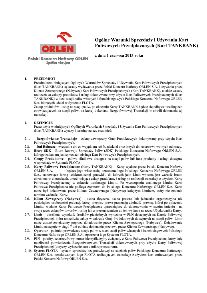 Ogólne Warunki Sprzedaży i Używania Kart Paliwowych Przedpłaconych (Kart TANKBANK) z dnia 1 czerwca 2013 roku 1. PRZEDMIOT Przedmiotem niniejszych Ogólnych Warunków Sprzedaży i Używania Kart Paliwowych Przedpłaconych (Kart TANKBANK) są zasady wydawania przez Polski Koncern Naftowy ORLEN S.A. i używania przez Klienta Zewnętrznego (Nabywcę) Kart Paliwowych Przedpłaconych (Kart TANKBANK), a także zasady rozliczeń za zakupy produktów i usług dokonywane przy użyciu Kart Paliwowych Przedpłaconych (Kart TANKBANK) w sieci stacji paliw własnych i franchisingowych Polskiego Koncernu Naftowego ORLEN S.A. biorących udział w Systemie FLOTA. Zakup produktów i usług na stacji paliw, po okazaniu Karty TANKBANK będzie się odbywał według cen obowiązujących na stacji paliw, na której dokonano Bezgotówkowej Transakcji w chwili dokonania tej transakcji. 2. DEFINICJE Przez użyte w niniejszych Ogólnych Warunkach Sprzedaży i Używania Kart Paliwowych Przedpłaconych (Kart TANKBANK) wyrazy i terminy należy rozumieć: 2.1. Bezgotówkowe Transakcje – zakup zewnętrzny Grup Produktowych dokonywany przy użyciu Kart Paliwowych Przedpłaconych. 2.2. Dni Robocze - wszystkie dni za wyjątkiem sobót, niedziel oraz innych dni ustawowo wolnych od pracy. 2.3. Biuro SDK - Biuro Rozwoju Sprzedaży Paliw (SDK) Polskiego Koncernu Naftowego ORLEN S.A., którego zadaniem jest sprzedaż i obsługa Kart Paliwowych Przedpłaconych. 2.4. Grupy Produktowe – paliwa silnikowe dostępne na stacji paliw lub inne produkty i usługi dostępne w sprzedaży w Systemie FLOTA. 2.5. Karty Paliwowe Przedpłacone (Karty TANKBANK) – Karty wydane przez Polski Koncern Naftowy ORLEN S.A. i będące jego własnością oznaczone logo Polskiego Koncernu Naftowego ORLEN S.A., stanowiące formę „elektronicznej gotówki”, do których jako Limit wpisana jest wartość brutto określona w złotówkach, umożliwiająca zakup produktów i usług po realizacji transakcji z użyciem Karty Paliwowej Przedpłaconej w zakresie ustalonego Limitu. Po wyczerpaniu ustalonego Limitu Karta Paliwowa Przedpłacona nie podlega zwrotowi do Polskiego Koncernu Naftowego ORLEN S.A. Karta może być doładowana przez Klienta Zewnętrznego (Nabywcę) kolejnym Limitem, który nie zmienia terminu ważności Karty. 2.6. Klient Zewnętrzny (Nabywca) - osoba fizyczna, osoba prawna lub jednostka organizacyjna nie posiadająca osobowości prawnej, której przepisy prawa przyznają zdolność prawną, której po opłaceniu Limitu, wydano Karty Paliwowe Przedpłacone uprawniające do dokonywania w swoim imieniu i na swoją rzecz zakupów towarów i usług lub z przeznaczeniem do ich wydania na rzecz Użytkownika Karty. 2.7. Limit – określona wysokość środków pieniężnych wyrażona w PLN dostępnych na Karcie Paliwowej Przedpłaconej, która umożliwia zakup w zakresie Grup Produktowych dostępnych na stacji paliw. Limit może zostać zwiększony poprzez doładowanie przez Klienta Zewnętrznego (Nabywcę). Doładowanie Limitu następuje w ciągu 7 dni od daty dokonania przelewu przez Klienta Zewnętrznego (Nabywcę). 2.8. Operator - podmiot prowadzący stację paliw w sieci stacji paliw własnych i franchisingowych Polskiego Koncernu Naftowego ORLEN S.A., opatrzoną logo Systemu FLOTA. 2.9. PIN - poufny, czterocyfrowy numer identyfikacyjny związany z Kartą Paliwową Przedpłaconą, który daje możliwość potwierdzenia Bezgotówkowych Transakcji dokonywanych przy użyciu Karty Paliwowej Przedpłaconej (dotyczy wyłącznie kart z mikroprocesorem). 2.10. System FLOTA - system sprzedaży bezgotówkowej na stacjach paliw Polskiego Koncernu Naftowego ORLEN S.A. oznakowanych logo FLOTA realizujących transakcje z użyciem kart emitowanych przez Polski Koncern Naftowy ORLEN S.A. 2.11. Terminal - zestaw składający się z terminala transmisyjnego, Pinpada i drukarki, będący własnością Polskiego Koncernu Naftowego ORLEN S.A. lub inny zestaw techniczny o odpowiedniej funkcjonalności. 2.12. Użytkownik Karty – Klient Zewnętrzny (Nabywca) lub osoba, która otrzymała od Klienta Zewnętrznego (Nabywcy) Kartę Paliwową Przedpłaconą, uprawniającą do dokonywania operacji określonych w niniejszych Ogólnych Warunkach Sprzedaży i Używania Kart Paliwowych Przedpłaconych (Kart TANKBANK). 2.13. Wydruk z Terminala – dokument potwierdzający przeprowadzenie Bezgotówkowej Transakcji zawierający datę transakcji, numer karty, numer stacji, Grupę Produktową, ilość zakupionych produktów i usług oraz wartość brutto pobraną z Karty Paliwowej Przedpłaconej. 3. WARUNKI WYDANIA KART PALIWOWYCH PRZEDPŁACONYCH 3.1. Karty Paliwowe Przedpłacone wydawane będą na podstawie zamówienia złożonego i odpowiednio wypełnionego przez Klienta Zewnętrznego (Nabywcę). 3.2. Klient Zewnętrzny (Nabywca) prowadzący działalność gospodarczą w zamówieniu złoży oświadczenie o przeznaczeniu Kart na rzecz osób trzecich. Klient Zewnętrzny (Nabywca) poinformuje Użytkowników Kart o zasadach posługiwania się Kartami Paliwowymi Przedpłaconymi, które zawarte są w niniejszych Ogólnych Warunkach Sprzedaży i Używania Kart Paliwowych Przedpłaconych (Kart TANKBANK). 3.3. Wydanie Kart Paliwowych Przedpłaconych nastąpi po dokonaniu przez Klienta Zewnętrznego (Nabywcę) wpłaty całości kwoty stanowiącej wartość Limitu na podstawie stosownej noty obciążeniowej oraz opłaty za wydanie i aktywację Karty na podstawie faktury (jeśli opłata będzie miała zastosowanie). 3.4. W przypadku wydania kilku Kart Paliwowych Przedpłaconych wystawiona będzie jedna faktura za wydanie i aktywację samych Kart Paliwowych Przedpłaconych (nośnik) i obejmować będzie cenę będącą iloczynem ceny jednostkowej za wydanie i aktywację jednej Karty Paliwowej Przedpłaconej (nośnik) oraz liczby wydanych Kart. Cena jednostkowa za wydanie i aktywację jednej Karty (nośnik) naliczana będzie na podstawie obowiązującego cennika. Nota obciążen