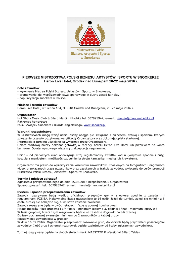 PIERWSZE MISTRZOSTWA POLSKI BIZNESU, ARTYSTÓW I SPORTU W SNOOKERZE Heron Live Hotel, Gródek nad Dunajcem 20-22 maja 2016 r. Cele zawodów - wyłonienie Mistrza Polski Biznesu, Artystów i Sportu w Snookerze; - promowanie idei współzawodnictwa sportowego w duchu zasad fair play; - popularyzacja snookera w Polsce. Miejsce i termin zawodów Heron Live Hotel, w Sienna 104, 33-318 Gródek nad Dunajcem, 20-22 maja 2016 r. Organizator Hot Shots Music Club & Bilard Marcin Nitschke tel. 607925947, e-mail.: [email protected] Patronat honorowy Polski Związek Snookera i Bilarda Angielskiego, www.snooker.pl Warunki uczestnictwa W Mistrzostwach mogą wziąć udział osoby obojga płci związane z biznesem, sztuką i sportem, których zgłoszenie przeszło pozytywną weryfikację Organizatora oraz dokonają opłaty startowej. Informacje o turnieju udzielane są wyłącznie przez Organizatora. Opłatę startową należy dokonać gotówką w recepcji hotelu Heron Live Hotel lub przelewem na konto bankowe. Opłata wpisowego wiąże się z akceptacją regulaminu. Ubiór – od pierwszych rund obowiązuje strój regulaminowy PZSiBA- kod A (wizytowe spodnie i buty, koszula z mankietem, możliwość uzupełnienia stroju kamizelką, muchą lub krawatem). Organizator ma prawo do wykorzystania wizerunku zawodników utrwalonych na fotografiach i nagraniach video, przekazanych przez uczestników oraz uzyskanych w trakcie zawodów, wyłącznie do celów promocji Mistrzostw Polski Biznesu, Artystów i Sportu w Snookerze. Termin i miejsce zgłoszeń Zgłoszenia przyjmowane będą do dnia 15.05.2016 bezpośrednio u Organizatora Sposób zgłoszeń: tel. 607925947, e-mail.: [email protected] System i sposób przeprowadzenia zawodów Zawody rozgrywane będą według oficjalnych przepisów gry w snookera zgodnie z zasadami i regulaminami PZSiBA. Maksymalna liczba uczestników to 16 osób. Jeżeli do turnieju zgłosi się mniej niż 6 osób, turniej nie odbędzie się, a wpisowe zostanie zwrócone. Zawody rozegrane będą w dwóch etapach: fazie grupowej i pucharowej. Modus meczów: faza grupowa i 1/4 finału - minimum lepszy z 3, półfinał i finał - minimum lepszy z 5 W fazie grupowej trzeci frejm rozgrywany będzie na zasadzie dogrywki na bili czarnej. Do fazy pucharowej awansuje minimum po 2 zawodników z każdej grupy. Rozstawienie zawodników w grupach: W dniu 16.05.2016r. Organizator przeprowadzi losowanie grup, do których będą przydzieleni poszczególni zawodnicy. Ilość grup i schemat rozgrywek będzie uzależniony od liczby zgłoszonych zawodników. Turniej rozgrywany będzie na dwóch stołach marki MAESTATO Professional Billard Tables Kryteria ustalania kolejności zawodników w grupach: a/ wygrane mecze; b/ bilans frejmów; c/ bezpośredni pojedynek; d/ dogrywka na bili czarnej. Kryteria ustalenia kolejności rankingu turniejowego zawodników po grach grupowych a/ miejsc w grupie; b/ mecze nie przegrane; c/ średnia BF/MR; d/ losowanie Szczegółowe informacje nt. systemu rozgrywek zostaną przekazane podczas odprawy dla zawodników. Sędziowanie: Organizator zapewnia sędziów licencjonowanych PZSiBA we wszystkich meczach Nagrody i tytuły W zawodach nie ma nagród finansowych. Zawodnicy otrzymują puchary za miejsca 1-4 i najwyższy brejk. Zwycięzca uzyskuje tytuł Mistrza Polski Biznesu, Artystów i Sportu w Snookerze. Nagrody rzeczowe przewidziane są dla miejsc 1-4. Podział innych nagród, także rzeczowych, pozostaje w gestii Organizatora. Koszty udziału w zawodach Opłata startowa wynosi: 1000 zł (jeden tysiąc złotych). Uczestnicy we własnym zakresie pokrywają koszty dojazdu, zakwaterowania i wyżywienia. Koszt biletu wejściowego dla publiczności (osób nie mieszkających w hotelu) wynosi 350 zł brutto (w/w opłata nie uwzględnia żadnych innych usług gastronomiczno-hotelarskich). Osoby mieszkające w hotelu otrzymują bilet wejściowy bezpłatnie w cenie pobytu weekendowego pod warunkiem, że wykupiły pełny pakiet pobytowy w dniach 20-22.05.2016 r. Postanowienia końcowe Niniejszy Regulamin może być uzupełniony o inne informacje dotyczące zawodów. PROGRAM ZAWODÓW piątek 20.05.2016 r. 13:30 odprawa zawodników 13:45 oficjalne rozpoczęcie Mistrzostw Polski 14:00 – 21:00 mecze zawodników sobota 21.05.2016 r. 10:00- 20:00 mecze zawodników niedziela 22.05.2016 r. 10:00 – 12:30 Półfinały Mistrzostw Polski 13:00 – 15:00 Finał Mistrzostw Polski 16:00 - zakończenie Mistrzostw Polski i wręczenie nagród Organizator Marcin Nitschke
