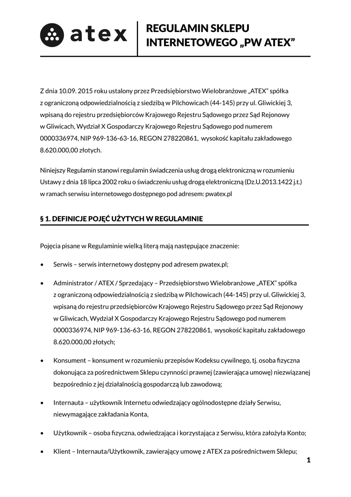 a tex REGULAMIN SKLEPU INTERNETOWEGO „PW ATEX” Z dnia 10.09. 2015 roku ustalony przez Przedsiębiorstwo Wielobranżowe „ATEX” spółka z ograniczoną odpowiedzialnością z siedzibą w Pilchowicach (44-145) przy ul. Gliwickiej 3, wpisaną do rejestru przedsiębiorców Krajowego Rejestru Sądowego przez Sąd Rejonowy w Gliwicach, Wydział X Gospodarczy Krajowego Rejestru Sądowego pod numerem 0000336974, NIP 969-136-63-16, REGON 278220861, wysokość kapitału zakładowego 8.620.000,00 złotych. Niniejszy Regulamin stanowi regulamin świadczenia usług drogą elektroniczną w rozumieniu Ustawy z dnia 18 lipca 2002 roku o świadczeniu usług drogą elektroniczną (Dz.U.2013.1422 j.t.) w ramach serwisu internetowego dostępnego pod adresem: pwatex.pl § 1. DEFINICJE POJĘĆ UŻYTYCH W REGULAMINIE Pojęcia pisane w Regulaminie wielką literą mają następujące znaczenie: • Serwis – serwis internetowy dostępny pod adresem pwatex.pl; • Administrator / ATEX / Sprzedający – Przedsiębiorstwo Wielobranżowe „ATEX” spółka z ograniczoną odpowiedzialnością z siedzibą w Pilchowicach (44-145) przy ul. Gliwickiej 3, wpisaną do rejestru przedsiębiorców Krajowego Rejestru Sądowego przez Sąd Rejonowy w Gliwicach, Wydział X Gospodarczy Krajowego Rejestru Sądowego pod numerem 0000336974, NIP 969-136-63-16, REGON 278220861, wysokość kapitału zakładowego 8.620.000,00 złotych; • Konsument – konsument w rozumieniu przepisów Kodeksu cywilnego, tj. osoba fizyczna dokonująca za pośrednictwem Sklepu czynności prawnej (zawierająca umowę) niezwiązanej bezpośrednio z jej działalnością gospodarczą lub zawodową; • Internauta – użytkownik Internetu odwiedzający ogólnodostępne działy Serwisu, niewymagające zakładania Konta, • Użytkownik – osoba fizyczna, odwiedzająca i korzystająca z Serwisu, która założyła Konto; • Klient – Internauta/Użytkownik, zawierający umowę z ATEX za pośrednictwem Sklepu; 1 • Konto – wydzielona przestrzeń w ramach Serwisu, przypisana dla danego Użytkownika, na której ten zamieszcza swoje dane pozwalające zidentyfikować Użytkownika, zabezpieczona loginem i hasłem; • Sklep – dział Serwisu, dostępny pod adresem pwatex.pl, za pośrednictwem którego Klienci mogą nabywać Towary i Usługi; • Zamówienie – oświadczenie złożone przez Klienta, stanowiące ofertę zawarcia Umowy sprzedaży, określające w szczególności rodzaj i liczbę Towaru. • Towary – rzeczy w rozumieniu Kodeksu cywilnego, będące przedmiotem umowy zawieranej za pośrednictwem działu Sklep w Serwisie; • Usługi – usługi, będące przedmiotem umowy zawieranej za pośrednictwem działu Sklep w Serwisie; • Regulamin – niniejszy Regulamin Serwisu i Sklepu „PW ATEX”. § 2. ZAKRES ZASTOSOWANIA REGULAMINU Regulamin ma zastosowanie do wszystkich umów zawieranych pomiędzy ATEX, a Użytkownikami za pośrednictwem Serwisu. Za pośrednictwem Sklepu Klienci mogą zawierać umowy w przedmiocie nabywania Towarów oraz Usług, na zasadach określonych w § 7 Regulaminu. § 3. WYMAGANIA TECHNICZNE Aby skorzystać z Serwisu niezbędne jest spełnienie następujących warunków technicznych: • komputer typu PC, smartfon; • dostęp do Internetu; • zainstalowana przeglądarka internetowa Microsoft Internet Explorer w wersji 9.0 lub nowszej, Mozilla Firefox w wersji 3.0 lub nowszej, Opera w wersji 20.0 lub nowszej albo Google Chrome 30.0 lub nowszej; • Acrobat Reader – lub inny program umożliwiający otwierania plików PDF; 2 • włączona obsługa plików cookies. • posiadanie łącza o prędkości co najmniej 2 Mbps. W ramach Serwisu wykorzystywane są pliki cookies, które zapisywane są w systemie teleinformatycznym Internauty. Pliki te wykorzystywane są w celach technicznych do poprawnego działania Serwisu. Szczegóły związane z wykorzystywaniem plików Cookies zostały określone w Polityce prywatności dostępnej na stronie http://www.pwatex.pl/pl/i/Polityka-Cookies/13 § 4. POSTANOWIENIA OGÓLNE Warunkiem złożenia Zamówienia w Sklepie przez Klienta jest zapoznanie się z niniejszym Regulaminem i akceptację jego postanowień podczas składania Zamówienia. Nieznajomość Regulaminu nie zwalnia Klienta ze stosowania zawartych w nim zasad. Podczas składania zamówień w Sklepie Klient potwierdza fakt zapoznania się z niniejszym Regulaminem i potwierdza, że akceptuje go w obowiązującej w dniu składania zamówienia formie. Za pośrednictwem Sklepu ATEX prowadzi sprzedaż detaliczną i hurtową Towarów za pośrednictwem sieci Internetowej. Wszystkie Towary oferowane w sklepie odpowiadają podanym parametrom jakościowym, są oryginalne zapakowane, wolne od wad fizycznych i prawnych, oraz zostały legalnie wprowadzone na rynek polski. Dostęp do ogólnodostępnych działów Serwisu jest możliwy dla Internautów na zasadach określonych w Regulaminie, przez całą dobę, siedem dni w tygodniu, z wyjątkiem: • okresów wynikających z ograniczeń w dostępie narzuconych przez operatorów sieci, z których korzysta Internauta; • okresów awarii, w tym będących skutkiem działań lub zaniechań osób trzecich; • okresów konserwacji sprzętu i oprogramowania. § 5. REJESTRACJA 3 Internauta może założyć Konto poprzez dokonanie rejestracji: • Rejestracja odbywa się za pomocą Formularza Rejestracyjnego i aktywacji konta drogą korespondencji elektronicznej, poprzez kliknięcie w link znajdujący się w wysłanej wiadomości elektronicznej. • Dokonanie rejestracji i utworzenie Konta jest całkowicie dobrowolne i nie zobowiązuje Użytkownika do dokonania zakupów w Sklepie. • Dokonanie rejestracji i założenie Konta oznacza zaakceptowanie przez Użytkownika postanowień Regulaminu (Użytkownik zobowiązany jest do zaznaczenia treści oświadczenia w tym zakresie) oraz wyrażenie zgody na przetwarzanie danych osobowych przez Administratora (Użytkownik zobowiązany jest do zaznacz