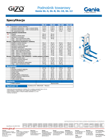 Podnośnik towarowy Genie GL-4, GL-8, GL-10, GL-12 Specyfikacja GL-4 Wysokość w pozycji złożonej 1 2 3 1.72 m Wysokość podnoszenia – widły w pozycji dolnej 1.26 m Wysokość podnoszenia – widły w pozycji górnej 1.80 m Min. opuszczenie wideł 9 cm Wersja podstawa standardowa B Długość 30 cm Długość w pozycji pracy 88 cm C Szerokość na zewnętrz 63 cm Waga - opcje standardowe kółka 51 kg Waga - opcje kółka pneumatyczne Wersja z regulowaną szerokością podstawy Długość w pozycji złożonej 49 cm Długość w pozycji pracy 1.09 m Szerokość w pozycji złożonej4 73 cm Szerokość maksymalna4 1.10 m Szerokość wewnętrzna maksymalna 91 cm Waga - opcje standardowe kółka 57 kg Waga - opcje kółka pneumatyczne 59 kg Waga – opcje A: 4-punktowe kółka 62 kg Waga – opcje B: 4-punktowe kółka 63 kg Wersja z przeciwwagą z tyłu podstawy – krótkie podpory przednie Długość w pozycji pracy 72 cm Szerokość w pozycji złożonej4 73 cm Szerokość maksymalna4 1.10 m Szerokość wewnętrzna maksymalna 91 cm Waga - opcje standardowe kółka 178 kg A GL-8 GL-10 GL-12 1.72 m 2.50 m 3.06 m 9 cm 2.00 m 3.01 m 3.56 m 5 cm 2.31 m 3.66 m 4.20 m 5 cm 30 cm 88 cm 63 cm 60 kg - - 49 cm 1.09 m 73 cm 1.10 m 91 cm 66 kg 68 kg 72 kg 73 kg 49 cm 1.09 m 73 cm 1.10 m 91 cm 68 kg 69 kg 73 kg 75 kg 49 cm 1.09 m 73 cm 1.10 m 91 cm 70 kg 72 kg 76 kg 77 kg 72 cm 73 cm 1.10 m 91 cm 186 kg 72 cm 73 cm 1.10 m 91 cm 196 kg - 181 kg 9 cm 2 cm 57 cm 52 cm 58 cm 56 cm 51 cm 34/48 cm 159 kg 9 cm 2 cm 57 cm 52 cm 58 cm 56 cm 51 cm 34/48 cm 159 kg 9 cm 2 cm 57 cm 52 cm 58 cm 56 cm 51 cm 34/48 cm Wydajność Udźwig Minimalna wysokość załadunku Prześwit pod podstawą 1 2 3 Długość wideł Szerokość wideł Długość platformy załadunkowej Szerokość platformy załadunkowej Długość wysięgnika Punkty zaczepu ładunku 227 kg 9 cm 2 cm 57 cm 52 cm 58 cm 56 cm 51 cm 34/48 cm Zasilanie Źródło zasilania Zgodność CE 1 2 3 4 Ręczna korba Dyrektywa EU: 2006/42/EC - Maszyny opcja tylne koło pneumatyczne o średnicy 25 cm zwiększy szerokość koła o 2,5 cm opcja podstawy z przeciwwagą z tyłu zwiększy jej szerokość o 2,5 cm opcja 4-punktowe kółka w wersji B zwiększy szerokość o 2, 5 cm wymiary zewnętrzne Specyfikacja z dnia 08.07.2015 Podnośnik towarowy Genie GL-4, GL-8, GL-10, GL-12 Charakterystyka Standardowe wyposażenie Opcje dodatkowe GL - 4 - Platforma załadunkowa - - Wysięgnik Podstawa standardowa (tylko w GL-4, GL-8) Wersja z regulowaną szerokością podstawy - Wersja z przeciwwagą z tyłu podstawy (tylko w GL-4, GL-8, GL-10) GL - 10 - - Aluminiowa drabina (tylko w wersjach standardowej podstawy i z regulowaną szerokością podstawy) - Pneumatyczne tylne kołka (tylko w wersjach standardowej podstawy i z regulowaną szerokością podstawy) Nożne zwolnienie hamulca (tylko w wersji z regulowaną szerokością podstawy) 1.80 m wysokość podnoszenia 227 kg udźwig GL - 8 - 3.06 m wysokość podnoszenia 181 kg udźwig 3.06 m wysokość podnoszenia 181 kg udźwig GL - 12 - 4.20 m wysokość podnoszenia 159 kg udźwig - Platforma - - - Standardowa platforma Wyposażenie - - - Kompaktowe wymiary Lekka wytrzymała aluminiowa konstrukcja Wytrzymałe standardowe stalowe widły 20 cm tylne koła niebrudzące i 5 cm przednie obrotowe dwukierunkowe kółka (tylko w wersjach standardowej podstawy i z regulowaną szerokością podstawy) 12 cm tylne kółka z hamulcami i 10 cm nieobrotowe przednie kółka (tylko w wersji z przeciwwagą z tyłu podstawy) Łatwy do załadunki i transportu Blokada mechanizmu podnoszenia - zabezpieczenie w transporcie maszyny Wzmocniona wciągarka ręczna Specjalna korba ręczna przy korzystaniu z opcji aluminiowej drabiny Wersja standardowej podstawy i z regulowaną szerokością podstawy - 20 cm tylne niebrudzące kółka - Pneumatyczne tylne kołka - 5 cm nieobrotowe przednie kółka Wersja z przeciwwagą z tyłu podstawy - 12 cm nieobrotowe tylne kółka z hamulcami - 10 cm nieobrotowe przednie kółka - opcje A: 4-punktowe kółka: 10 cm tylne obrotowe kółka, 5 cm przednie obrotowe kołka - opcje B: 4-punktowe kółka: 12 cm tylne obrotowe kółka, 6,5 cm przednie obrotowe kołka