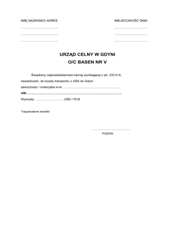 IMIĘ NAZWISKO ADRES MIEJSCOWOŚĆ DNIA …………………………….. …………………………. …………………………….. …………………………. …………………………….. …………………………. URZĄD CELNY W GDYNI O/C BASEN NR V Świadomy odpowiedzialności karnej wynikającej z art. 233 K.K, oświadczam, że koszty transportu z USA do Gdyni samochodu / motocykla m-ki ……………………………………………… VIN ……………………………………………………………………………. Wyniosły: …………………….. USD / PLN *niepotrzebne skreślić …………………………………. PODPIS