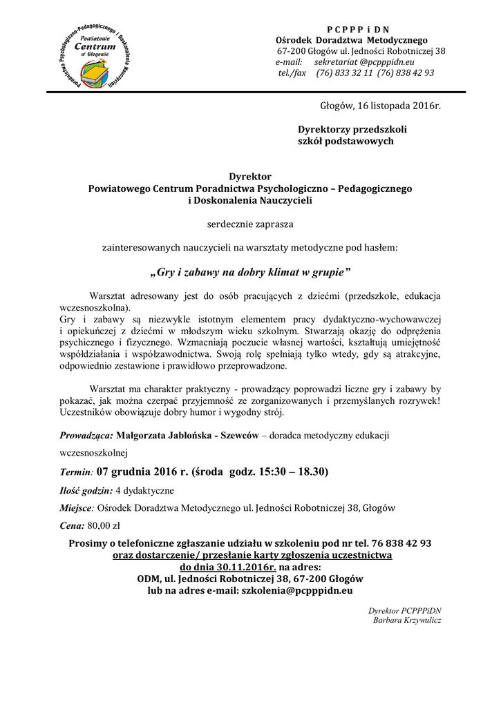 PCPPP i DN Ośrodek Doradztwa Metodycznego 67-200 Głogów ul. Jedności Robotniczej 38 e-mail: sekretariat @pcpppidn.eu tel./fax (76) 833 32 11 (76) 838 42 93 Głogów, 16 listopada 2016r. Dyrektorzy przedszkoli szkół podstawowych Dyrektor Powiatowego Centrum Poradnictwa Psychologiczno – Pedagogicznego i Doskonalenia Nauczycieli serdecznie zaprasza zainteresowanych nauczycieli na warsztaty metodyczne pod hasłem: „Gry i zabawy na dobry klimat w grupie” Warsztat adresowany jest do osób pracujących z dziećmi (przedszkole, edukacja wczesnoszkolna). Gry i zabawy są niezwykle istotnym elementem pracy dydaktyczno-wychowawczej i opiekuńczej z dziećmi w młodszym wieku szkolnym. Stwarzają okazję do odprężenia psychicznego i fizycznego. Wzmacniają poczucie własnej wartości, kształtują umiejętność współdziałania i współzawodnictwa. Swoją rolę spełniają tylko wtedy, gdy są atrakcyjne, odpowiednio zestawione i prawidłowo przeprowadzone. Warsztat ma charakter praktyczny - prowadzący poprowadzi liczne gry i zabawy by pokazać, jak można czerpać przyjemność ze zorganizowanych i przemyślanych rozrywek! Uczestników obowiązuje dobry humor i wygodny strój. Prowadząca: Małgorzata Jabłońska - Szewców – doradca metodyczny edukacji wczesnoszkolnej Termin: 07 grudnia 2016 r. (środa godz. 15:30 – 18.30) Ilość godzin: 4 dydaktyczne Miejsce: Ośrodek Doradztwa Metodycznego ul. Jedności Robotniczej 38, Głogów Cena: 80,00 zł Prosimy o telefoniczne zgłaszanie udziału w szkoleniu pod nr tel. 76 838 42 93 oraz dostarczenie/ przesłanie karty zgłoszenia uczestnictwa do dnia 30.11.2016r. na adres: ODM, ul. Jedności Robotniczej 38, 67-200 Głogów lub na adres e-mail: [email protected] Dyrektor PCPPPiDN Barbara Krzywulicz