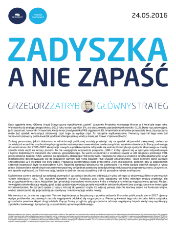 24.05.2016 Dwa tygodnie temu Główny Urząd Statystyczny opublikował „szybki” szacunek Produktu Krajowego Brutto w I kwartale tego roku. W stosunku do analogicznego okresu 2015 roku wzrost wyniósł 3%, a w stosunku do poprzedniego kwartału -0,1%. Dane rozczarowujące, jeśli popatrzeć na wyniki IV kwartału, kiedy to roczna dynamika PKB sięgnęła 4,3%. W opiniach analityków przeważała teza, że przyczyną może być spadek konsumpcji zbiorowej, czyli tego co wydaje rząd. To rozsądne wytłumaczenie. Pierwszy kwartał tego roku był to bowiem pierwszy pełen kwartał, podczas którego pełnię władzy miało już Prawo i Sprawiedliwość. Zmiany personalne, jakich dokonano w administracji publicznej musiały przełożyć się na spadek aktywności zakupowej, zwłaszcza że wiele już wcześniej uruchomionych programów zostało przez nowe władze zawieszonych lub zupełnie odwołanych. Biorąc pod uwagę doświadczenia z lat 2005-2007 akceptacja nowych wydatków będzie odbywała się wolniej i kontrybucja spożycia zbiorowego w trwały sposób może zejść na niższy poziom. To nie uwzględnia oczywiście programu „500+”, który ujawni się w spożyciu indywidualnym i będzie dodatkowym impulsem dla wzrostu gospodarczego. Tu warto wspomnieć o ostatniej rewizji w dół prognozy polskiego PKB, jakiej ostatnio dokonał Fitch, właśnie po ogłoszeniu słabszego PKB przez GUS. Prognoza ta sprawia wrażenie czysto adaptacyjnej czyli mechanicznie dostosowującej się do bieżących danych. Nie tylko bowiem PKB wypadł umiarkowanie. Także niektóre dane wyższej częstotliwości w I kwartale nie były dobre. Produkcja przemysłowa rosła przeciętnie 2,9% miesięcznie, podczas gdy w poprzednich czterech kwartałach było to przeciętnie 4,9%. Również sprzedaż detaliczna nie zachwyciła i to mimo bardzo dobrych danych z rynku pracy. Słabsze dane z niektórych obszarów nie powinny być jednak podstawą do radykalnego redukowania prognozy wzrostu. Oczywiście, nie sposób wykluczyć, że Fitch ma rację, będzie to jednak raczej szczęśliwy traf niż porządna robota analityczna. Kwietniowe dane o produkcji sprzedanej przemysłu i sprzedaży detalicznej odbiegają in plus od tego co obserwowaliśmy w pierwszych trzech miesiącach roku. Tak wysokie dynamiki wzrostu funduszu płac jakie oglądamy od kilku miesięcy muszą przełożyć się na przyspieszenie wzrostu. Wyjątkiem jest produkcja budowlano-montażowa, która z miesiąca na miesiąc wygląda coraz gorzej. Ale jest to wyjątek potwierdzający regułę, gdyż za jej spadek odpowiadają przede wszystkim sektory budownictwa zaangażowane w inwestycje infrastrukturalne. To zaś jest spójne z tezą o niższej aktywności rządu. Co więcej, panuje obecnie martwy sezon na fundusze unijne, wobec zakończenia się poprzedniej perspektywy i niemowlęcego wieku nowej. Nie oznacza to, że nie ma zagrożeń. Ten rok będzie jeszcze bezpieczny z punktu widzenia finansów publicznych, ale w 2017 ujemny wpływ problemów budżetowych zacznie negatywnie odciskać się na gospodarce. Pierwszy kwartał tego roku to tylko lekka zadyszka, gospodarka powinna złapać drugi oddech. Kryzys formy przyjdzie, gdy gospodarka odczuje negatywny impuls kredytowy wynikający z podatku bankowego i przydusi ją uszczelnianie systemu podatkowego. Niniejszy dokument jest jedynie materiałem informacyjnym do użytku odbiorcy. Nie powinien być rozumiany jako materiał o charakterze doradczym lub jako podstawa do podejmowania decyzji inwestycyjnych. Nie powinien też być rozumiany jako rekomendacja inwestycyjna. Wszystkie opinie i prognozy przedstawione w tym opracowaniu są jedynie wyrazem opinii autorów w dniu publikacji i mogą ulec zmianie bez zapowiedzi. Skarbiec TFI SA nie ponosi odpowiedzialności za jakiekolwiek decyzje inwestycyjne podjęte na podstawie niniejszego opracowania. Wymagane prawem informacje dotyczące subfunduszy, w tym o czynnikach ryzyka inwestycyjnego znajdują się w prospekcie informacyjnym SKARBIEC FIO i Kluczowych Informacjach dla Klientów, dostępnych w siedzibie SKARBIEC TFI SA w serwisie skarbiec.pl i w sieci sprzedaży. Subfundusze nie gwarantują osiągnięcia określonego celu i wyniku inwestycyjnego, a uczestnik ponosi ryzyko utraty części wpłaconych środków.